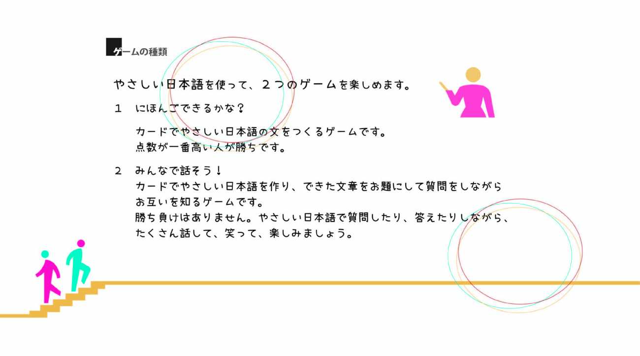 やさしい日本語を使ったカードゲームです。2つの遊び方で楽しむことができます。