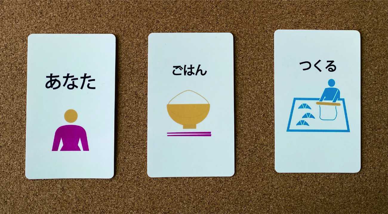 みんなで話そう! ①主語、②目的語、③動詞のカードを選び、日本語の文を作ります。 完成した日本語の文に関係する質問をして、お互いのことを知るゲームです。 あなたはごはんを作りますか、何を作りますかなどの質問をしながら、互いを知ることが目的です。