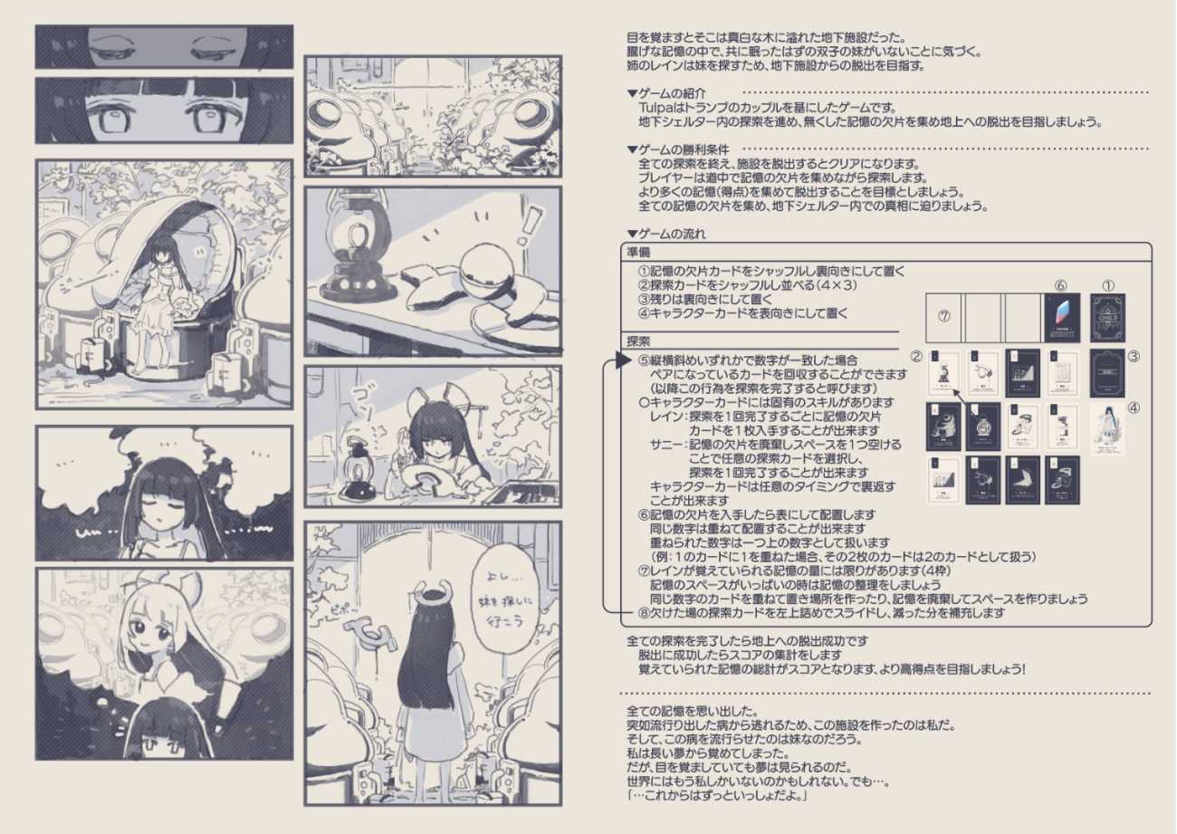 退廃的な世界観に合わせて全体をモノトーンでまとめつつ、メインである姉妹は赤と青をテーマカラーとし色素の薄い世界の中で異彩を放つようにしています。少し不思議な世界観とシンプルなカードゲームを見て、遊んで、楽しんでもらえるとうれしいです。