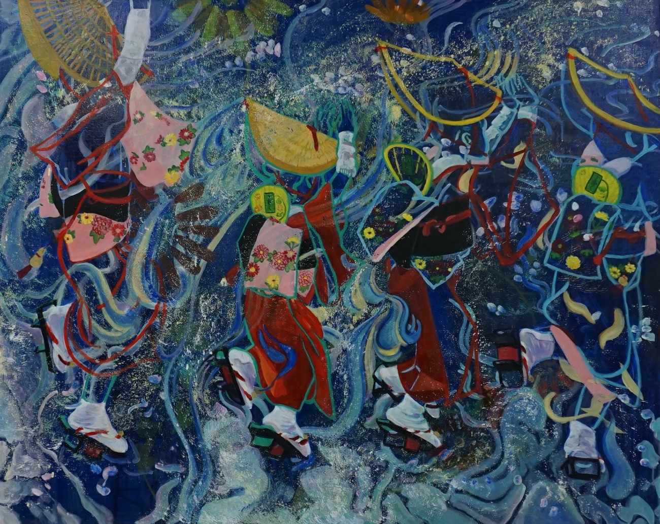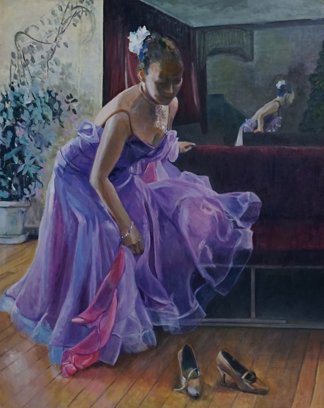 社交ダンスの舞台の合間にリラックスしていた女性が、本番開始に向けて一歩踏み出し靴に目線を向けた時、全身にスタンバイのスイッチが入った。ロシア系のクォーターの彼女は、背中の美しい人だった。何回も彼女を描いたが、まだまだ満足していない。これからも追求して行きたいと思う。