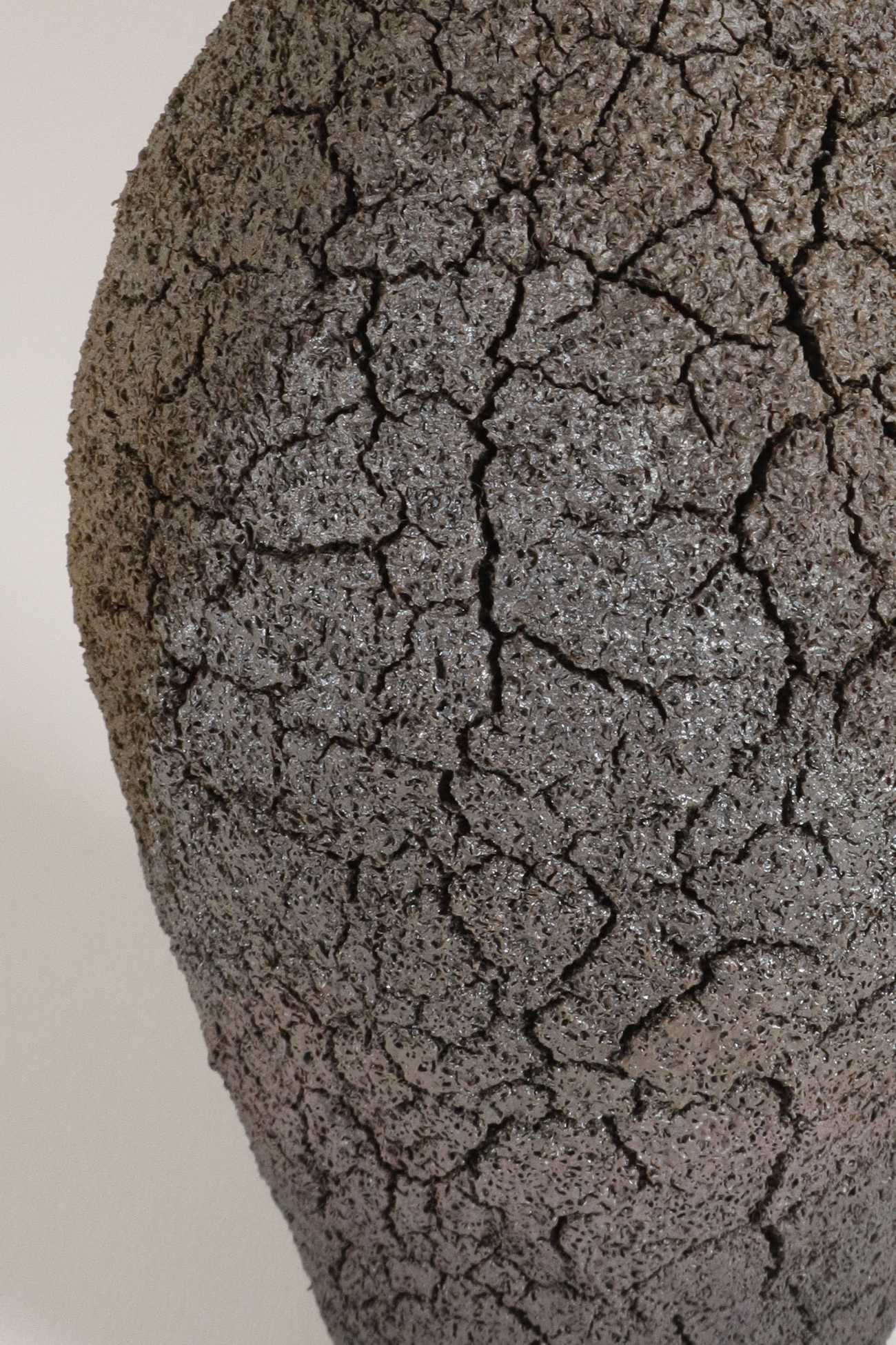 これらから着想を得て、トルソーをモチーフとして手びねり技法を用い、陶土に指が触れる度に「ありがとう」の言葉を込めて成形した。本来なら捨てるはずのコーヒーやお茶の出がらしを陶土に混ぜ、冷却還元と炭化焼成によって土の表情の変容を試みた。