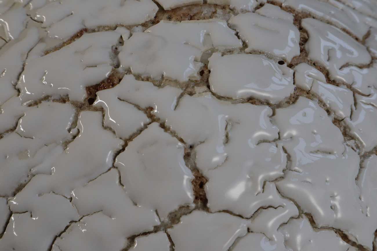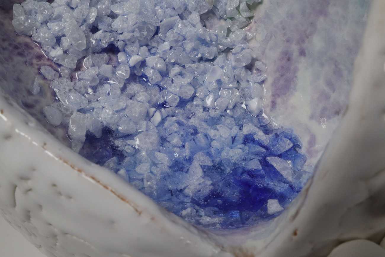 作品にちりばめられた小さな球体は縁の粒。内部には可能性や希望を表現するために水晶を装飾した。表面のヒビの箇所は辛く苦しく思える縁を表現するために、土の種類による収縮の違いを利用し全体的にヒビが入るよう調整。