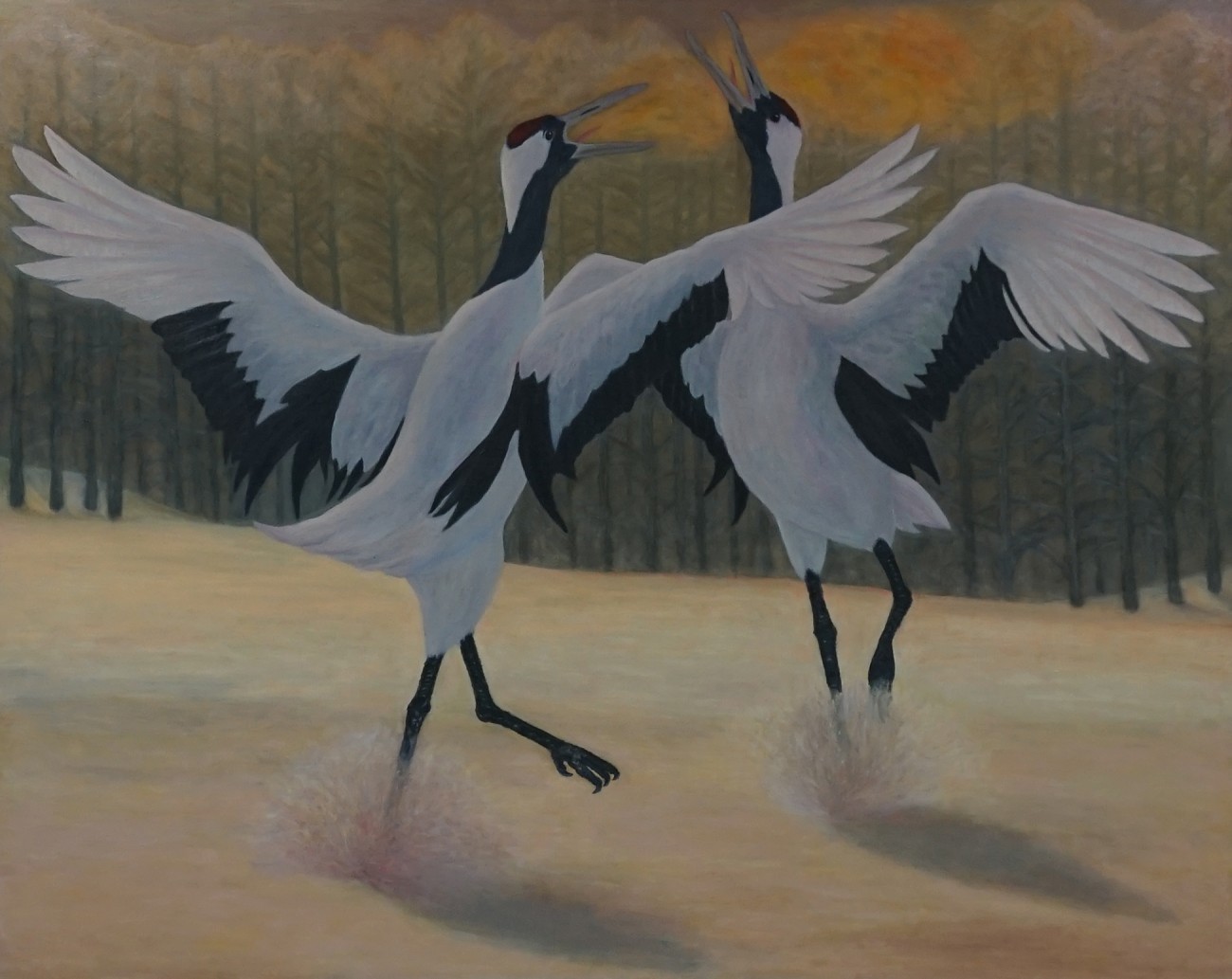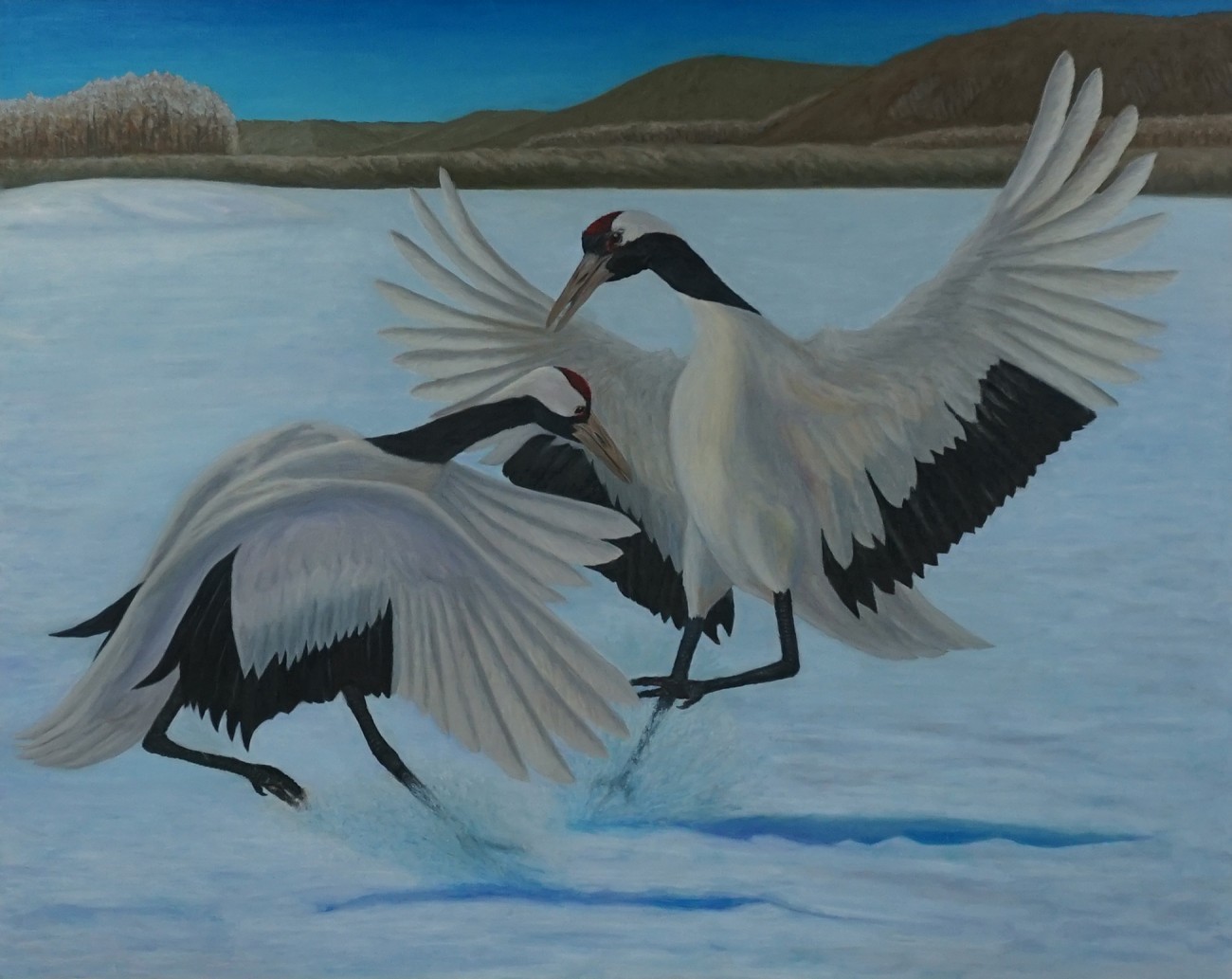 広大な北海道の雪原で、毎冬繰り広げられるタンチョウ鶴のラブダンス。お互いの羽根を大きく広げ思い思いに踊る姿に、今この時を生きている喜びの気持ちが感じられた。ただ素直に絵筆をはしらせたが、少しでも生命感や躍動感のようなもの伝われば本望である。