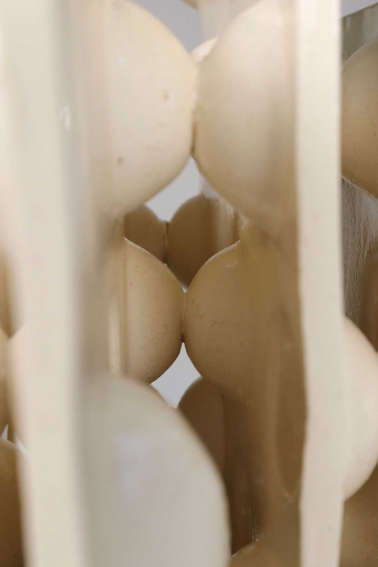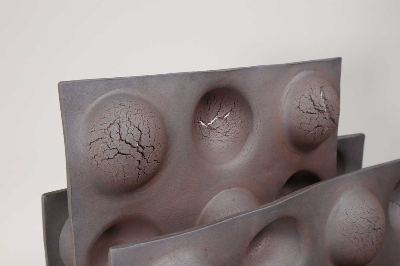 タタラ板に何かを押し付け凹凸を付けると空間という意識が生まれる。そして何かを押し付けた凹凸は内側から外側へと何かが生まれ出るという感覚を私に持たせます。私はそのタタラ板に球体を押し付けることで生まれる曲面で泡のような形態を表現しました。
