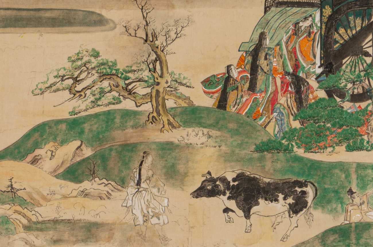 この物語は日本版"シンデレラ" "白雪姫" の様なお話です。模写した2つの場面は、嵯峨野に遊びに来た主人公・姫君一行と野辺に佇む牛と牛飼いの描かれたのどかな風景と、もう一人の主人公・馬上の少将が春霞の中進む凛々しき姿です。苦労した点は、細かい描写の部分の上げ写しと絵の具を焼いての色の再現です。
