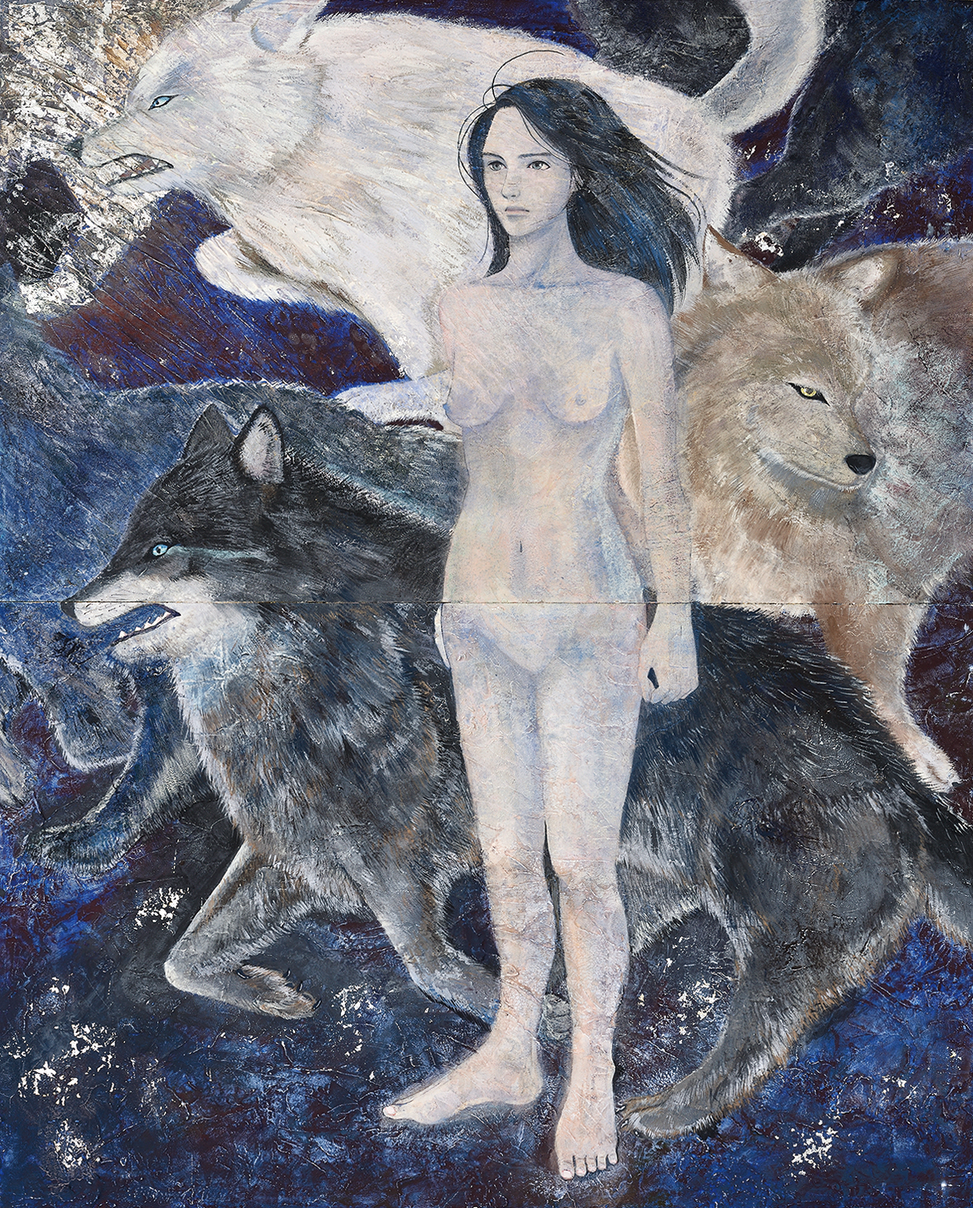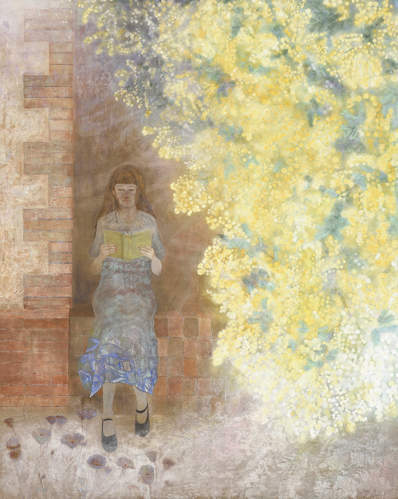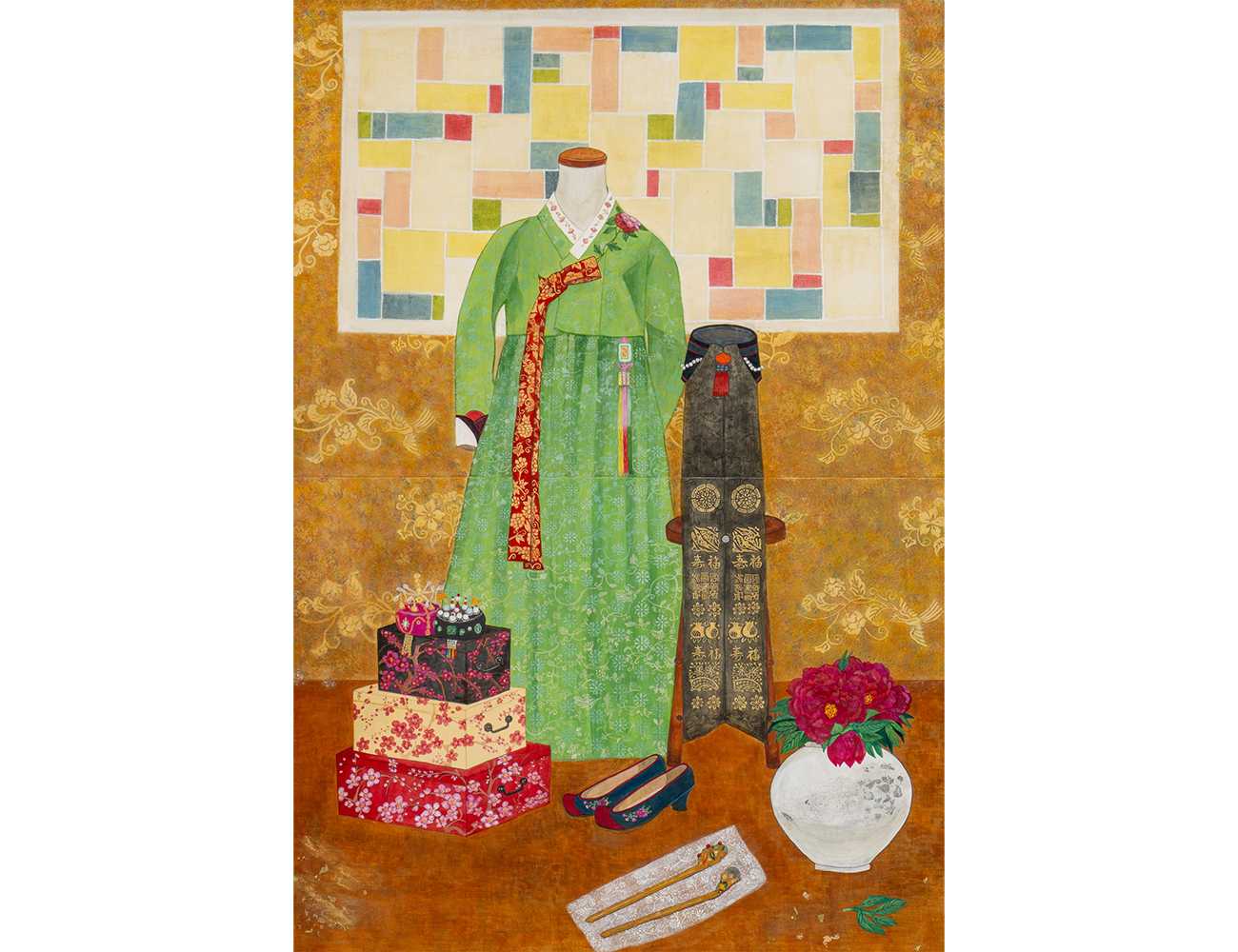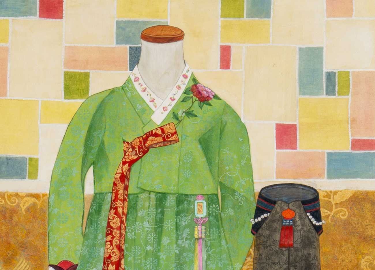 生まれて初めての100号サイズでの作品制作。これが描きたい!と言う強い思い入れや準備が無いまま迎えた卒業制作だった。モデルも頼めなくて、さて!となった時、家にあるのもで思い入れのあるものを描くことにした。かつて習っていた韓国舞踊の最後の発表会で着た韓服と冠や簪、作ってもらったポジャギ(パッチワークの布)を描いてみた。