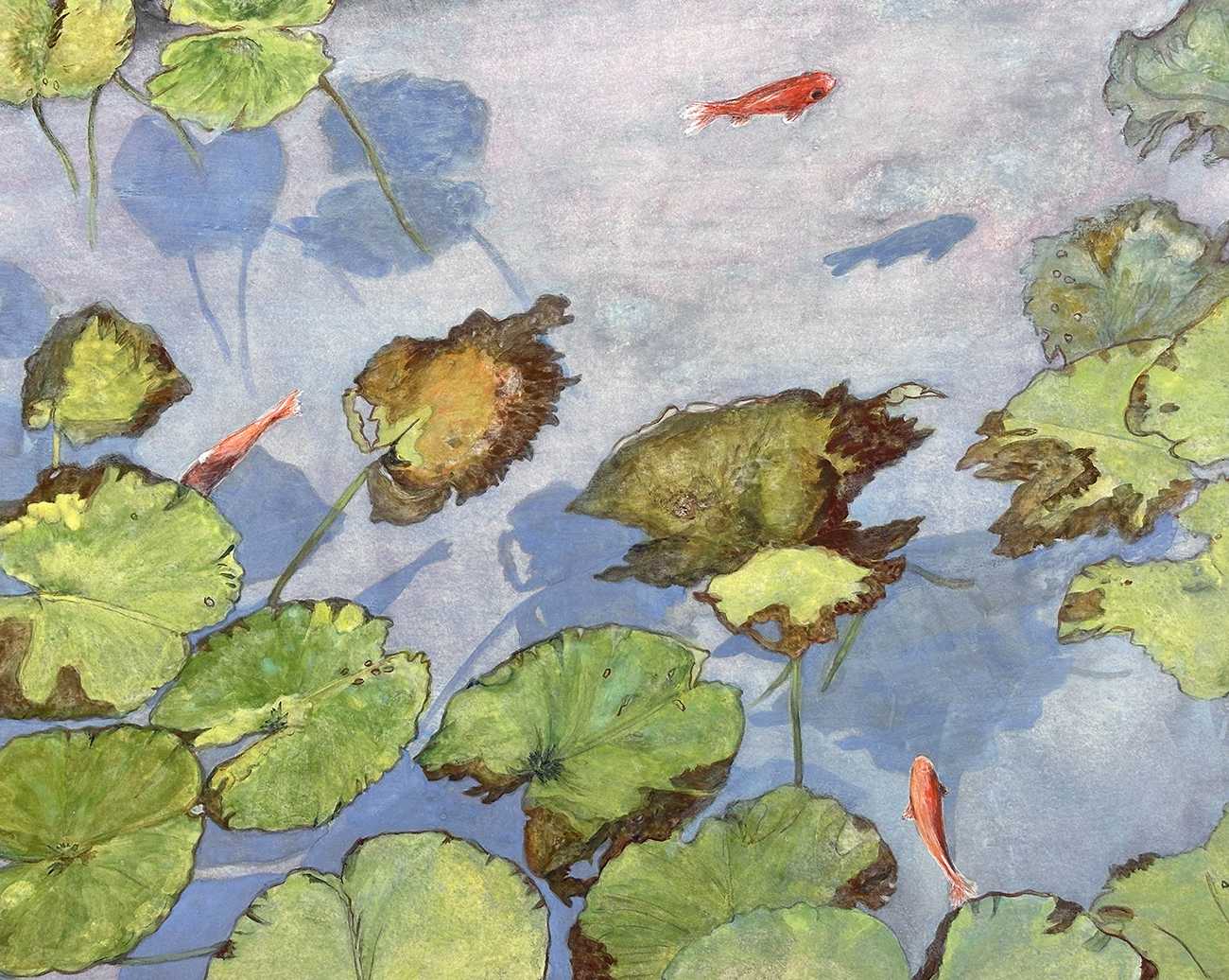 11月、近所の公園で池に張り出した東屋から水面を覗いてみた。緑で水面を被い尽くした夏の様相とは違い、冬枯れが進んで来た睡蓮の葉の形状に面白味を感じた。暫し見入っていると葉の合間から動くものが垣間見えた。さほど深くはないだろうに、覗く程に自分の内側の暗部に繋がっていくかのような想いがした。