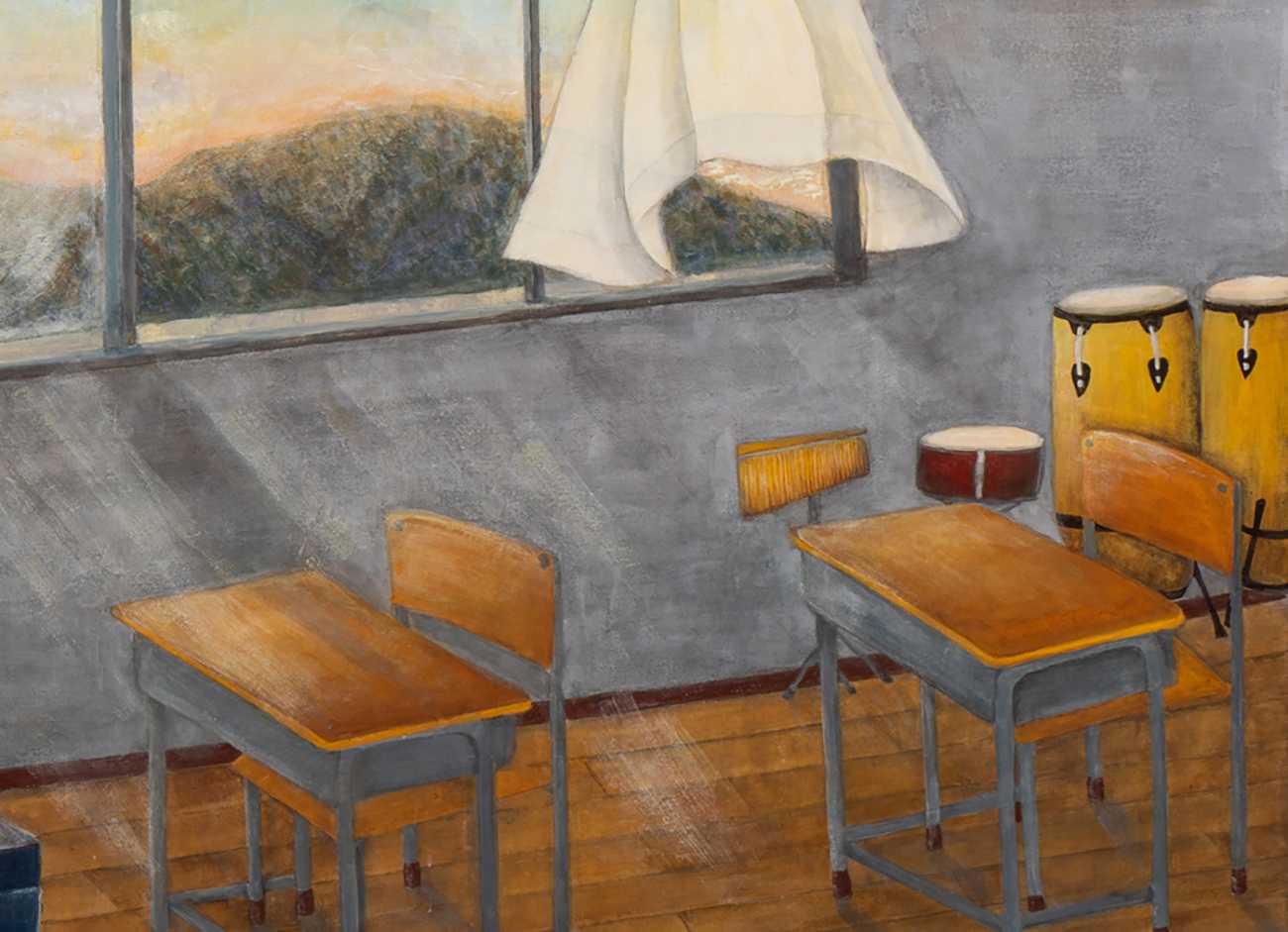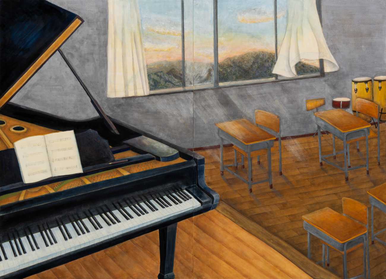 子どもたちが下校した後の音楽室の様子を、自分にとって大切な存在のピアノをメインに描いた。今日1日を想起し、明日の授業を希望をもって組み立てる時間。夕焼け空に包まれた静寂の中、1日のうちで一番心がほっとするひとときである。