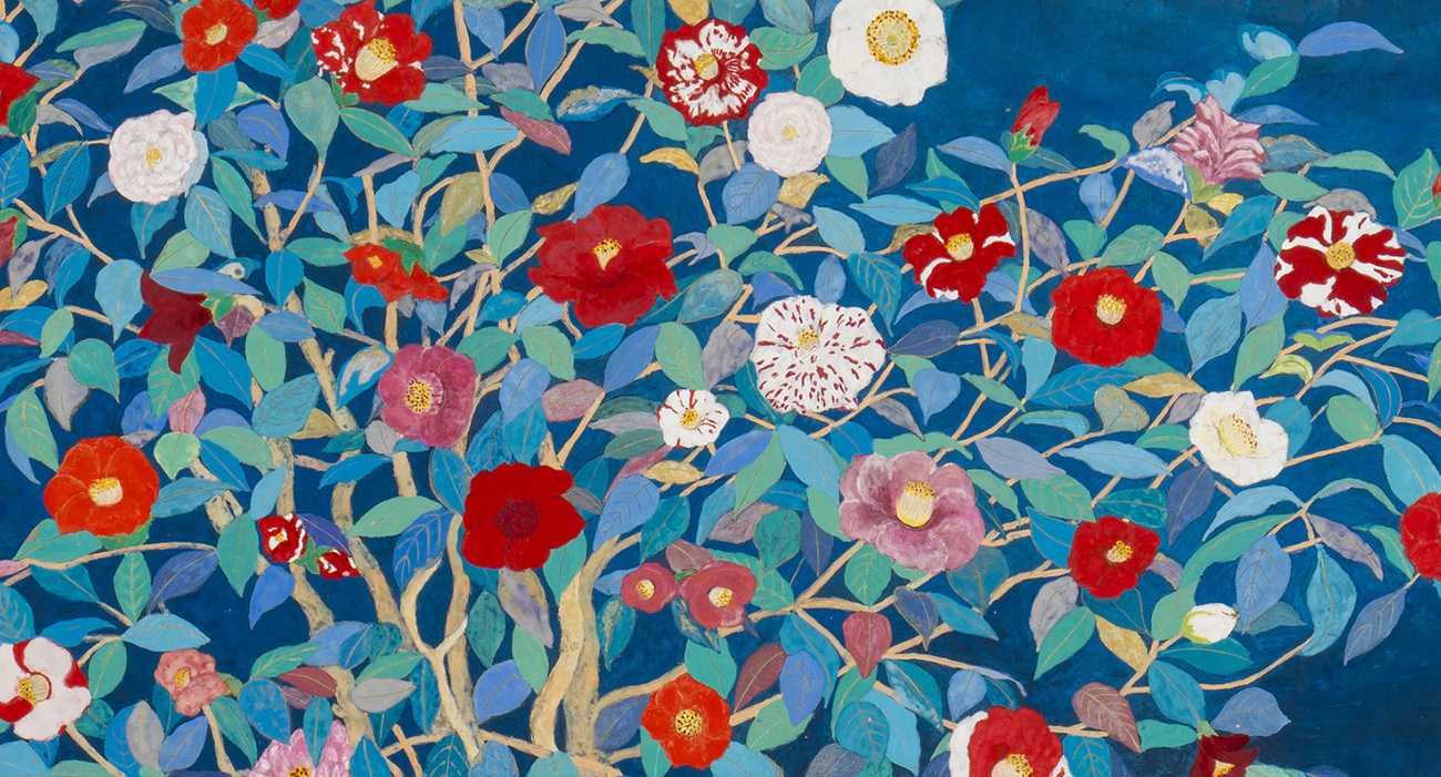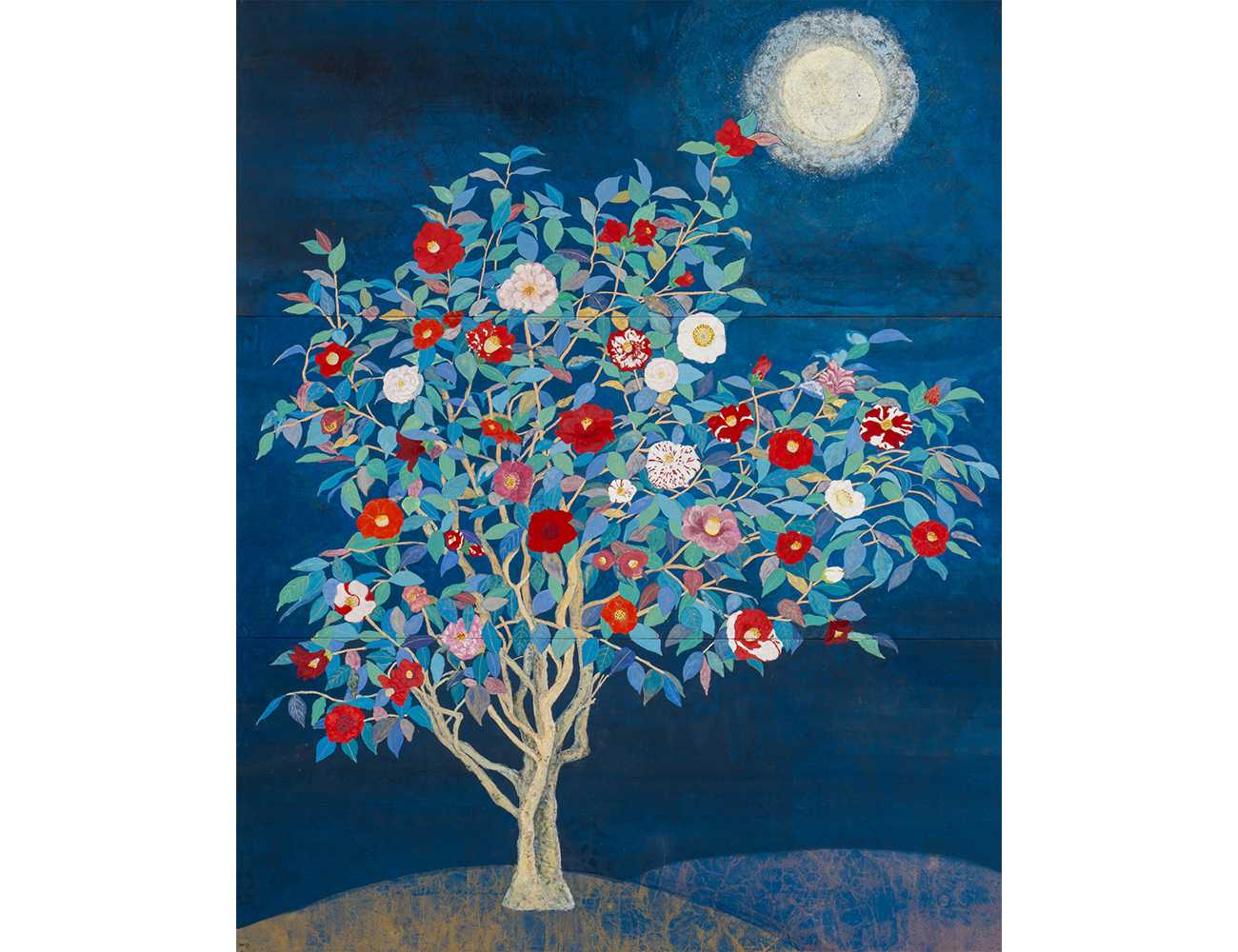 個性豊かな椿の花を写生するうちに、それが女性の姿に思えてきました。ありのままの自分を思いきり、咲く歓びを一本の木に多種類の椿を咲かせて描いてみました。