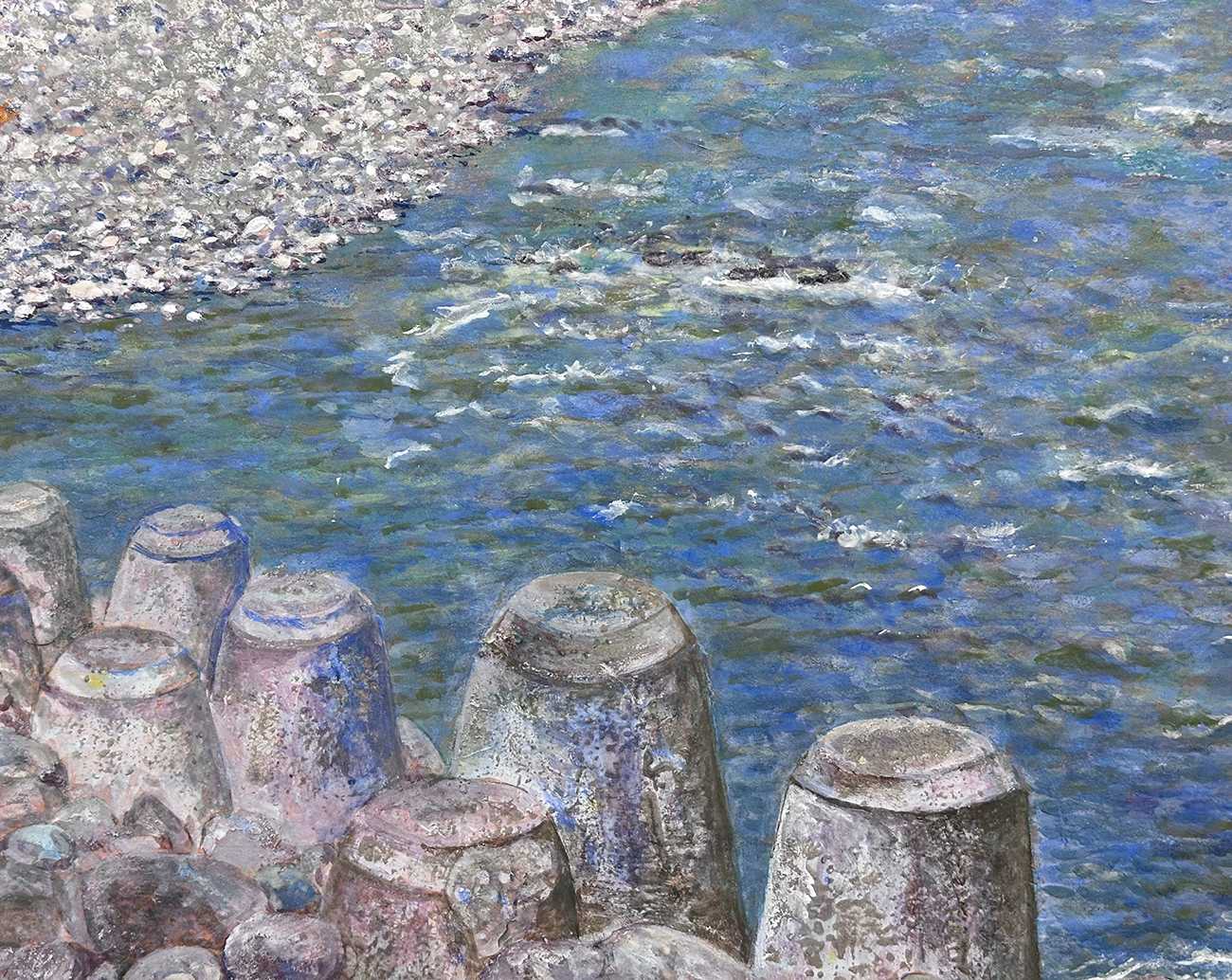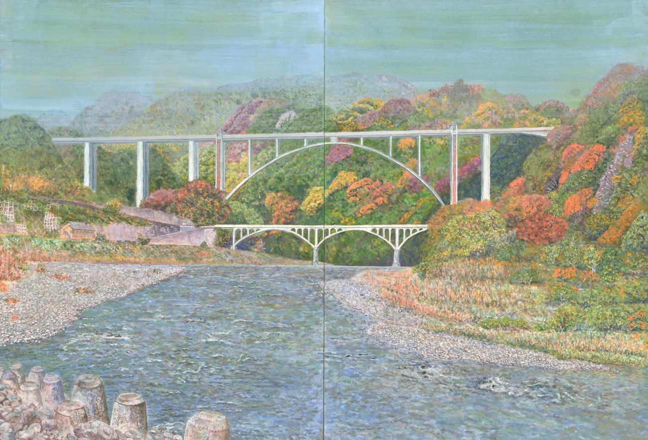 昭和にできた小倉橋、平成に完成した新小倉橋、そして周囲の紅葉の色どりの変化に目を奪われて描いた相模川の景色です。