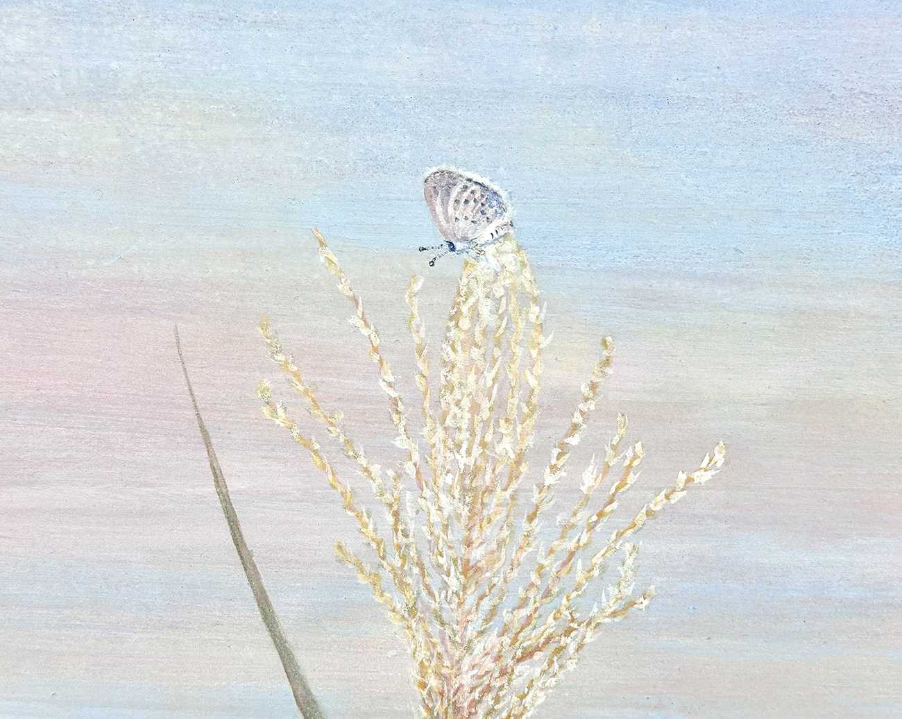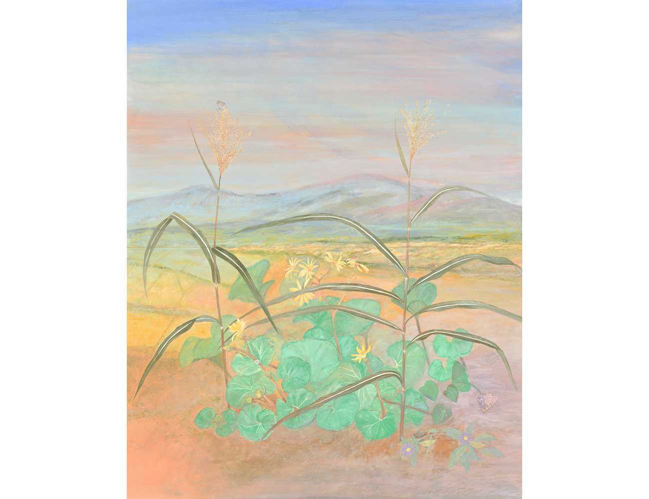 2022年に裏庭ではじめて花穂をつけた2本の荻(をぎ)を描きました。2本の荻は完璧な間合いで立ち、その姿は私たちを温かく迎えてくれた人たちを思い出させてくれ、また天に向かう花穂は穂先に強い方向性があり、天の川銀河がまわっていることを示しているかのようでした。