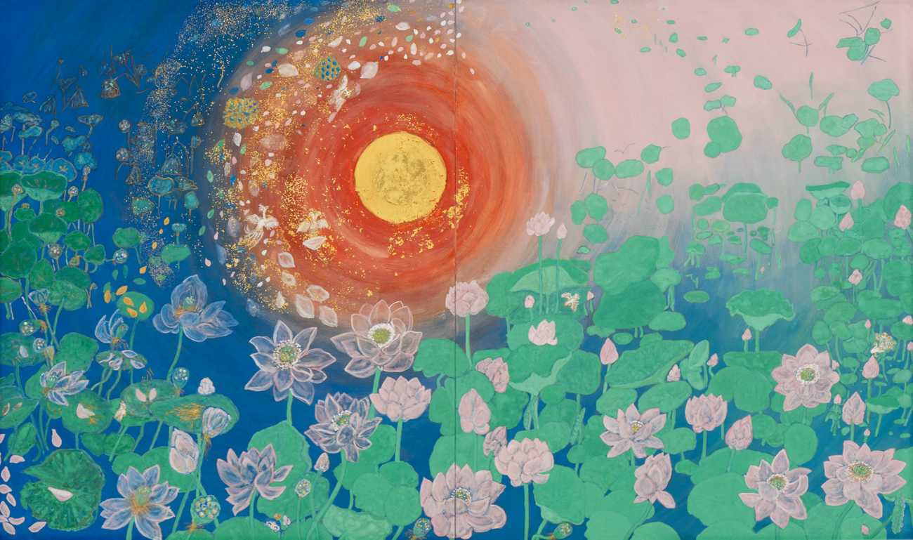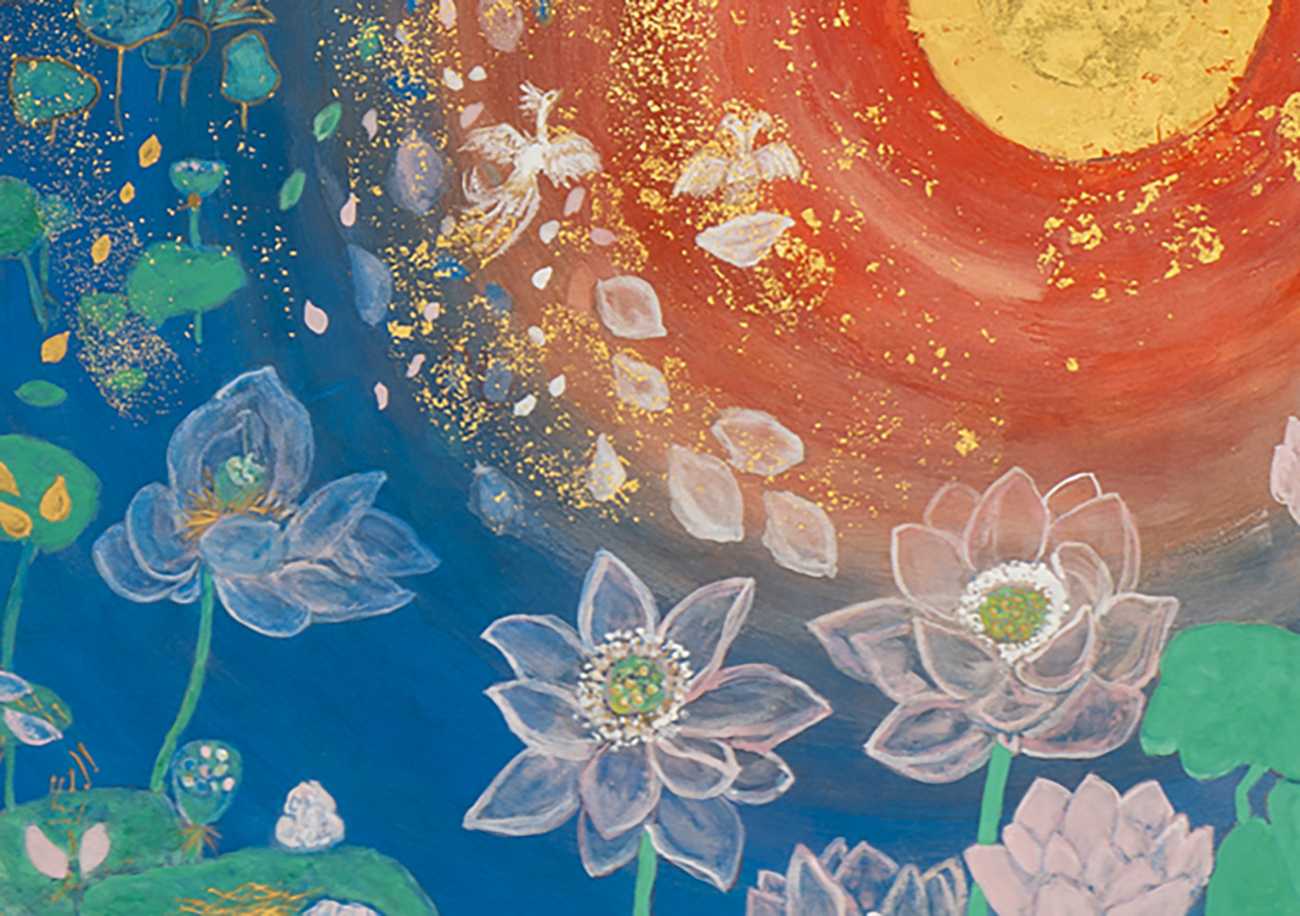 極楽浄土の蓮華は、太陽を中心に春夏秋冬円を描くように、また昼と夜の時間が同居するように、宇宙に咲いています。