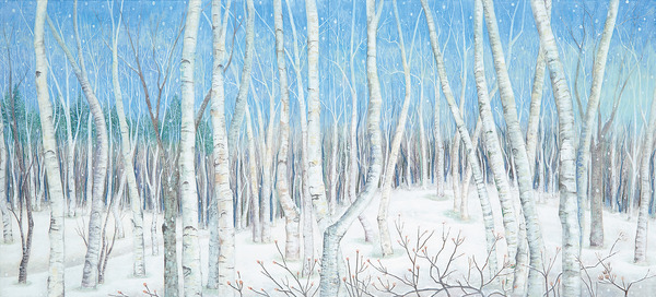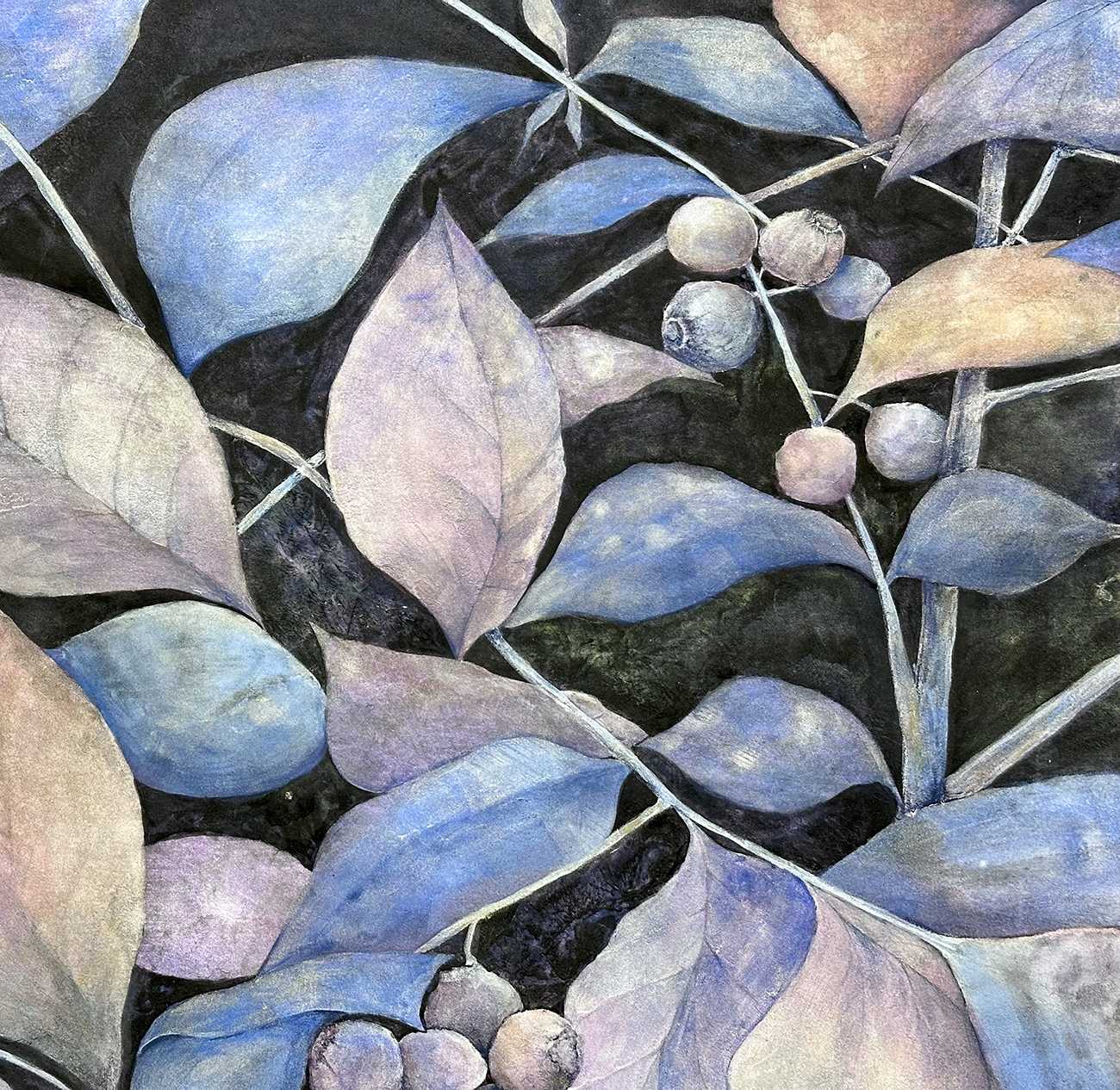 暗闇の中で瑞々しく漂う緑のマチエールと、光を放っているかのようなブルーベリーをモチーフとして描くことで、生命の力と希望を表現しました。