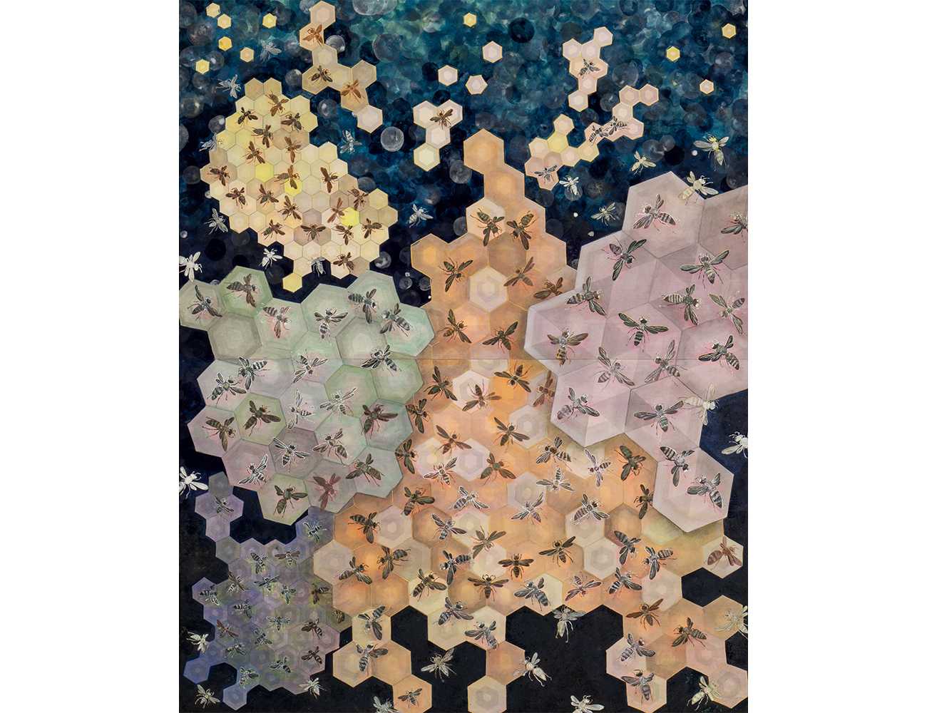 蜂が造る六角形の巣。雪の結晶とも共通し、その数学的な規則正しさは自然界に秘められた宇宙からの暗号なのか?魔法の数字6に魅了された自然界(蜂の世界)を表現した。