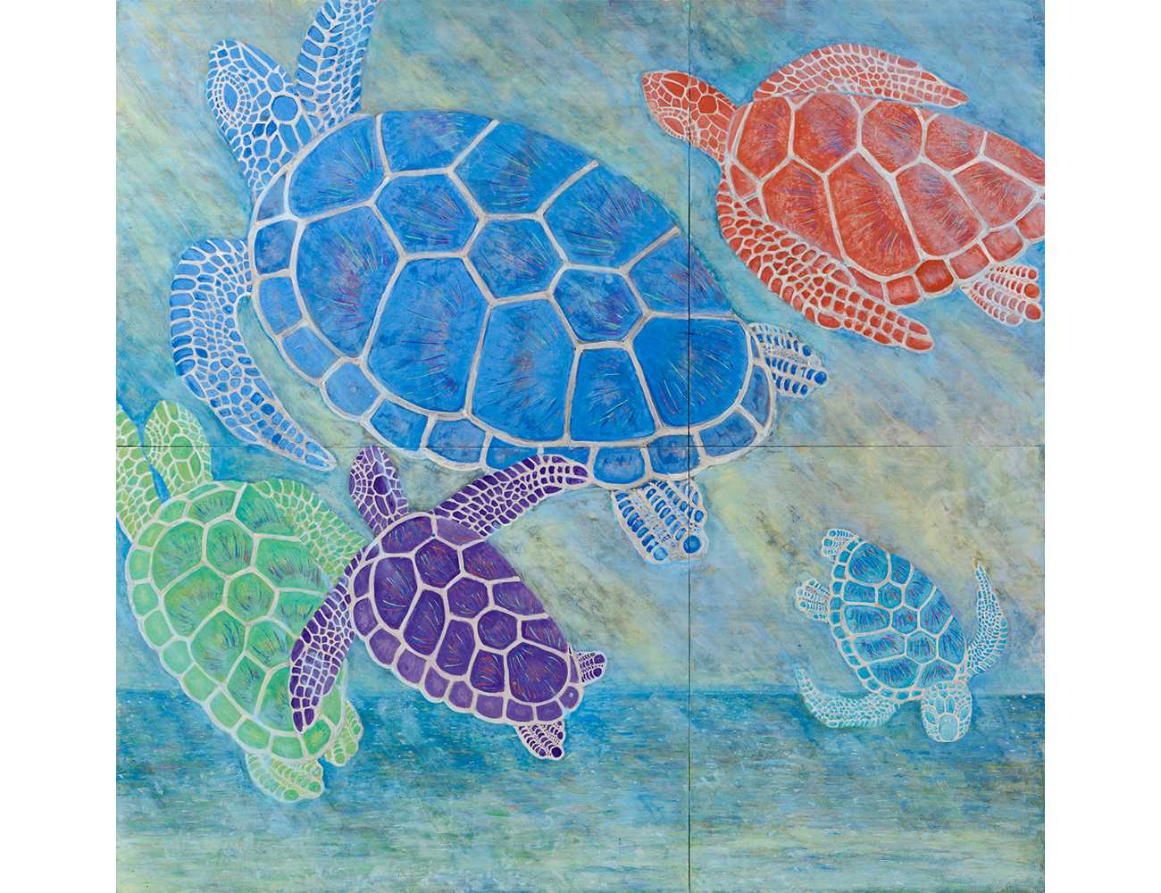 「大海原をどこへいくの、カメさん?」の疑問から大・中のカメは大勢を、顔を正面に向けた小さいカメは自分や絵の鑑賞者への問いかけとして表現した。