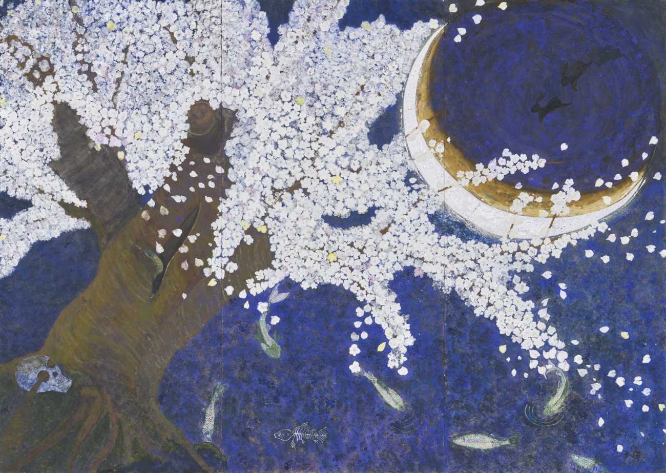 川土手に立つ桜の老木が下弦の月とは言え、艶やかに、あやしく今や盛りと咲き誇っています。ねっとりとした微風に散る花びらが川面に舞って、同じく月灯に煌めく小魚たちと渾然一体となっています。桜の下には死体が埋まっている、桜はその養分を吸い上げている。そんな妄想を抱かせる春の宵闇です。
