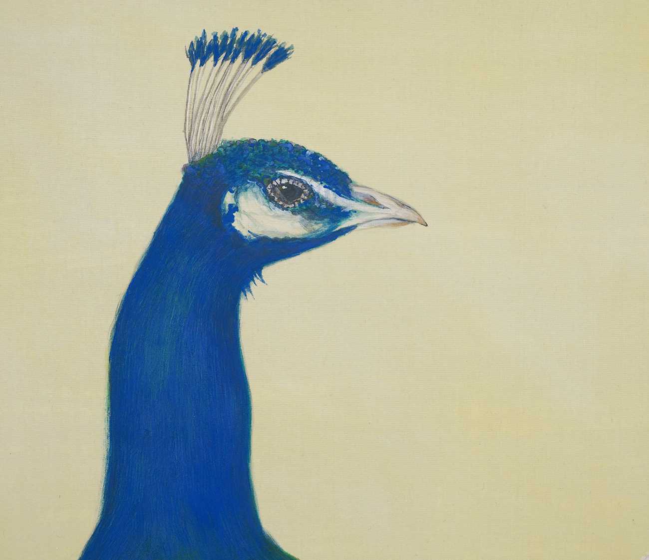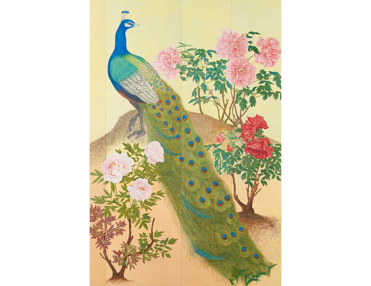絹本の可能性に魅力を感じ、孔雀を中心に牡丹を脇に配した構図としました。絹本作品は古くは平安時代からのものが伝わりますが、あまり見かけなくなっているようです。