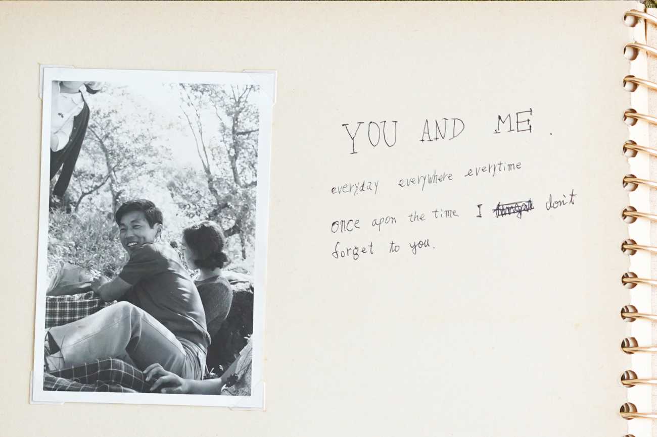1枚のモノクロ写真に目が留まる。葉が生い茂る木の下で座る横顔の義母は手元の辺りを見ていて写真を撮られていることに気づいていない。その手前に座る義父が満面の笑みでカメラの方を振り返っている。写真の横に義父による手書きの言葉が添えられていた。「YOU AND ME. everyday everywhere everytime once upon a time I don’t forget to you」奇妙な英語が滑稽ではあるが、義母への恋心が溢れ出ていた。アルバムをめくりながら義父がつぶやいた。「拝み倒して結婚してもらったんだ」