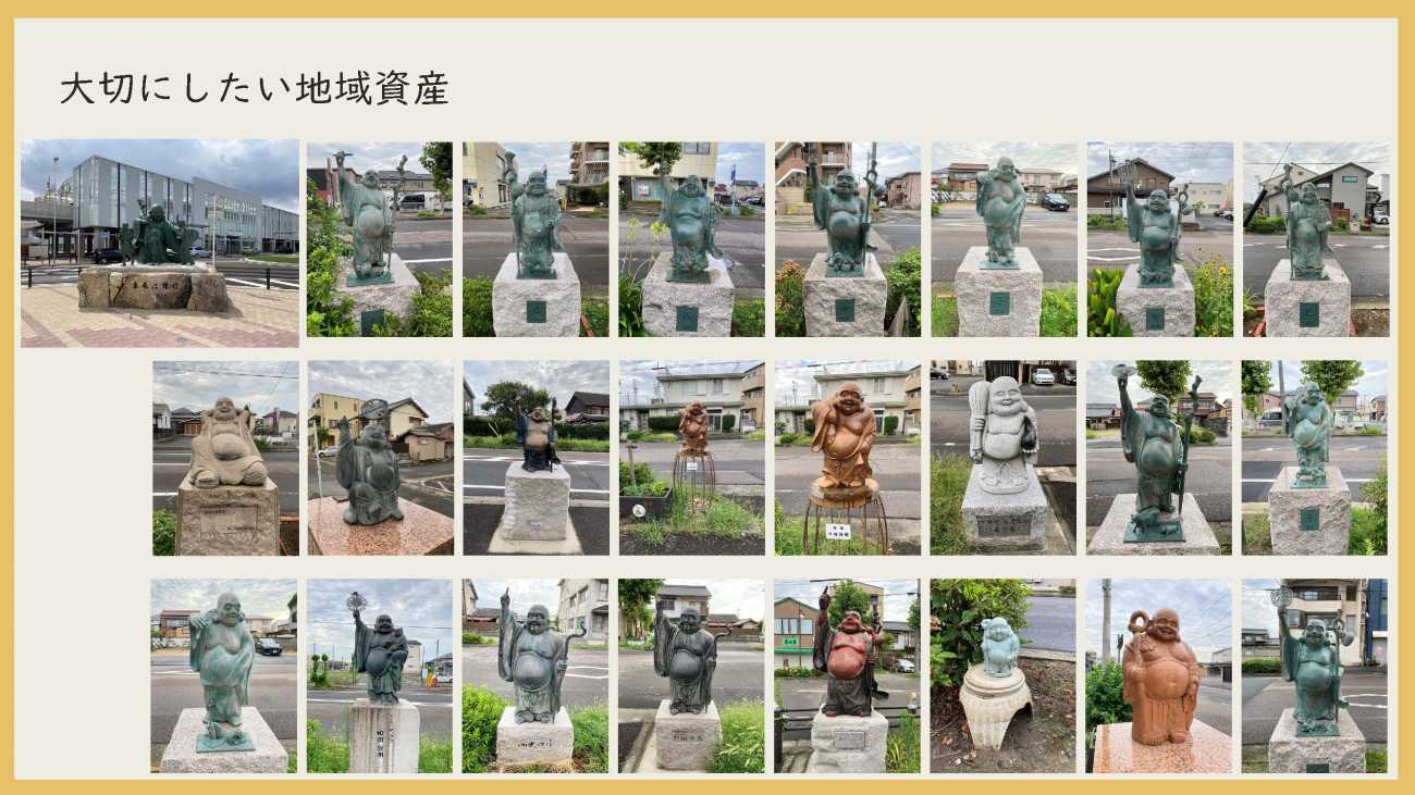 布袋駅の駅前にならぶ地元住民や企業寄贈の布袋様像 (抜粋のみ、お祭りのときに登場する、普段は隠れた像などもあり)