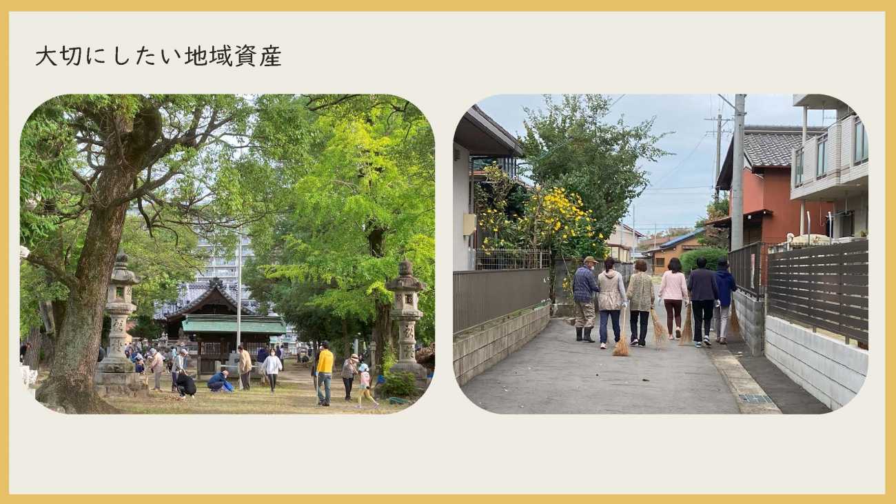 新型コロナウイルス感染症の行動制限が解かれた後の神社の掃除。久しぶりに竹ぼうきをもって集まり、茂ったヌスビトハギの種を大人も子供もいっぱいつけ、上手な取り方のコツを伝授しあって笑いあう。穏やかに流れる時間の中で、私にもこのまちの表情が見え始めてきました。