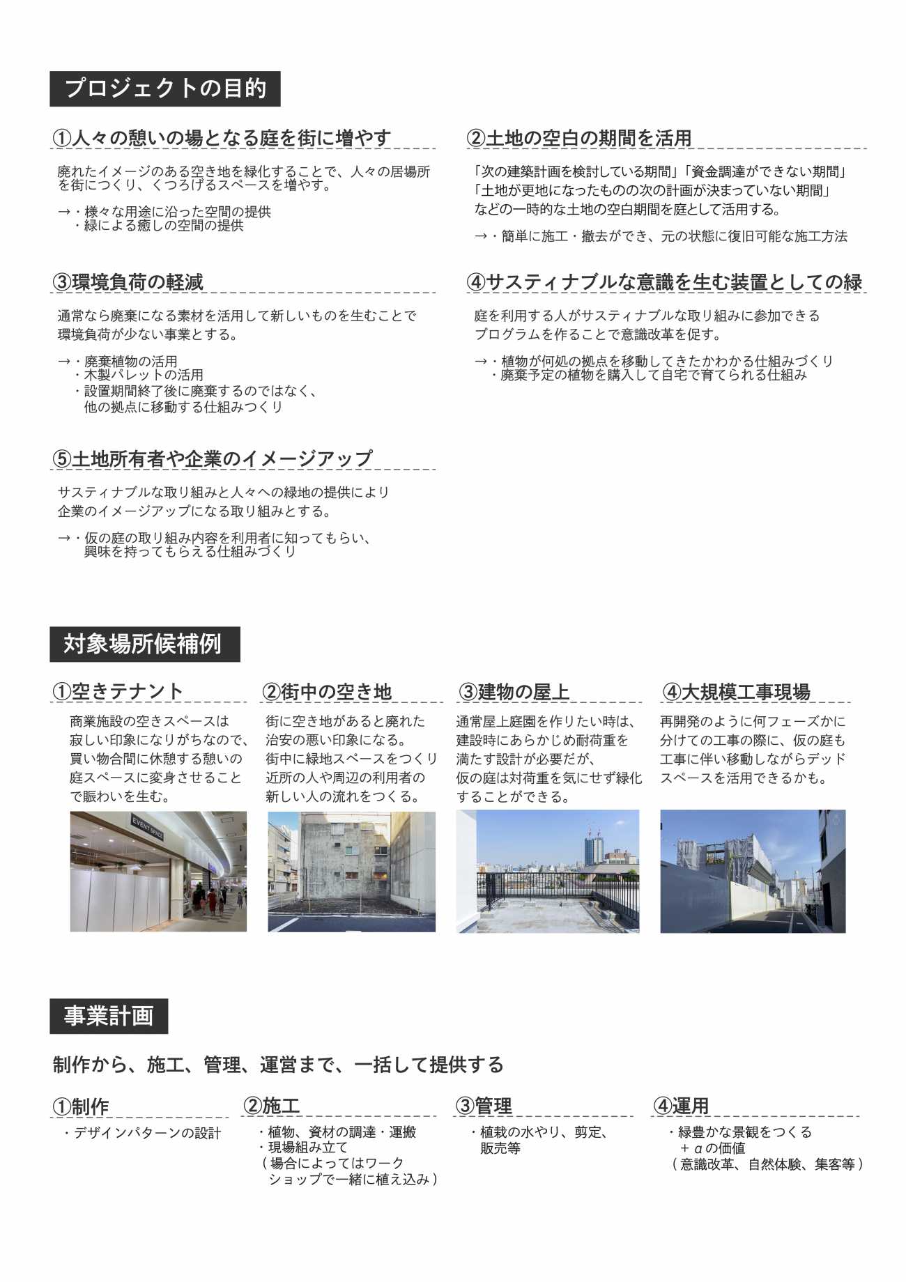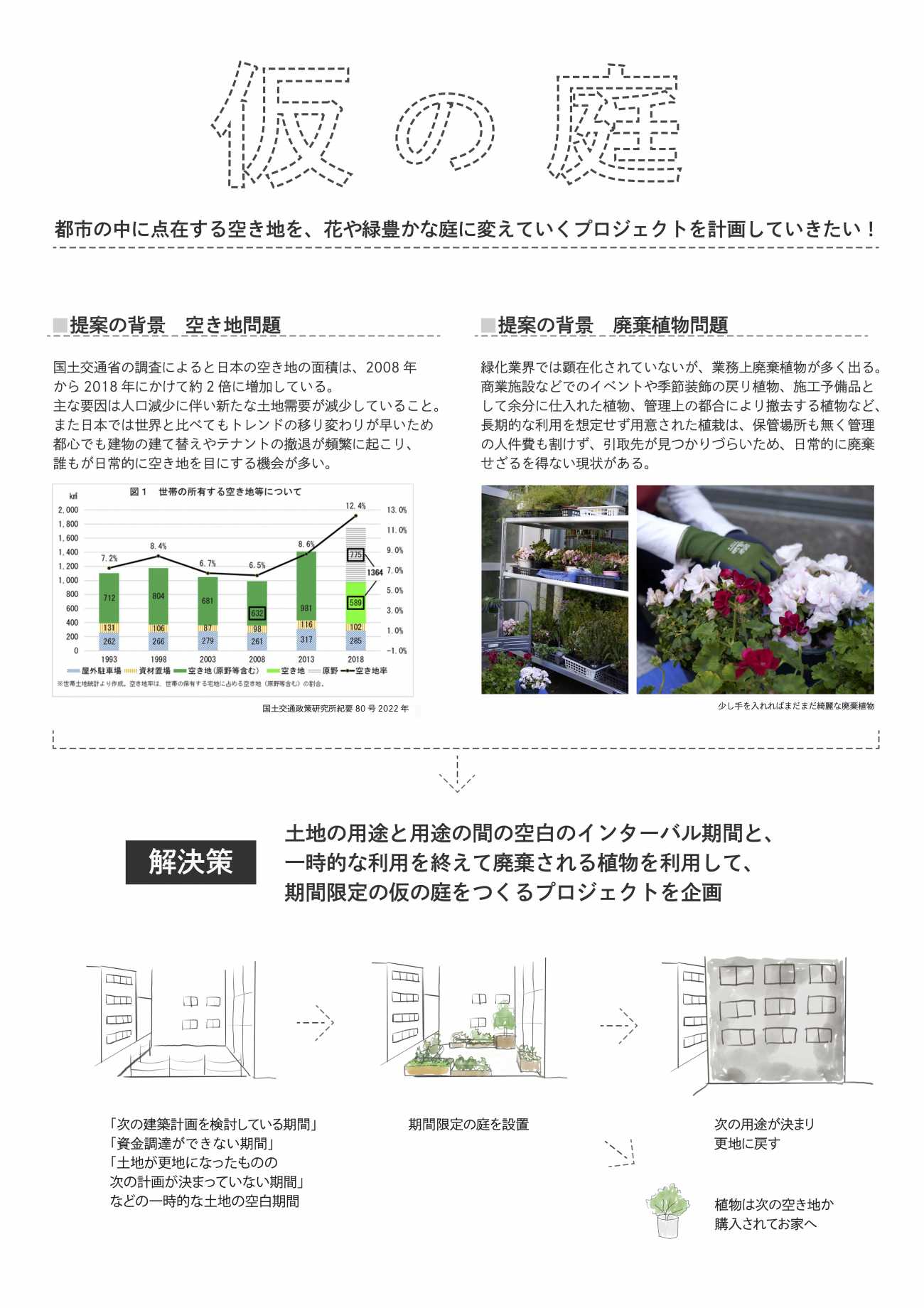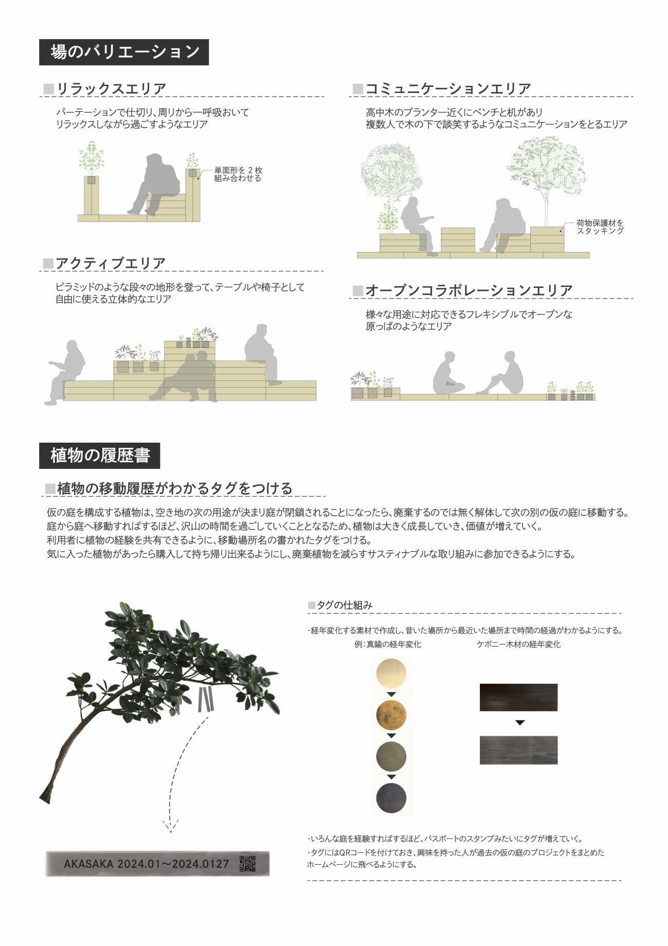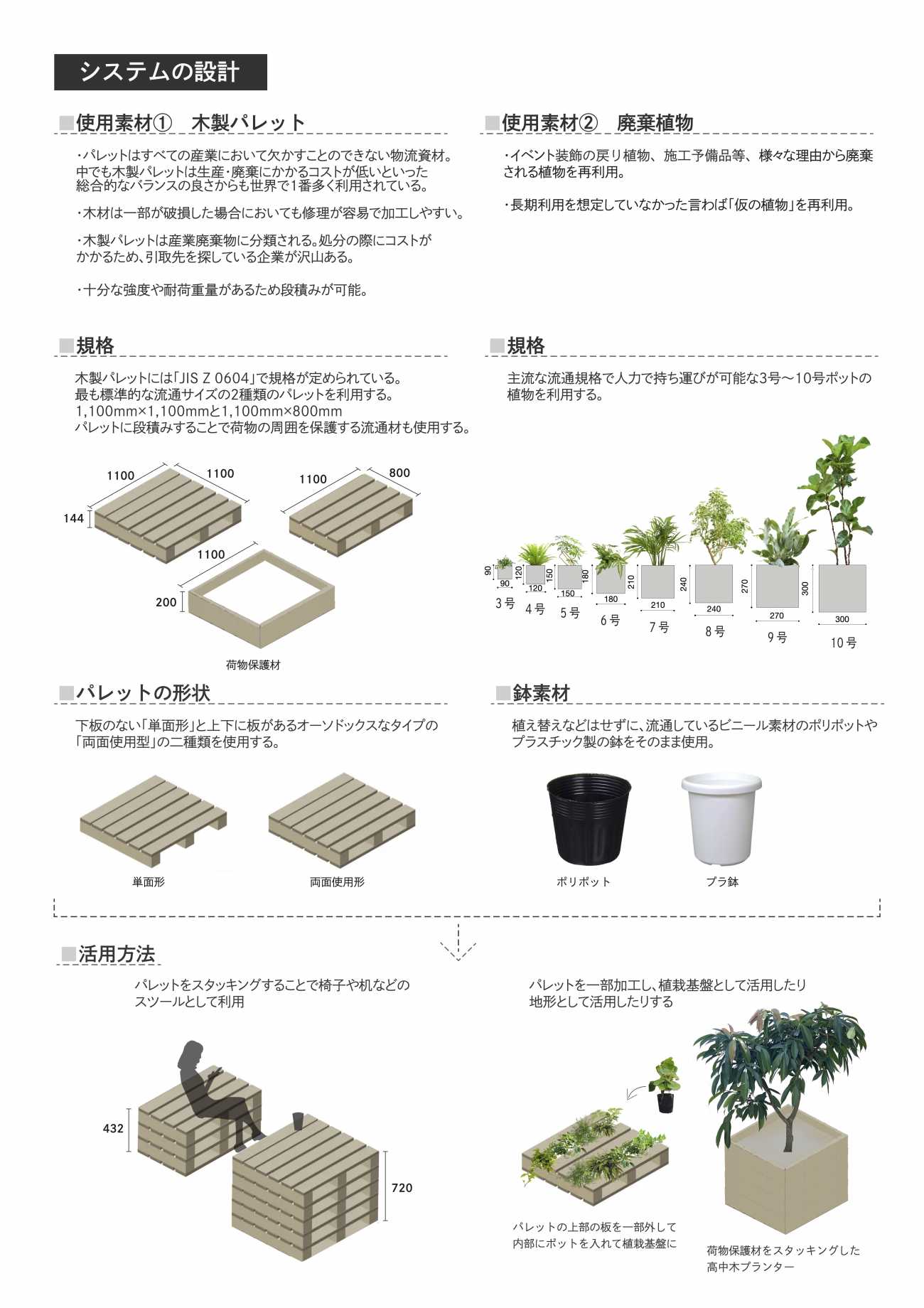空き地の次の用途が決まるまでのインターバル期間に、一時的な利用を終えて廃棄される植物と物流資材を利用して、期間限定の仮の庭をつくるプロジェクトを企画する。