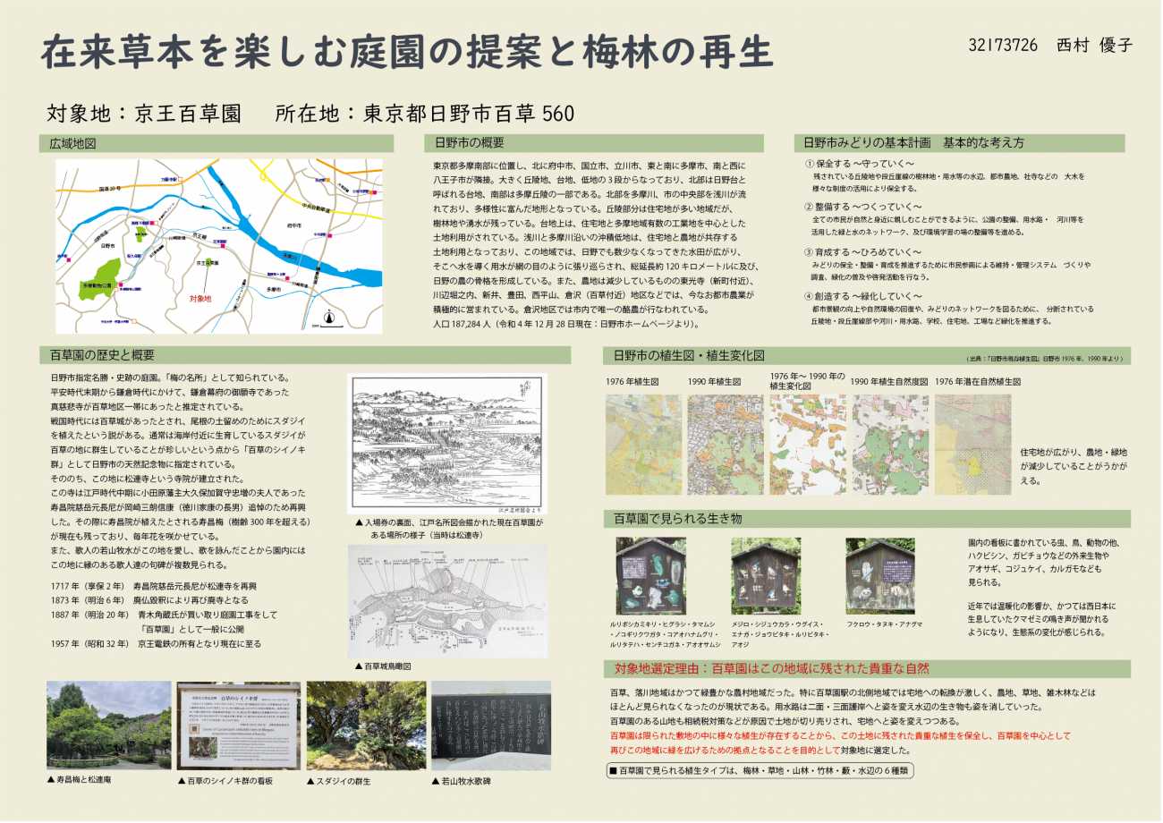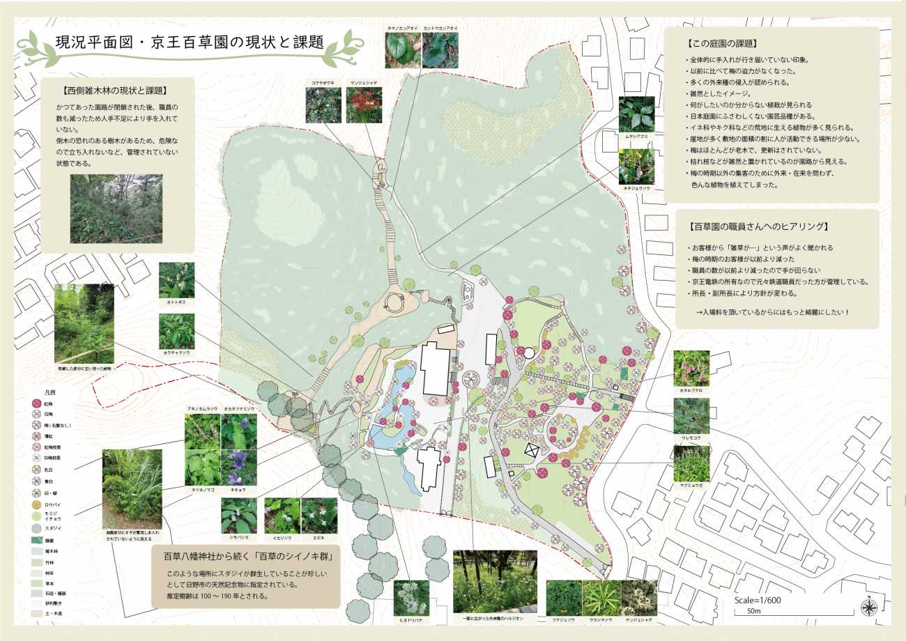 対象地は東京都日野市にある京王百草園。この地域において自然が残る貴重な場所であり、敷地内に様々な植生が存在することから保全の必要性を感じ、この場所を地域の緑の拠点にしたいと考え対象地に選定した。