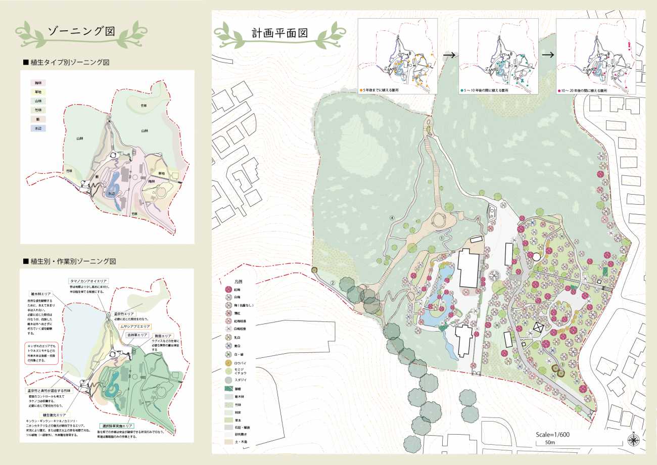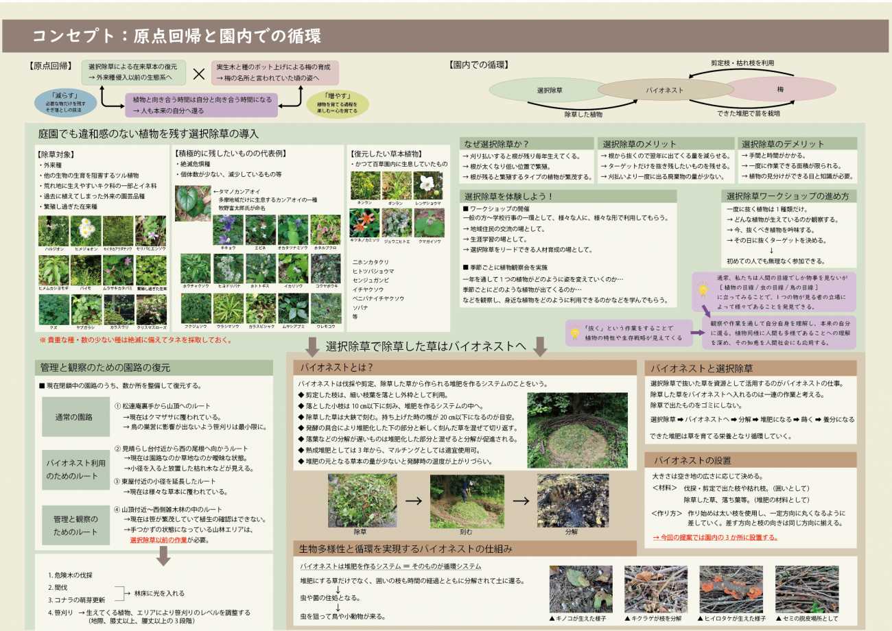 コンセプトは「原点回帰と園内での循環」とし、原点回帰するものは草本植生、梅林、作業を行う人を対象とする。