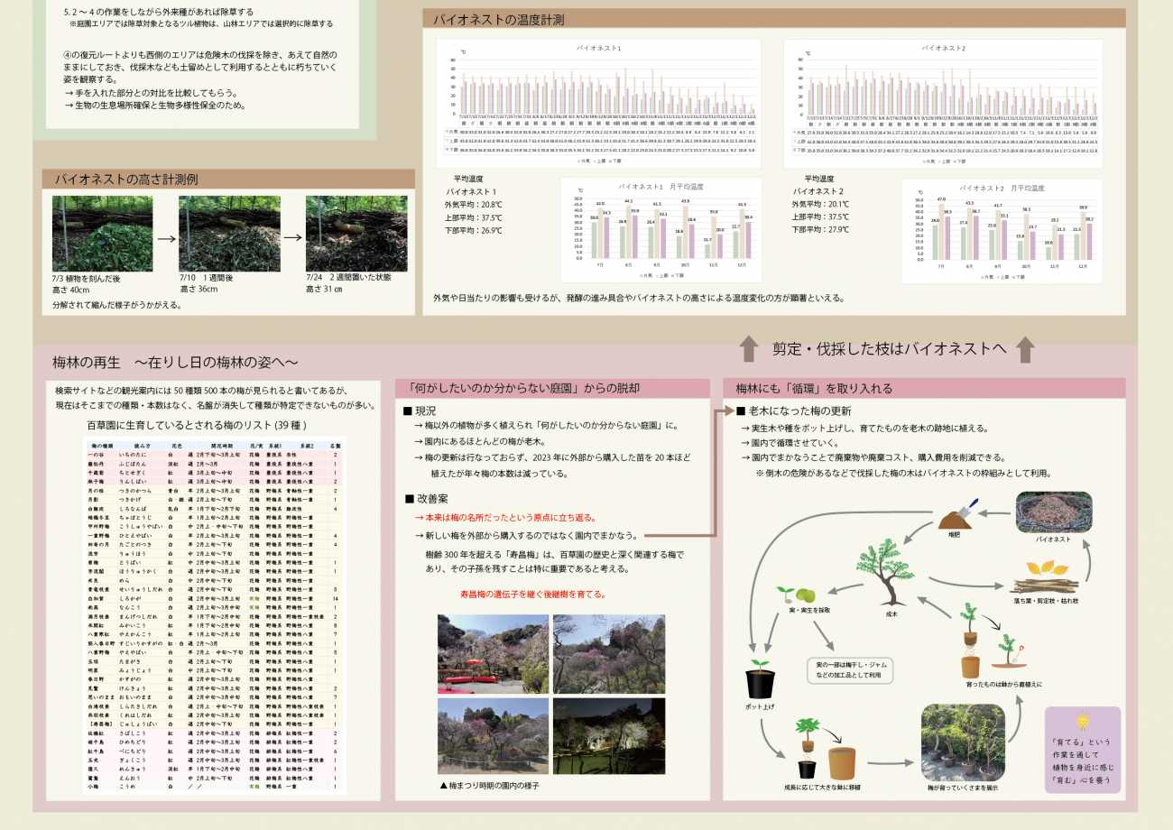 「梅の名所」として知られる百草園だが、現在はほとんどが老木であり更新もされなかったために梅の種類も本数も減ってしまった。百草園の象徴でもある「寿昌梅」は樹齢300年を超えている。歴史のある寿昌梅の存続のために遺伝子を引き継ぐ後継樹を育てる必要性や老木の更新による梅林の再生によってかつての姿を取り戻す必要があると感じた。循環という観点からも園内で賄うために種や実生をポット上げし育成する。