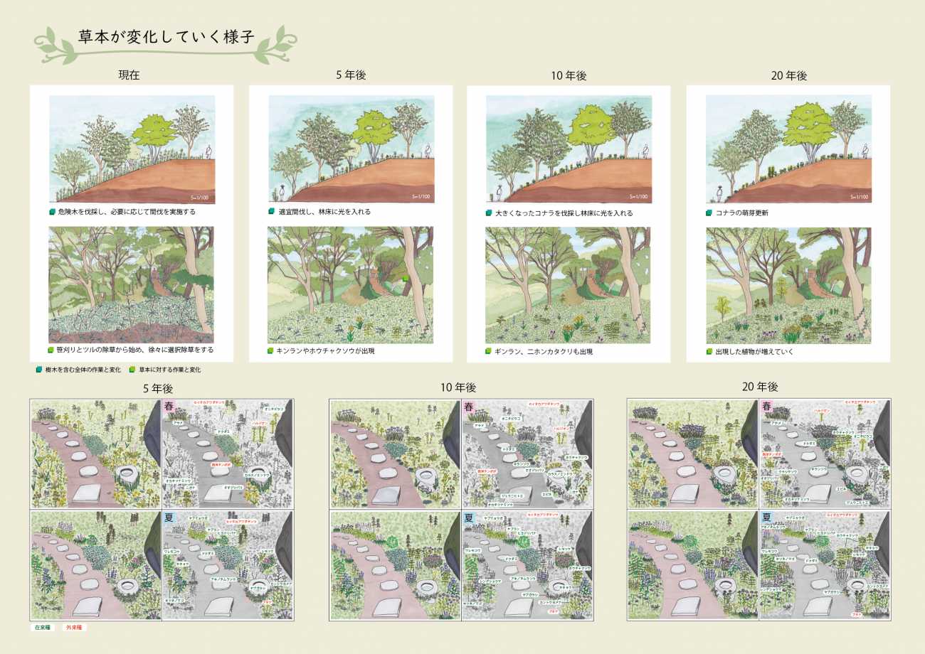 庭園でも違和感のない選択除草を導入し、多摩地域のみに生息する「タマノカンアオイ」などの貴重な植物を保全する。外来種を除草することによりかつて生息していた在来草本の復元を目指す。