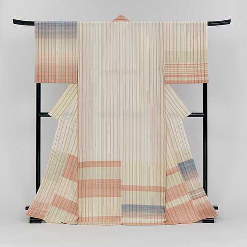 静寂に包まれ先の見えない夜の闇を、エネルギーに満ちた光輝く太陽が切り開いていく様を、これから染織の世界に飛び込む自分と重ね、勇気と力を与えてくれ自分が着たいと思える作品を織り上げた。