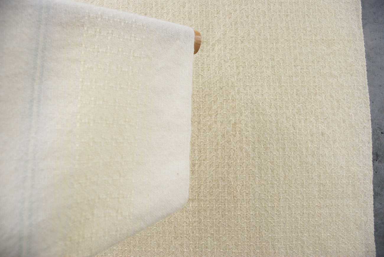 北海道の冬は長く寒く厳しいですが、雪に閉じ込められた光が青白く輝き、素敵な景色を沢山見せてくれます。冬景色の色を経縞の半纏の形で表現してみました。ひざ掛けは羊毛を手紡ぎして手織りしたホームスパンです。窓のガラスを透して見える、しんしんと降る雪を思い浮かべて織りました。暖かなものに包まれてすごす冬が好きです。