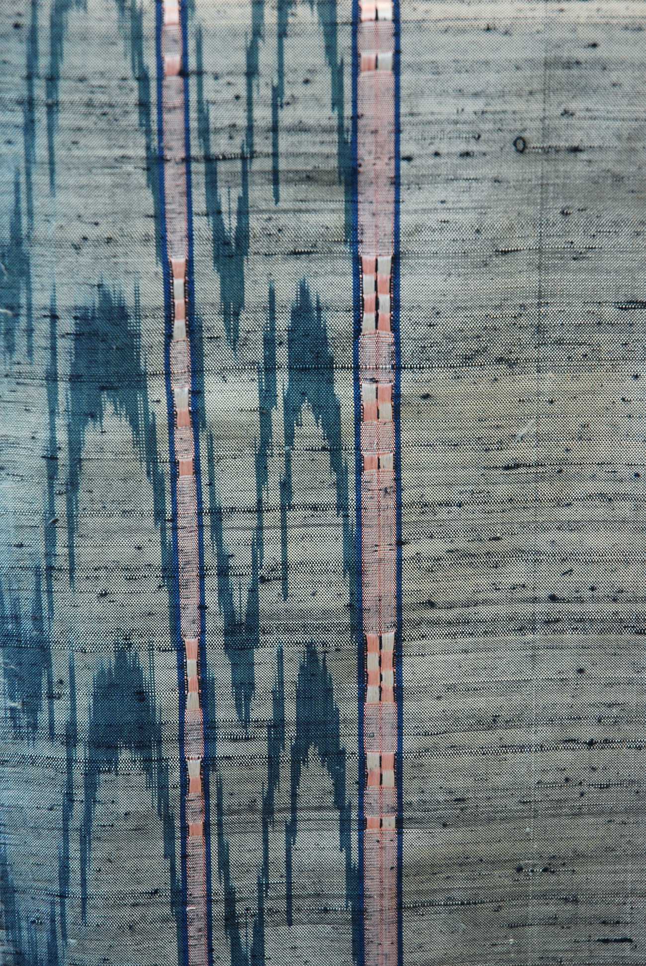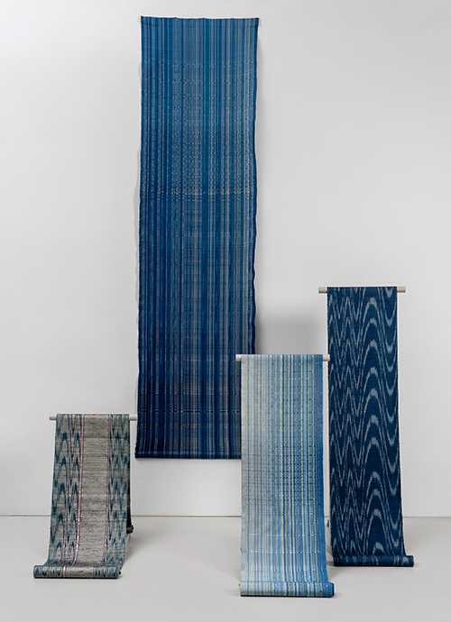 技法は、ロートン織と多摩地域で利用されている絣代を利用したたて絣技法を主とし、糸染めは、琉球藍と蓼藍という2種の藍を中心に染色。