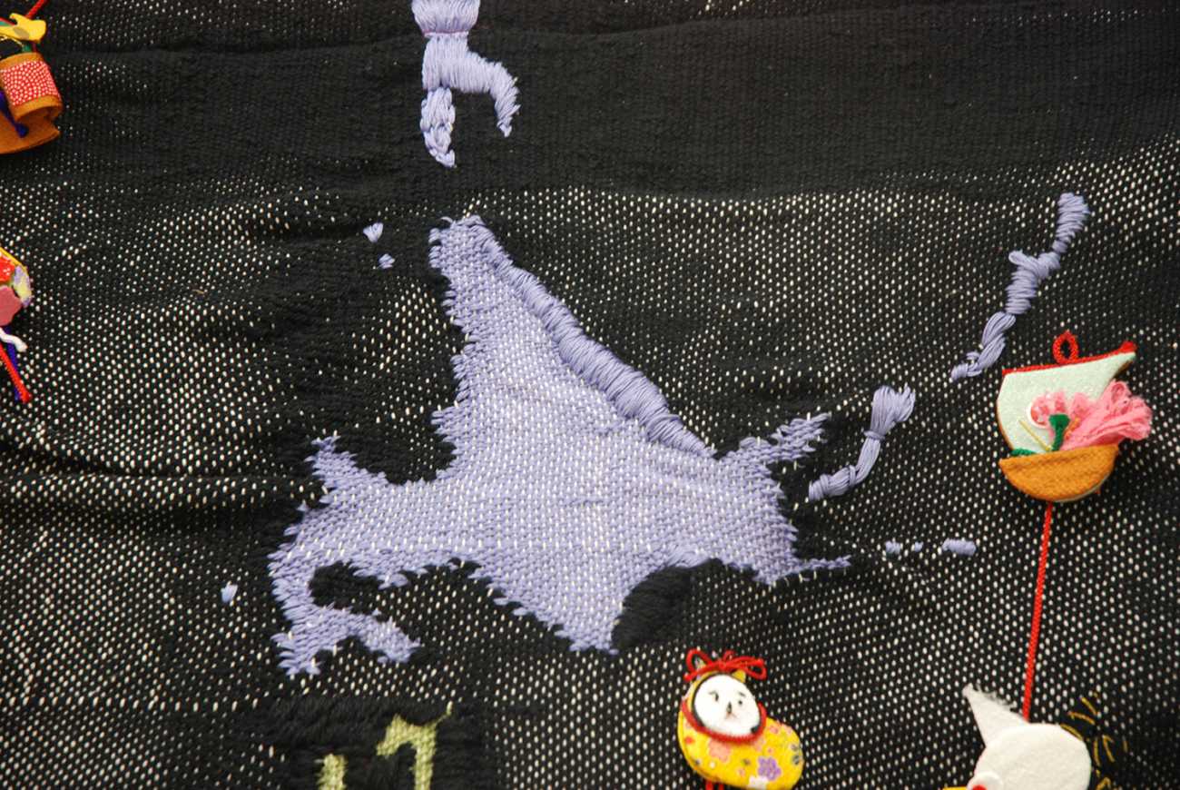入学前から[日本列島を綴織で織る]と決心して入学し、其を貫くべく日本列島を織る事にした。然し只[日本地図]に留まっては無芸たるもので、日本列島を枢軸にもアイディアは何転もしつつも此の作品で落着。背景を黒としたのは、主役である列島を際立たさせる為であるが、失われつつある和文化を象徴するものとして吊るし飾りのモチーフを加えた。列島を[五色に輝かせた]のは、五行に即した色から来るものである。即ち、東(緑)西(白)中(黄)南(赤)北(紫)にして、北海道に紫、東北~関東を緑、中部地方を黄色、近畿中国四国に白、九州及び沖縄に赤(此処ではピンク)を配した。