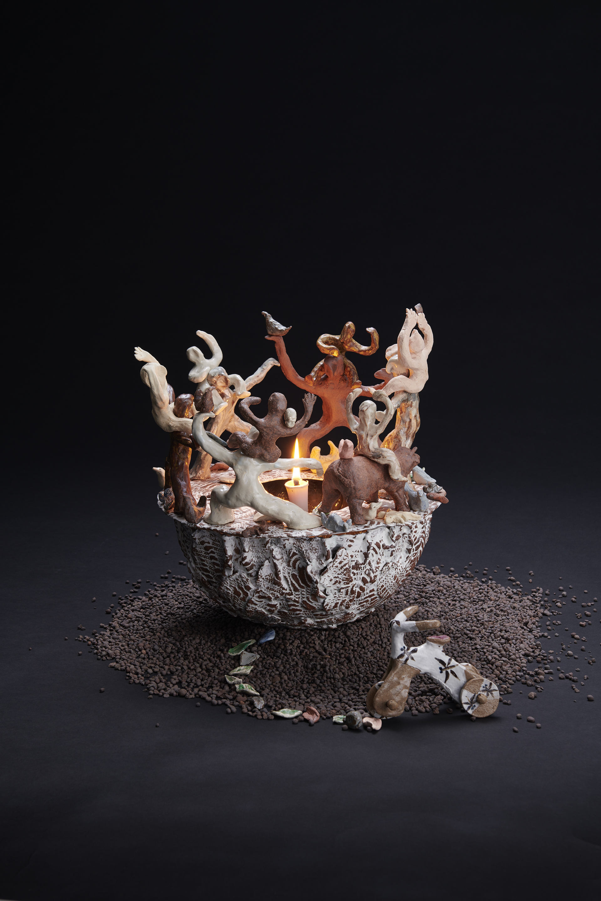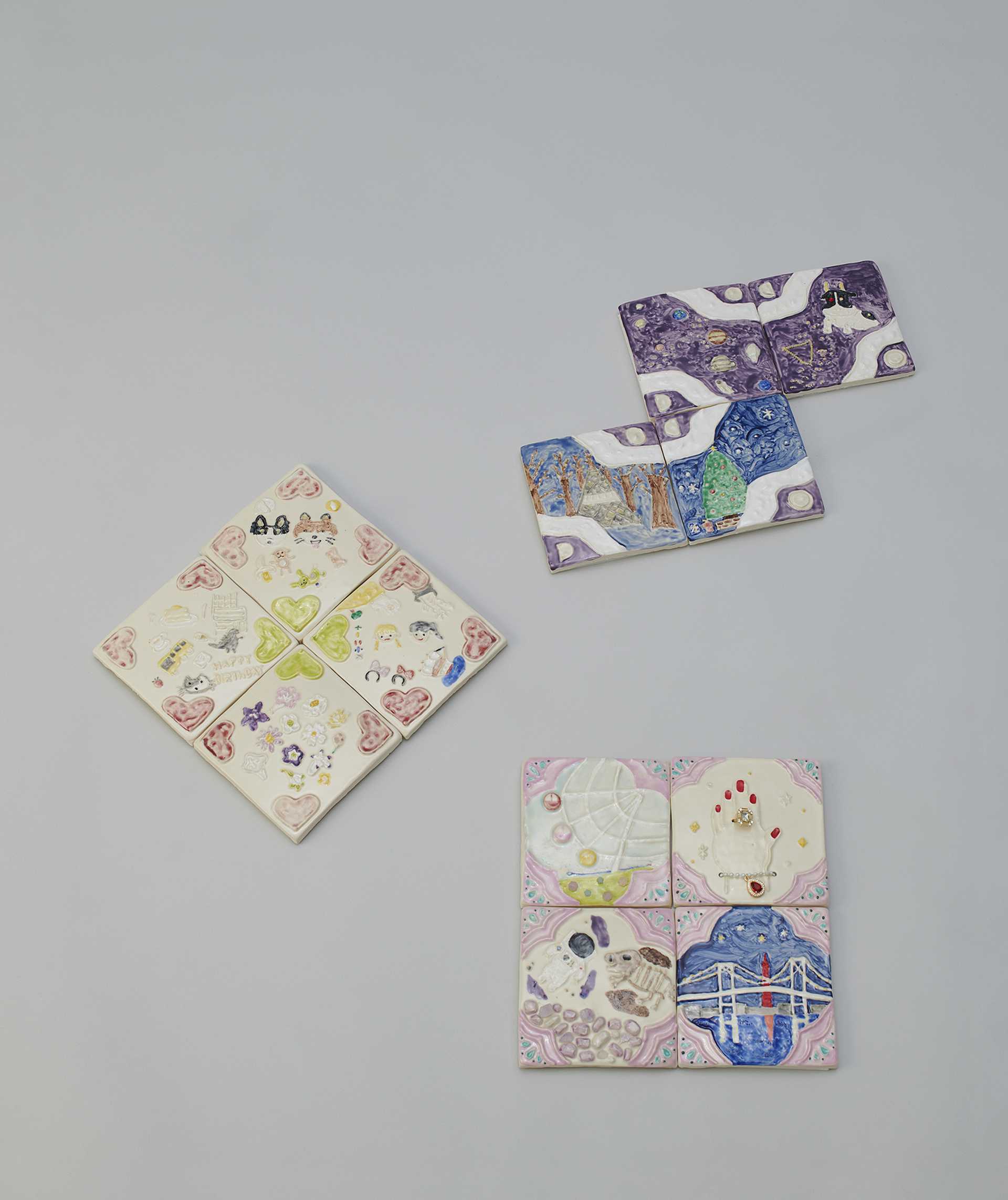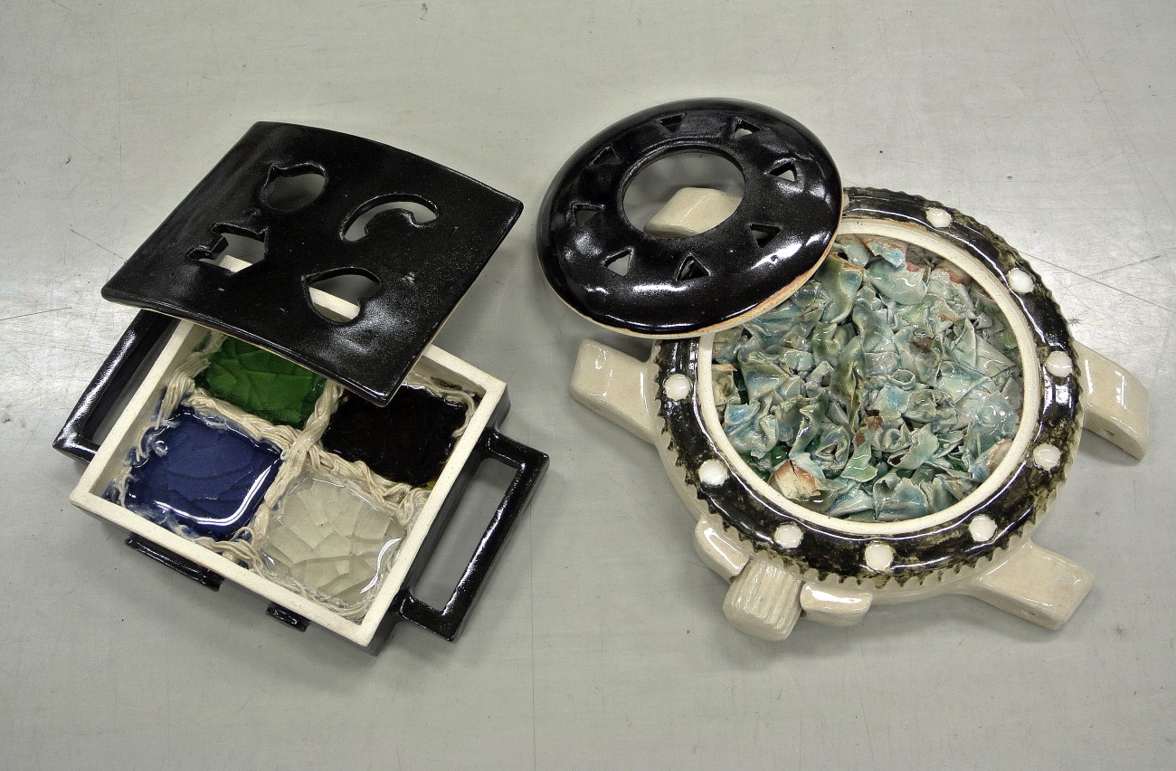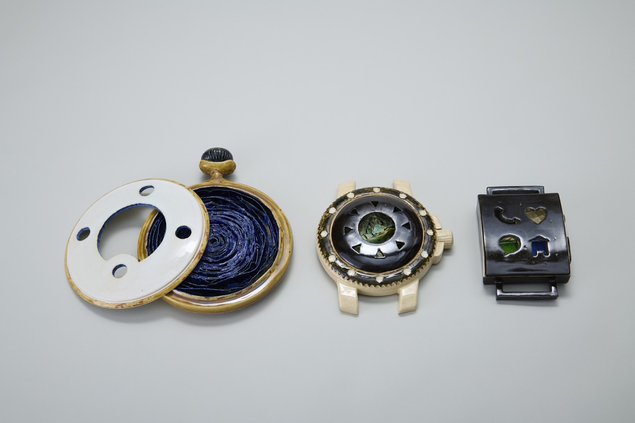 過去、現在、未来を象徴する形として時計をモチーフに「移りゆく時間」を表現した。全ての作品は文字盤とケース本体の蓋物であり、敢えて文字盤に針や数字を使わず、ケース内の造形にてそれぞれの特徴を示した。"過去"を表す懐中時計は、ぐるぐると渦巻く 「迷走の青春時代」を、"現在"を表す腕時計は、次々と状況が変わる「複雑な現代社会」を、"未来"を表すスマートウォッチは、現在の行動に起因した「分岐する未来」を表現している。