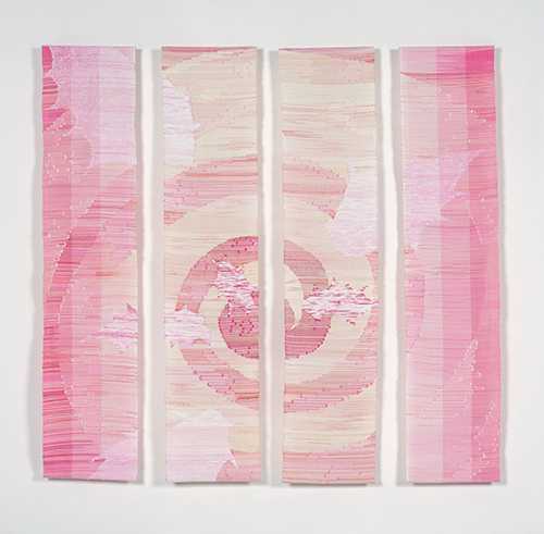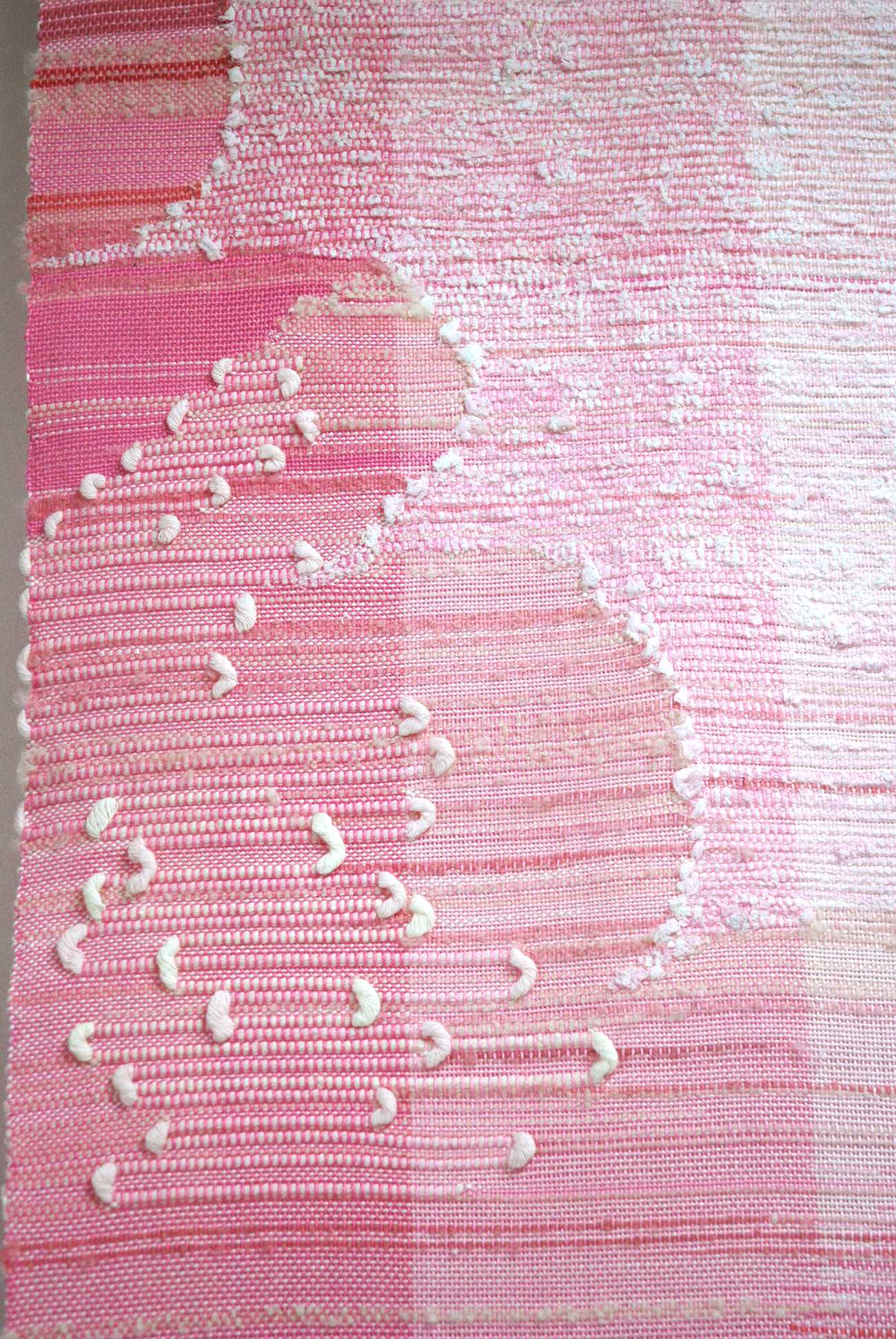 紅花染めのピンク色には、思考の繊細さや、外的な影響に応じて変化する葛藤が込められている。植物の葉が月日とともに、形を変えていくように、私の思考も状況により二転三転し、一貫性を欠いている。内面的な反応や周囲の刺激に揺さぶられながら、次々と積み重なり、絶えず現れては消え、心の中で織り交ざる不確実な世界を表現した。