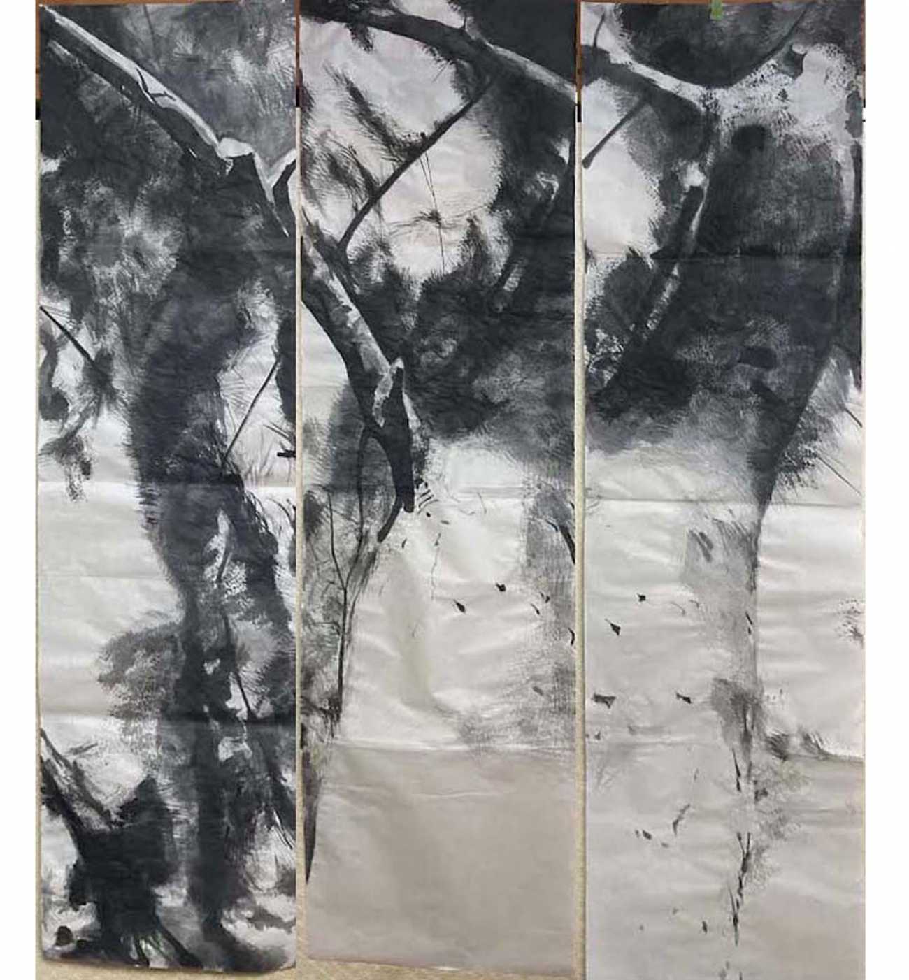 大浜熊野神社に子供の頃よく行った。海岸には何百もの松があり、風光明媚で人気があった。神社の鳥居近くにある高さ10m余りの松の木がずっと気になっていた。いつかは描きたいと思っていたが今日まで過ぎてしまった。碧い空に突き刺すような大樹と枝が神々しく感じる。この松の周りを歩きカメラにおさめ、写生した。描くのに沢山の試し書きをし、下記の半切サイズを6枚 描いて本番に望んだ。1日で描き切った。