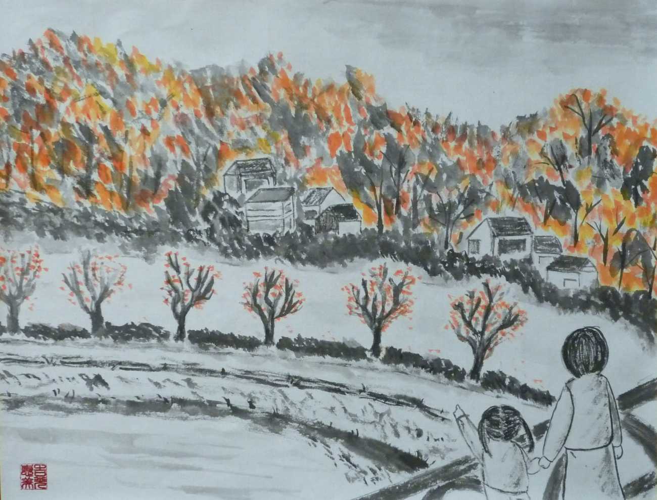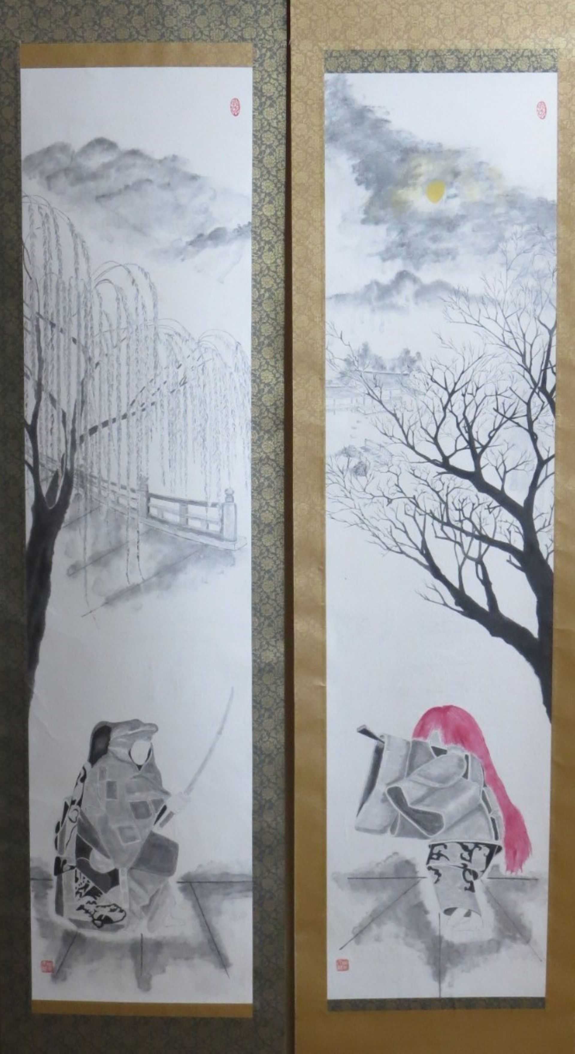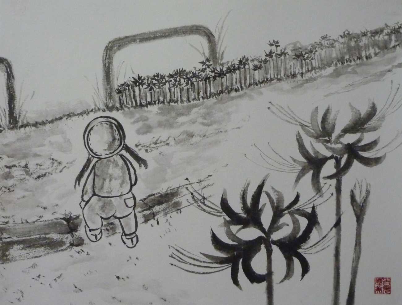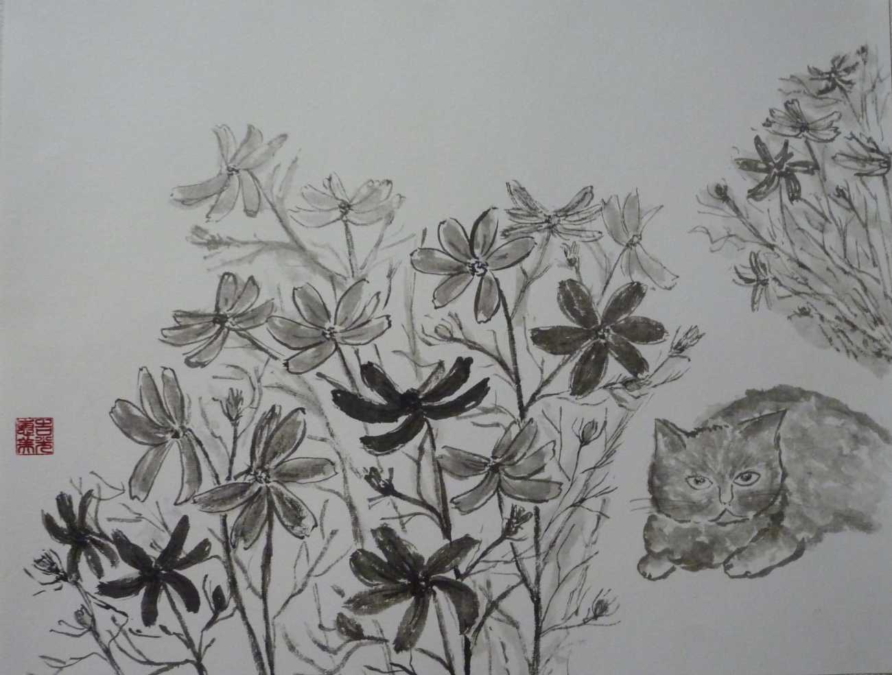 庭を見ると山茶花が満開で、鳥がその生け垣の中を動き回っているのが見えた。そこで「冬にいる庭かげにして山茶花の はな動かしてゐる小鳥あり」(中村憲吉)の短歌から、花を散らすのは小鳥なのか北風なのかと想像し制作した。左上に一重の花を、右下には八重の花を配置しバランスをとった。また、小鳥が花を揺らしている光景を表現するのに鳥の位置や向きを最後まで調整した。