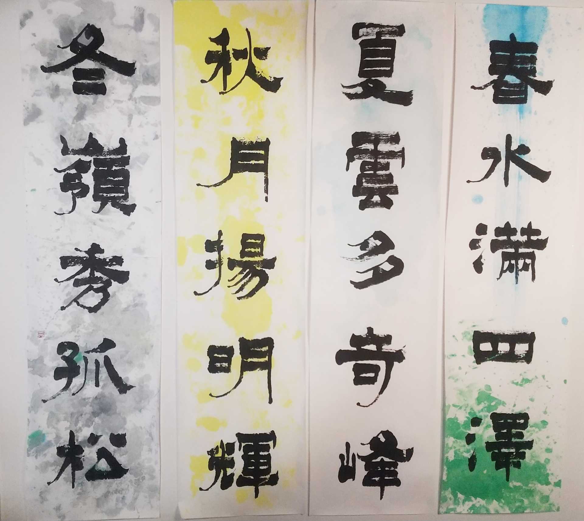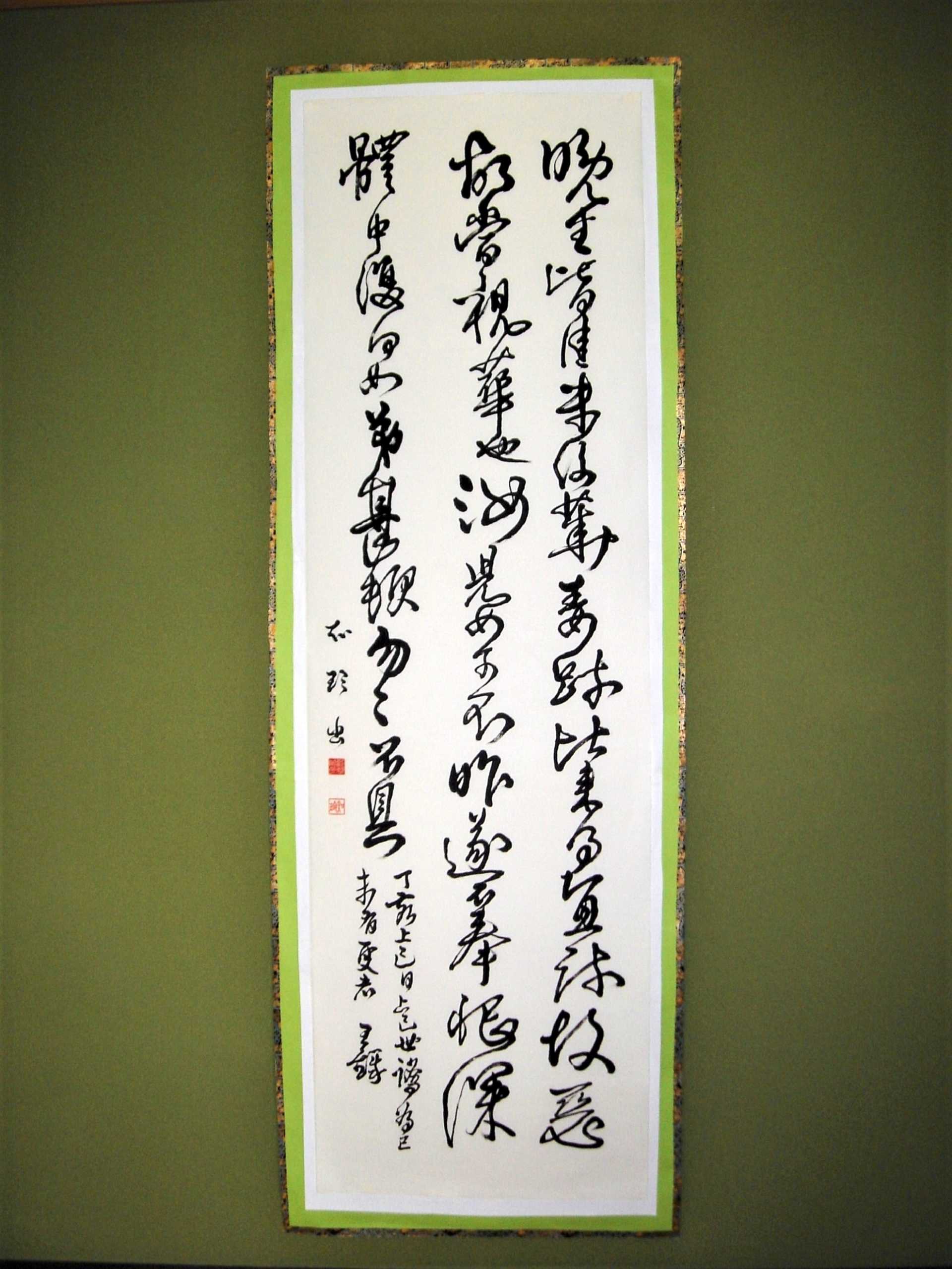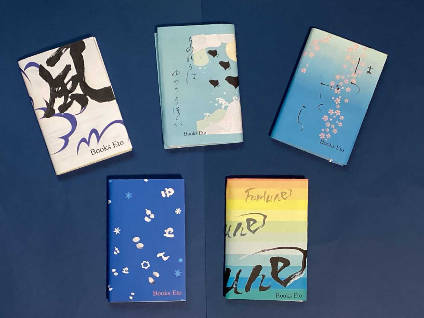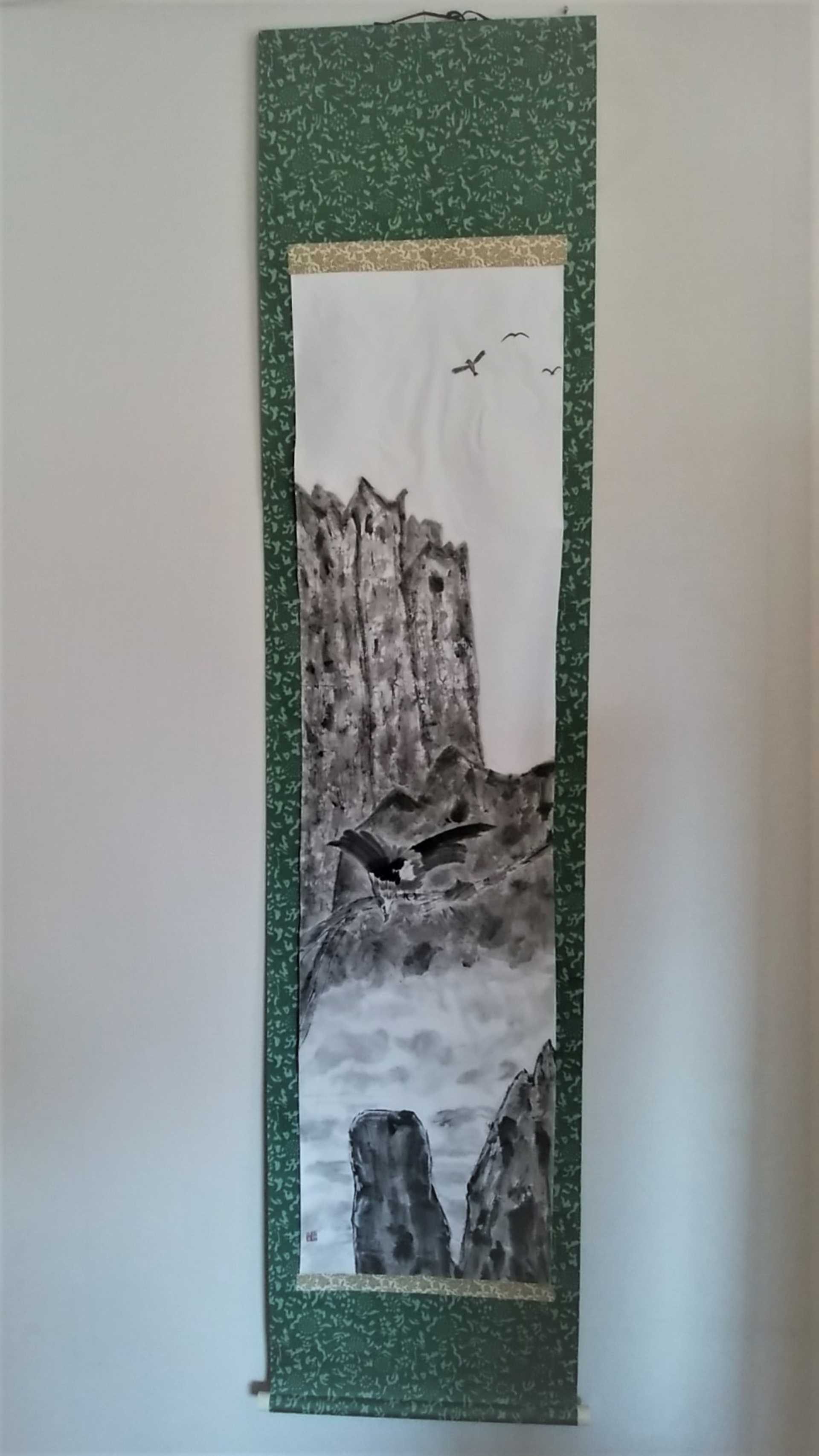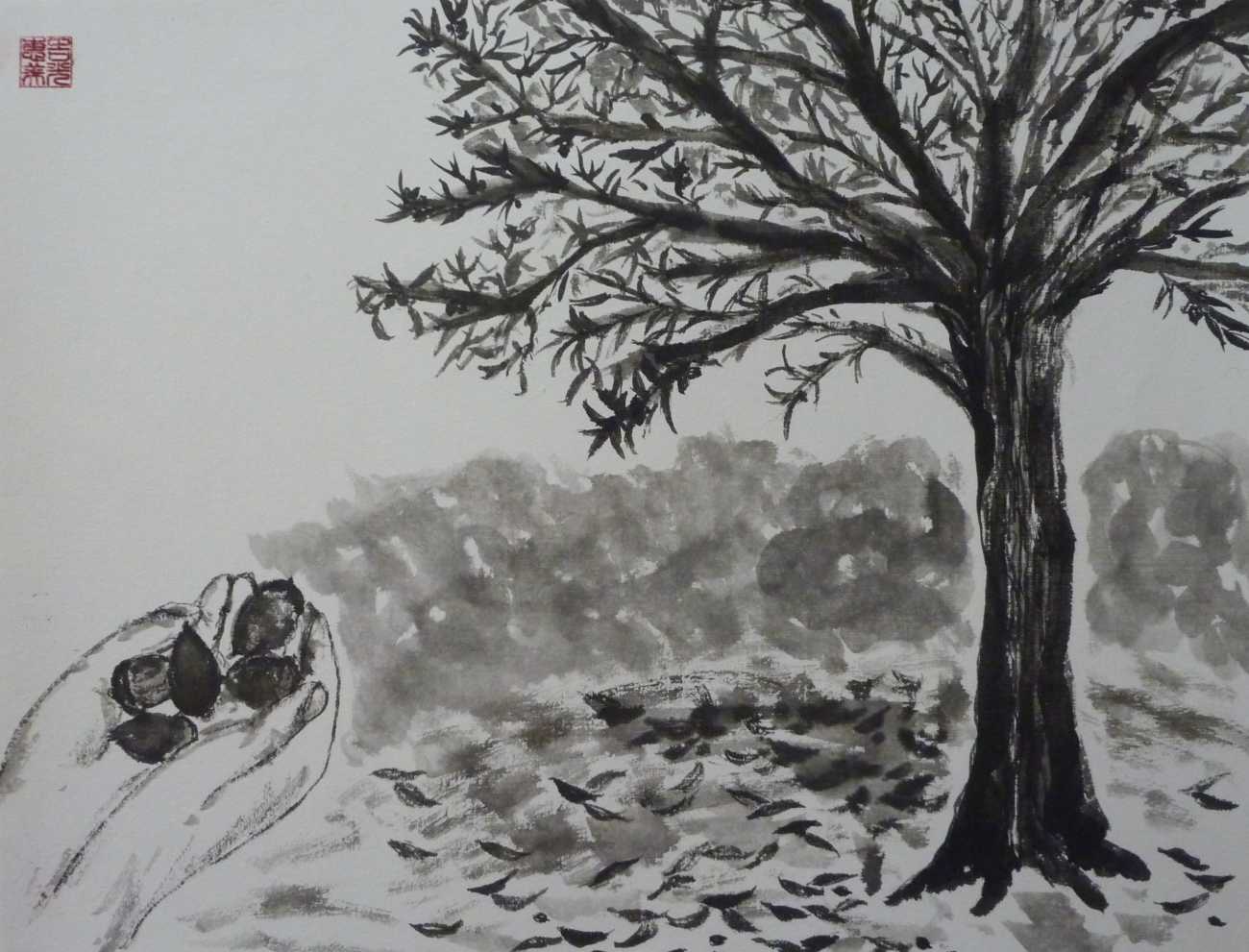 庭を見ると山茶花が満開で、鳥がその生け垣の中を動き回っているのが見えた。そこで「冬にいる庭かげにして山茶花の はな動かしてゐる小鳥あり」(中村憲吉)の短歌から、花を散らすのは小鳥なのか北風なのかと想像し制作した。左上に一重の花を、右下には八重の花を配置しバランスをとった。また、小鳥が花を揺らしている光景を表現するのに鳥の位置や向きを最後まで調整した。