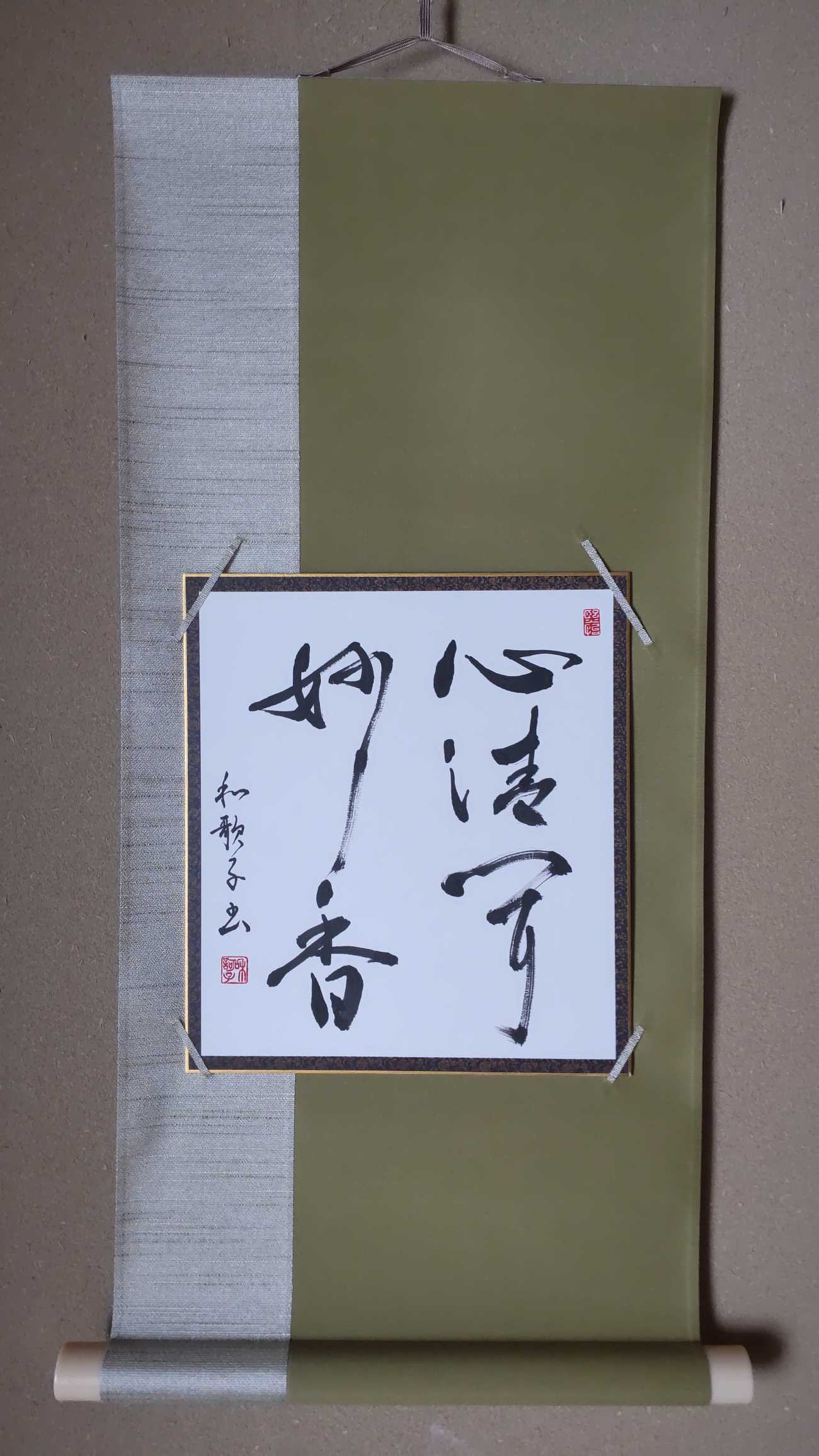 「心清聞妙香」とは中国唐代の詩人・杜甫の「大雲寺賛公房四首」の一節で、「心を清らかにして、妙なる香りを聞く」という意味である。お香を焚きながら書を嗜むことが好きなのでこの言葉を選び、床の間に飾る掛け軸の作品に仕上げた。墨を磨り静かに書と向き合う時間は、自分自身と向き合う時間でもあり、印首印の「熙怡(きい)」という字の如く、今後も和やかに楽しみながら書を続けていきたい、という思いを込めて卒業制作に挑んだ