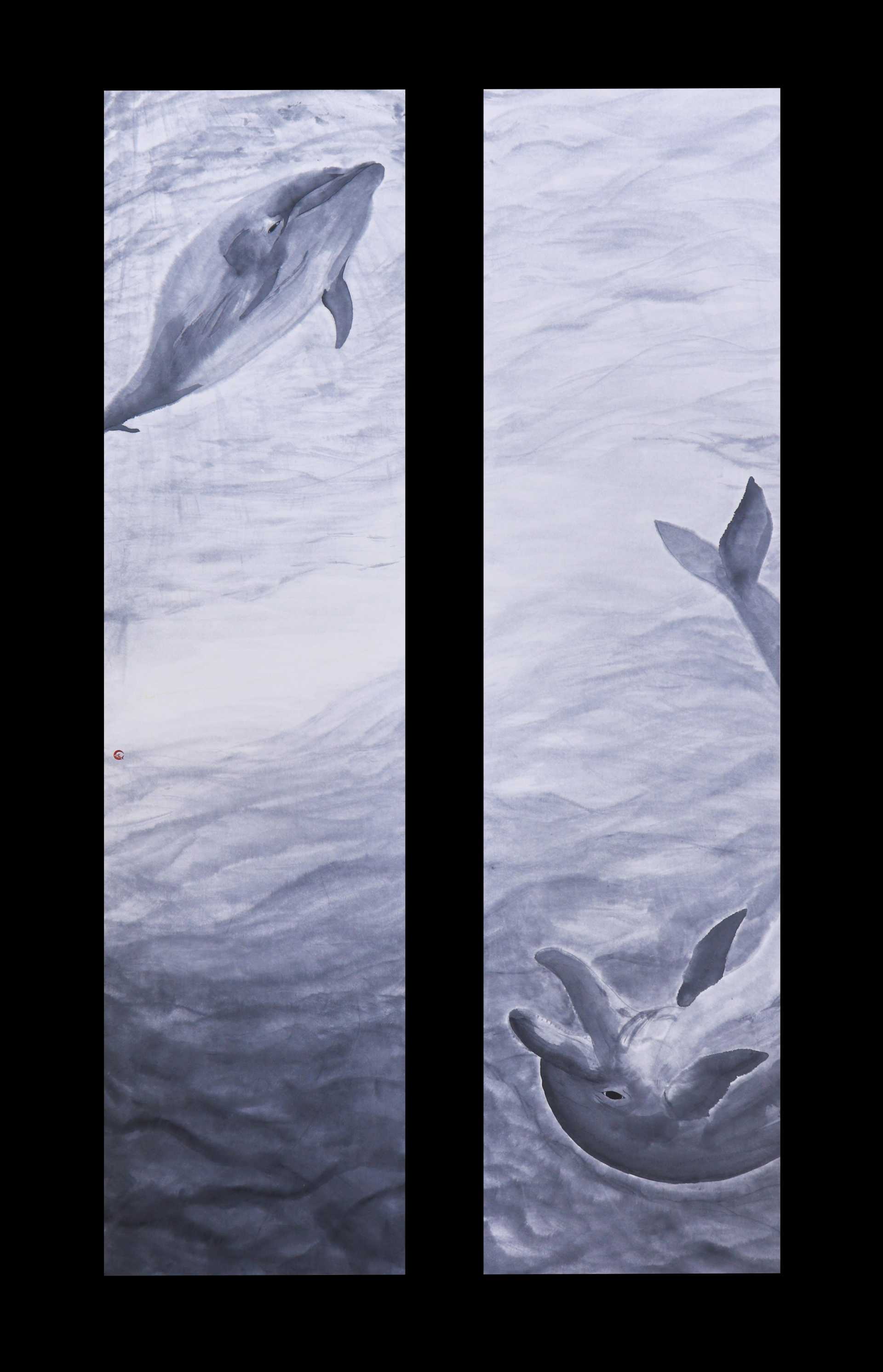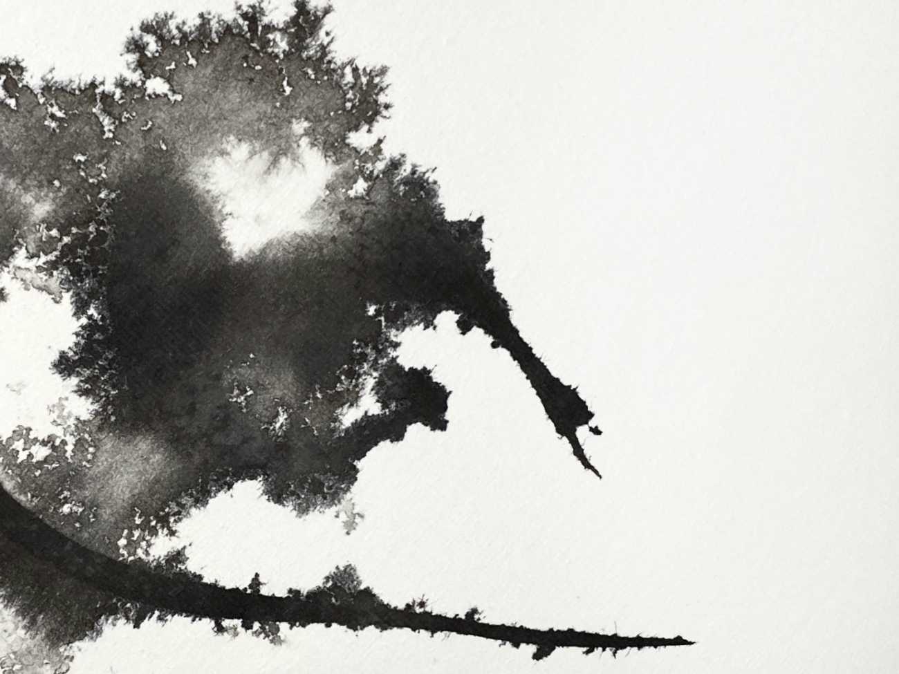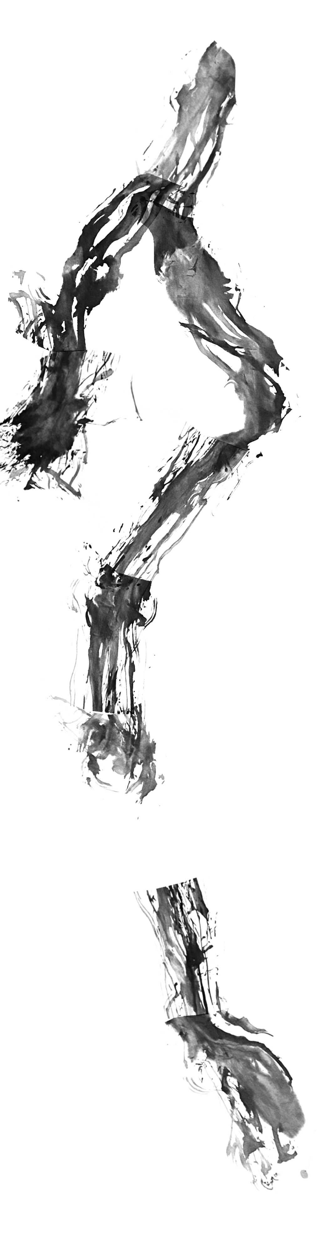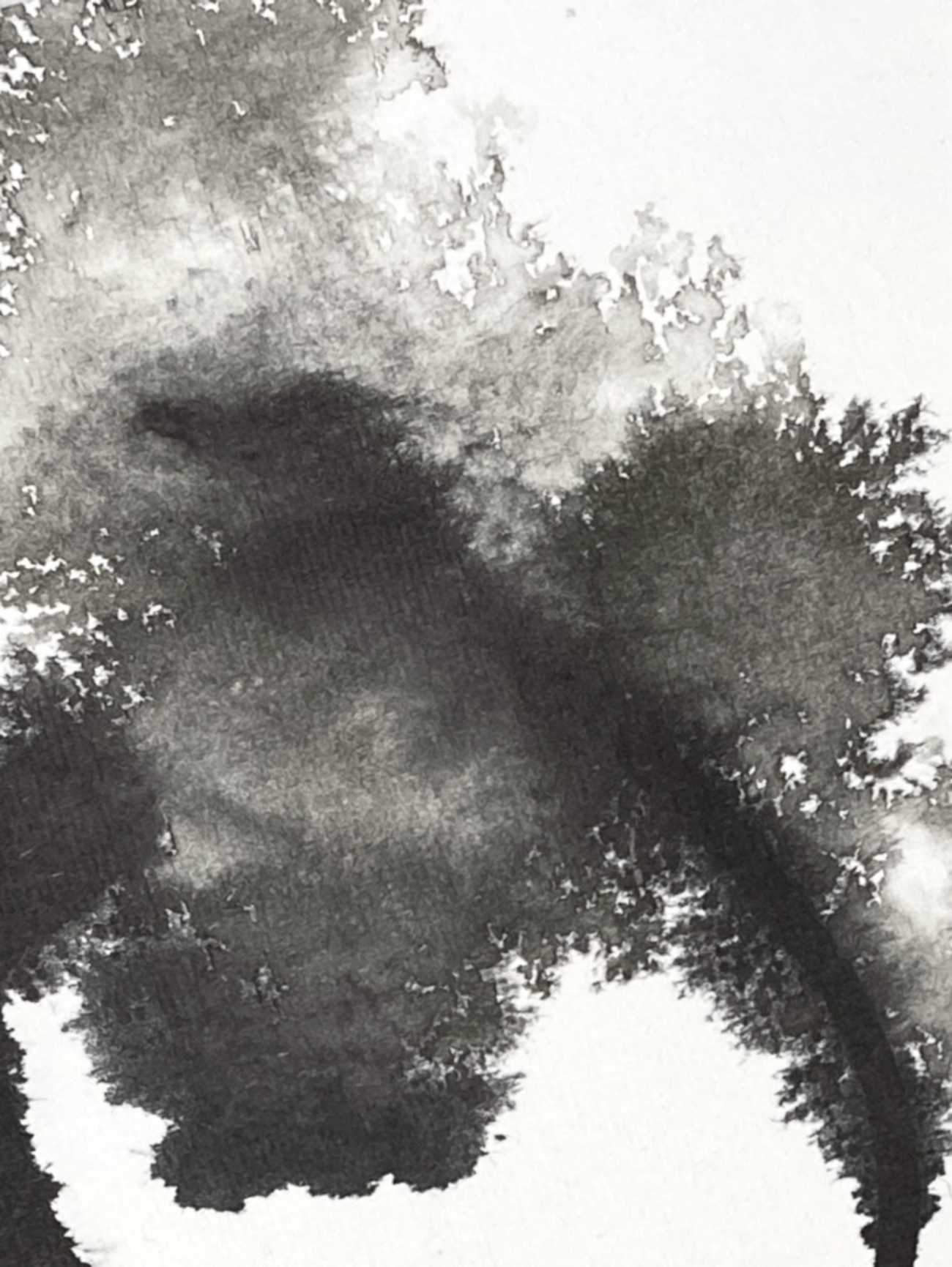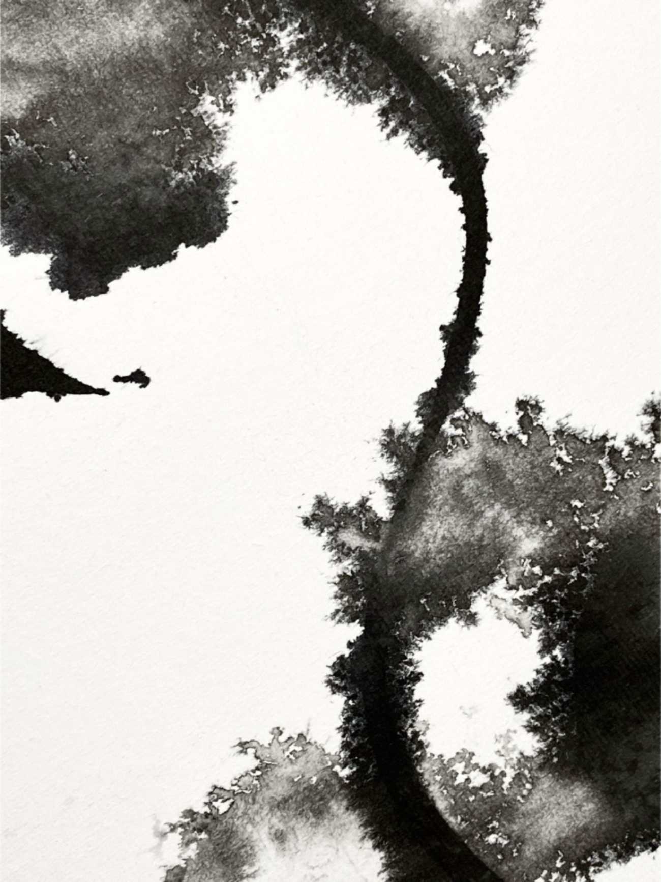 SNSでの誹謗中傷、対立や分断に心を翻弄される現代人。ニーチェの『善悪の彼岸』第146節の有名な一文「Und wenn du lange in einen Abgrund blickst, blickt der Abgrund auch in dich hinein.(深淵を覗くとき、深淵もまたこちらを覗いている。)」をキーボードで入力した動きをモチーフに、デジタル空間での言葉が心に影響を及ぼし、SNSの深淵に侵食されていく様を墨の滲みに託して表現した。