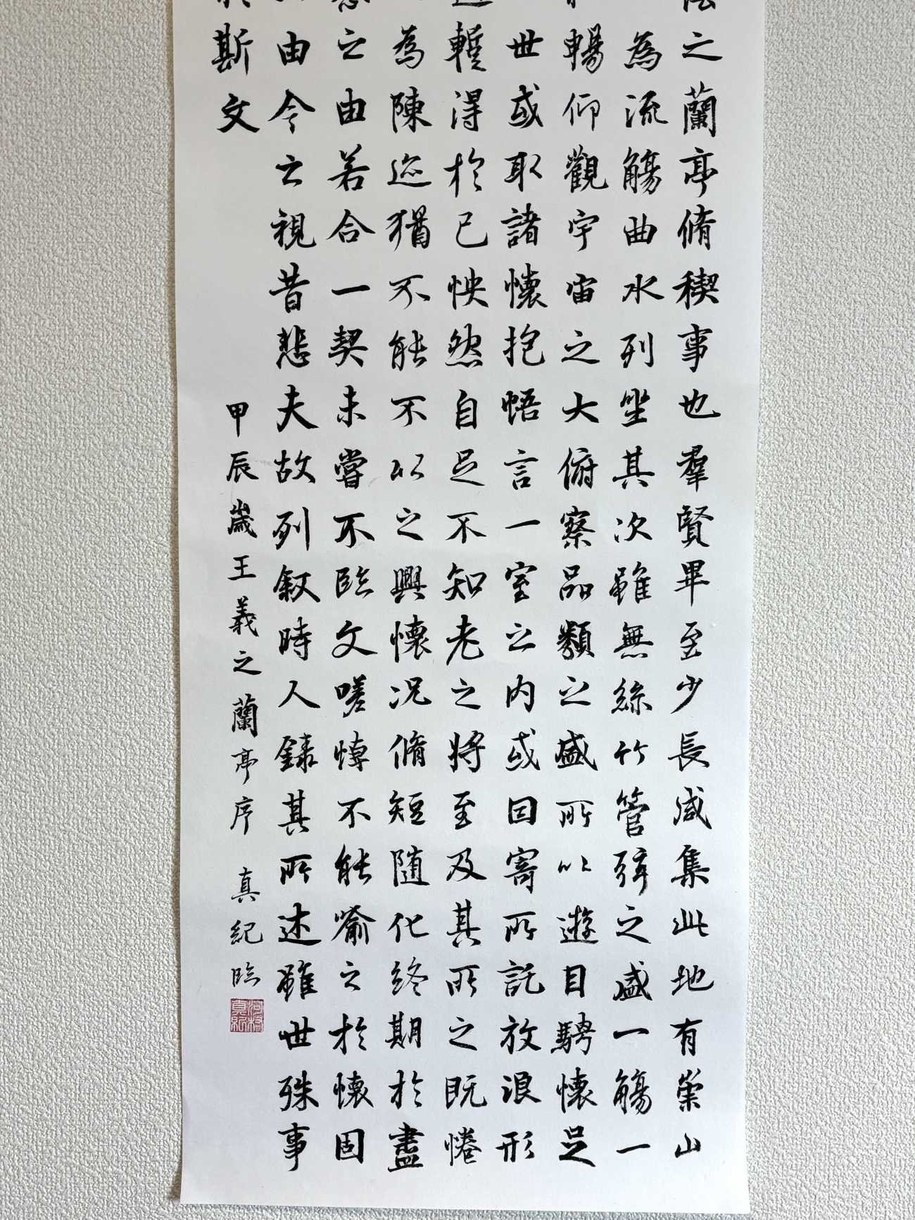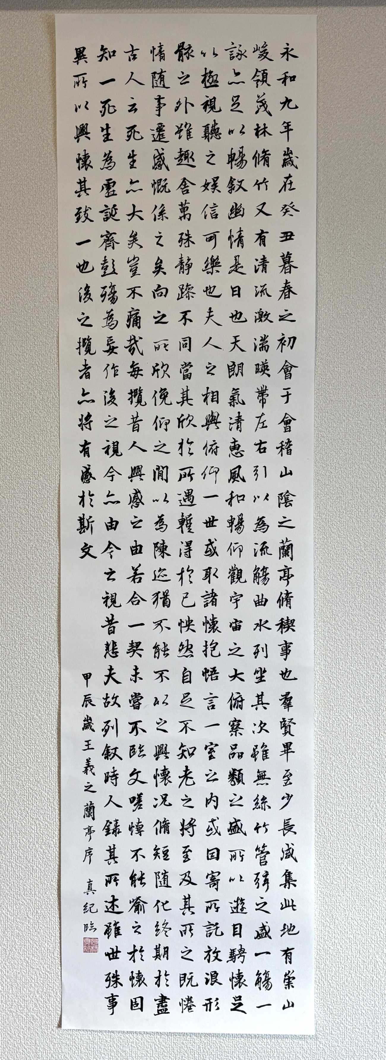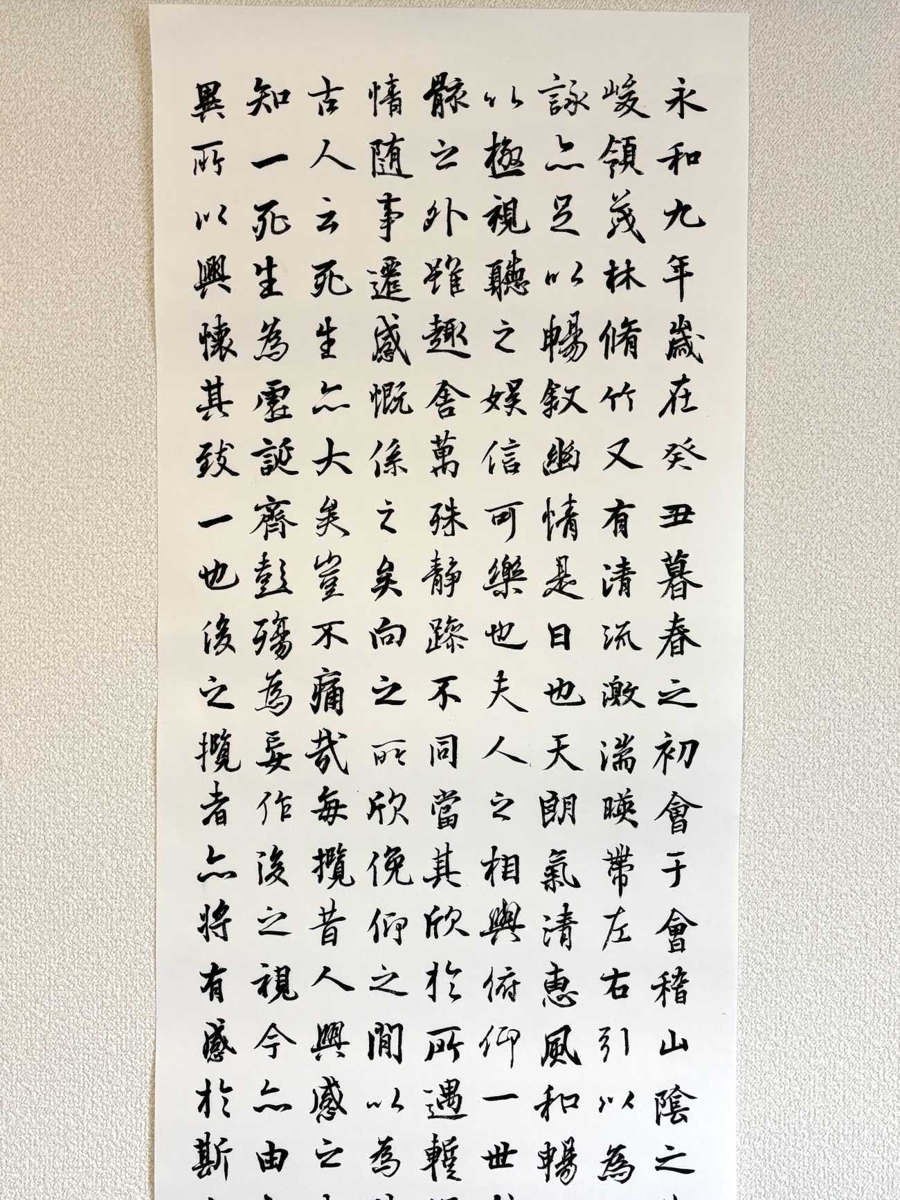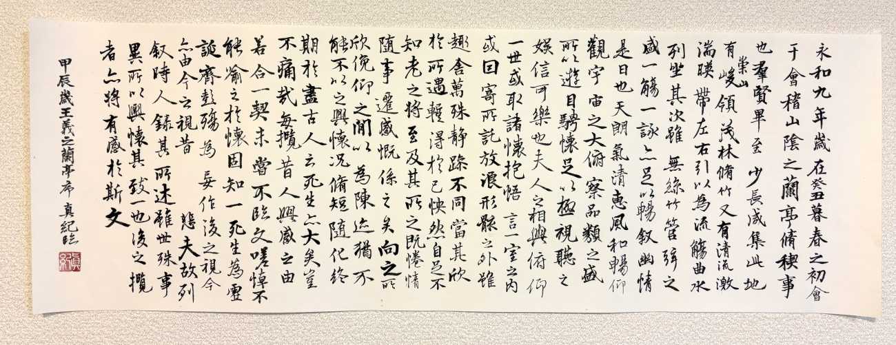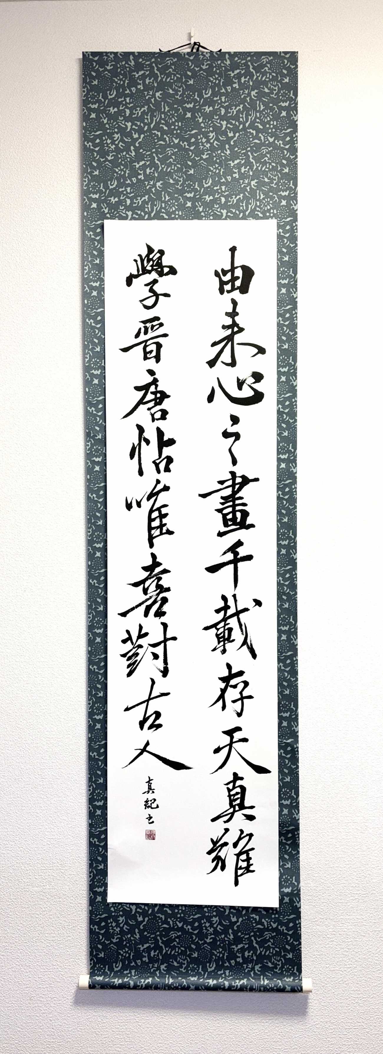 卒業生作の11月、屋久島で、雨の中、大自然の空気を胸いっぱい吸いながらトレッキングをした。自然の中樹齢1,000年を超える屋久杉、ただそこに生き続けている大自然を感じ、その体験がまさにこの詩そのもの。古心の墨の香りが、雨の降る中の自然の香りを思いおこし、情景を思い浮かべ、制作した。