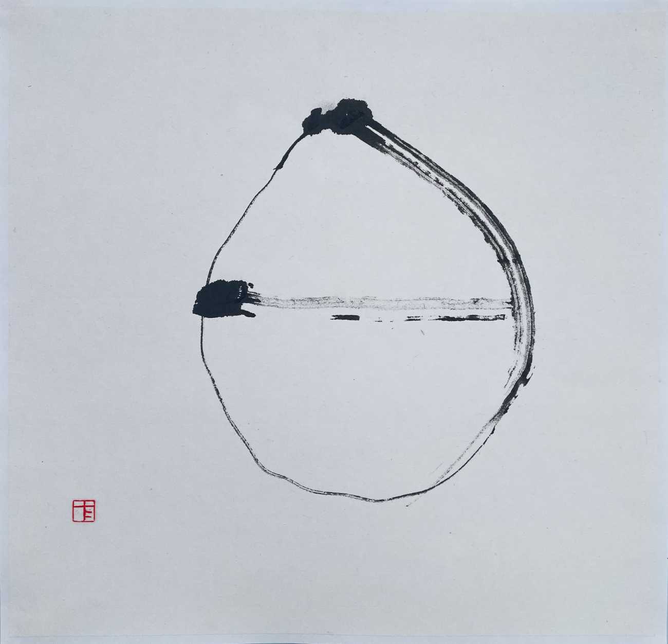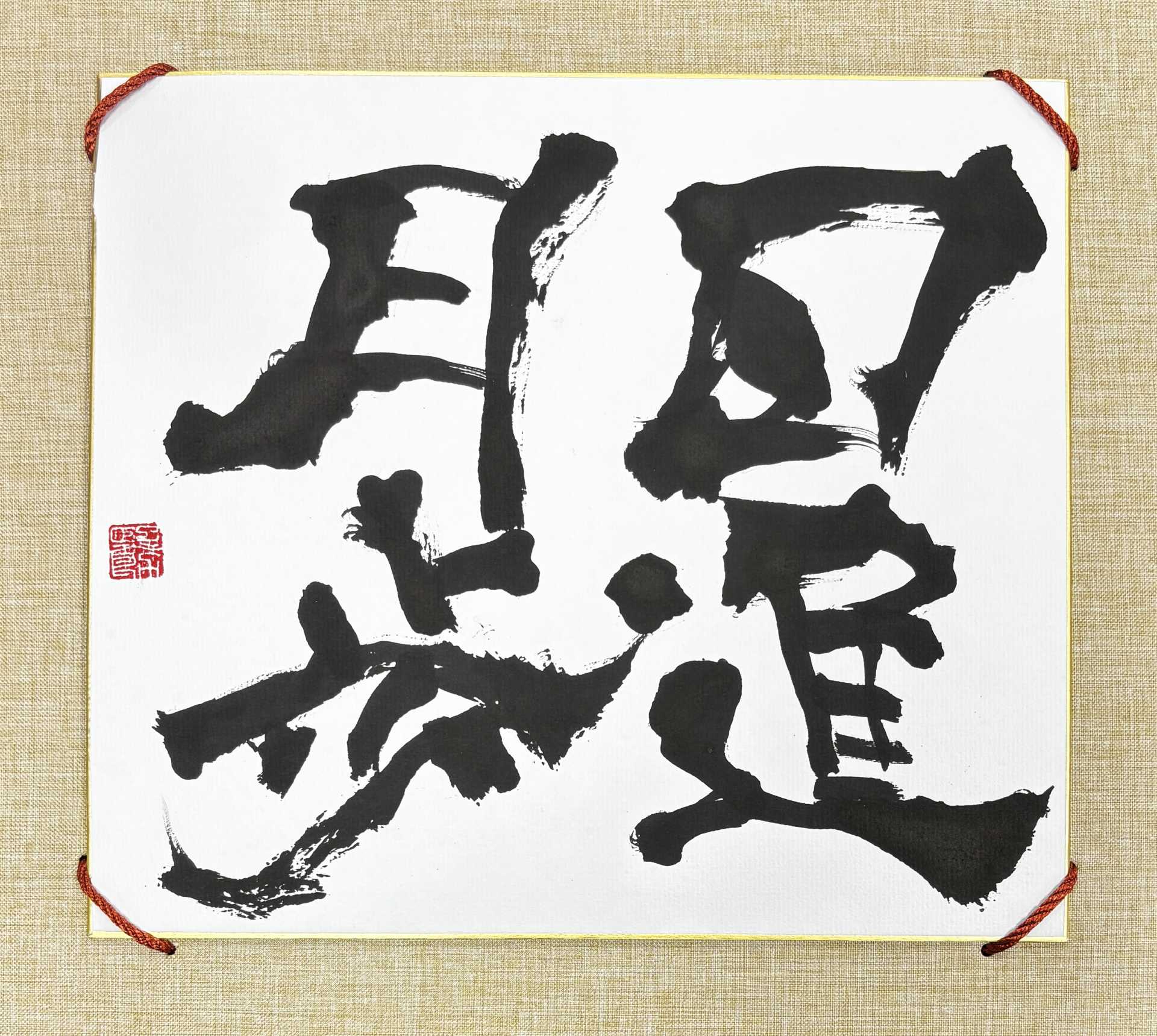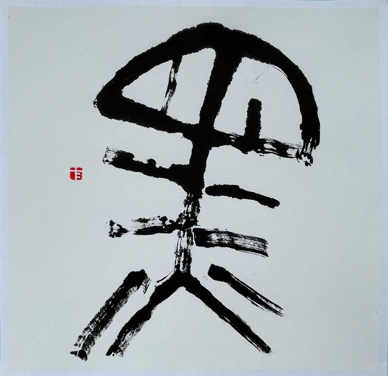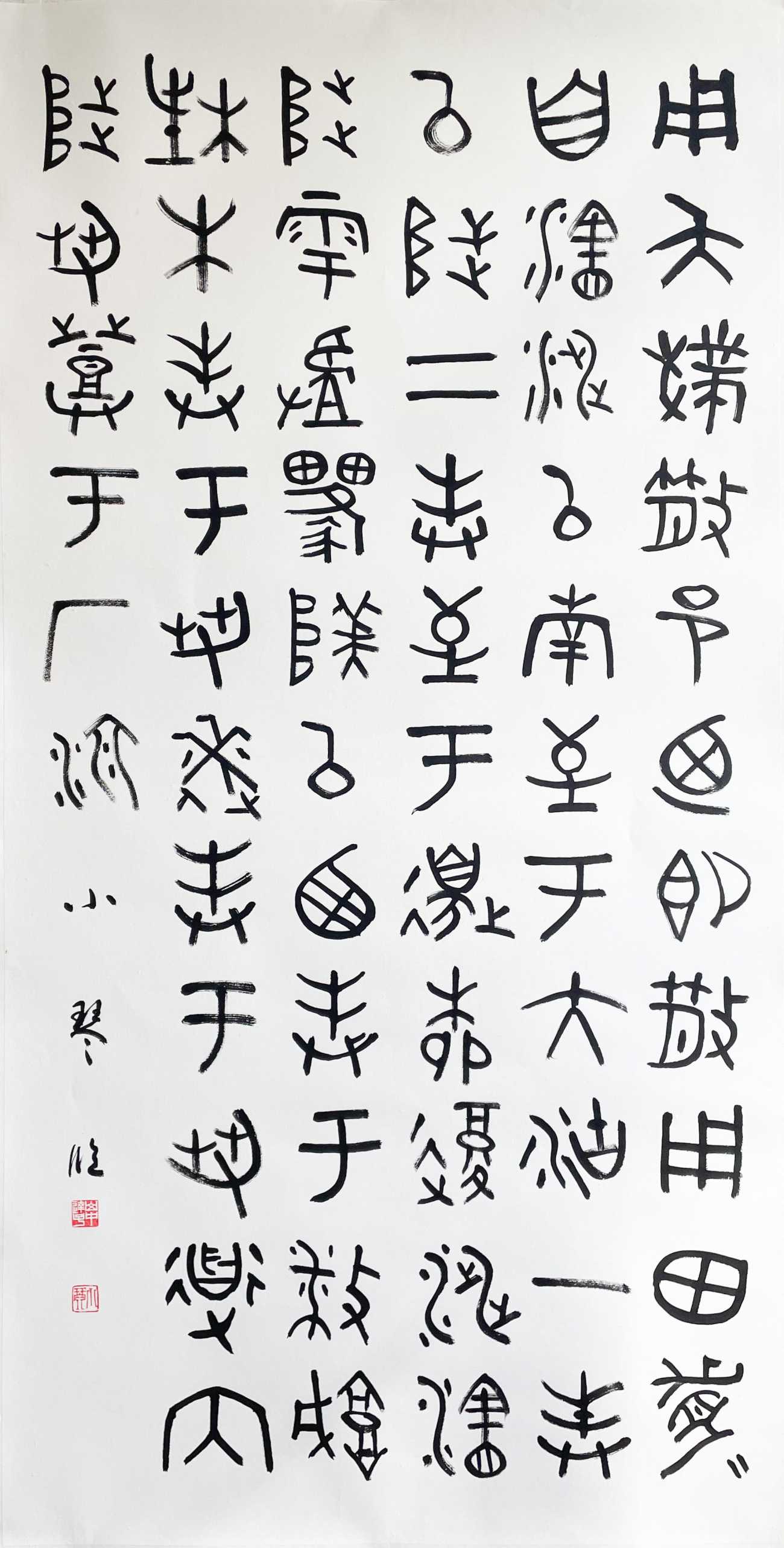 書画の黒と白は、いつも隣合わせだ。真逆の様で、実は光と影の様に巧みに呼応し合い、互いが互いを創造する。黒と白の無限にある組み合わせが、数多の作品を生み出して行く。そんな不可分で絶妙な関係性を、「黒」と「白」を一対にすることで表現した。モチーフは、悠久を生きても、今なお新しい神秘的な金文、線は気まぐれな紙のコヨリに委ねた。