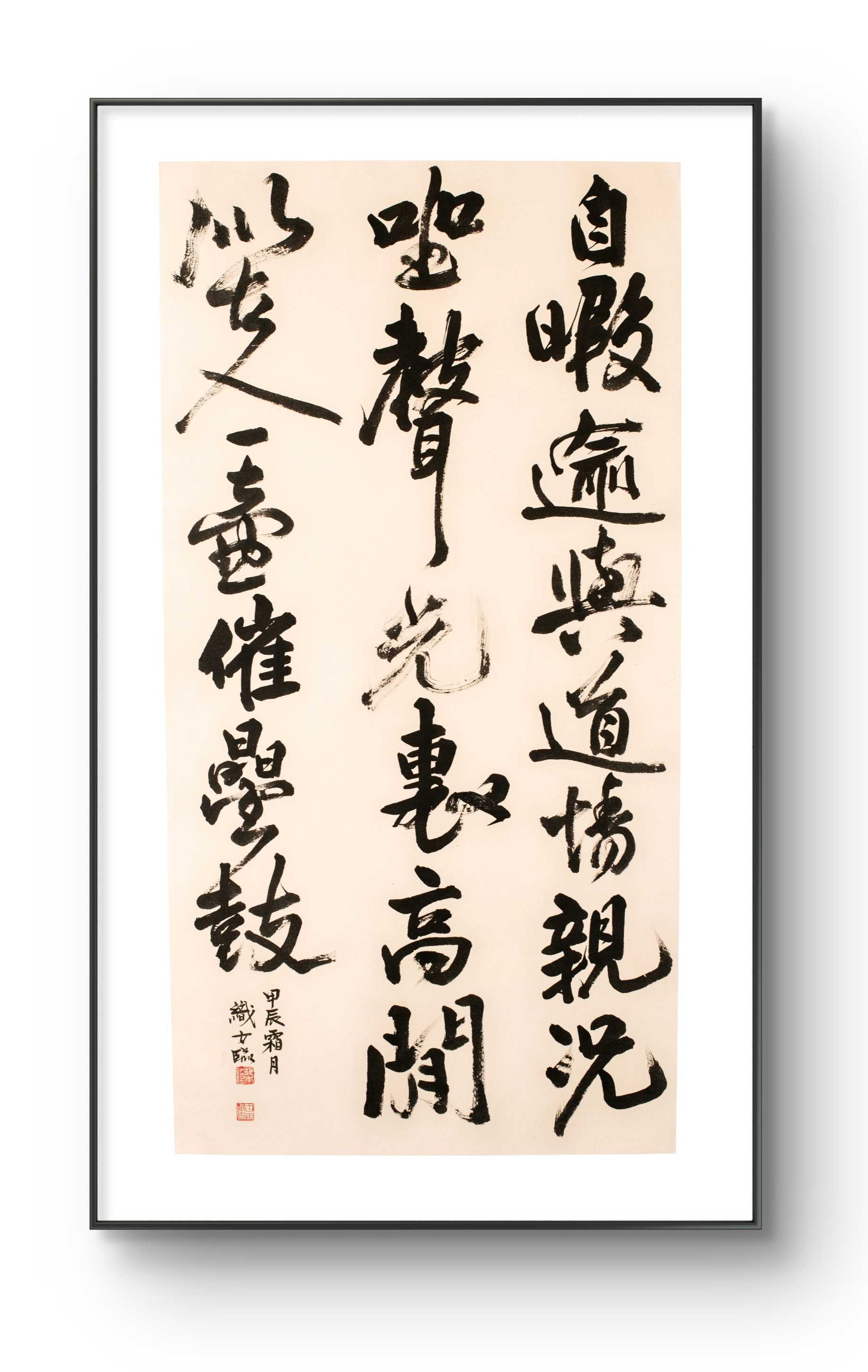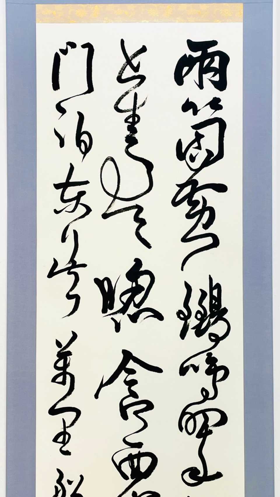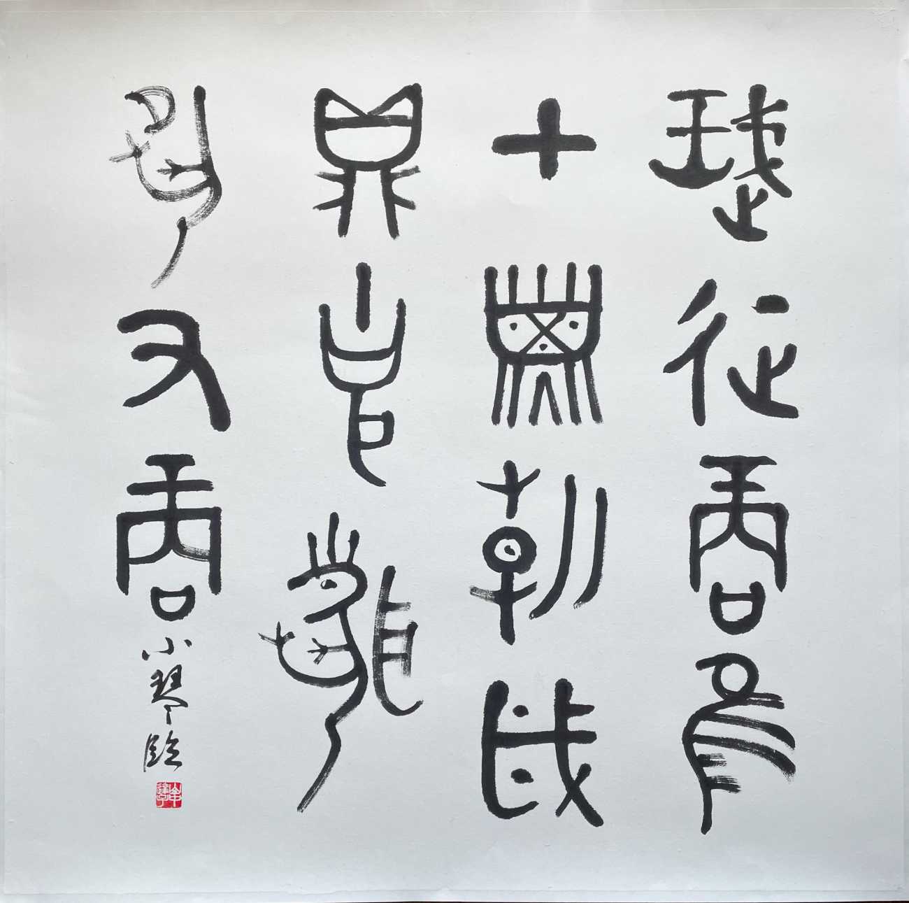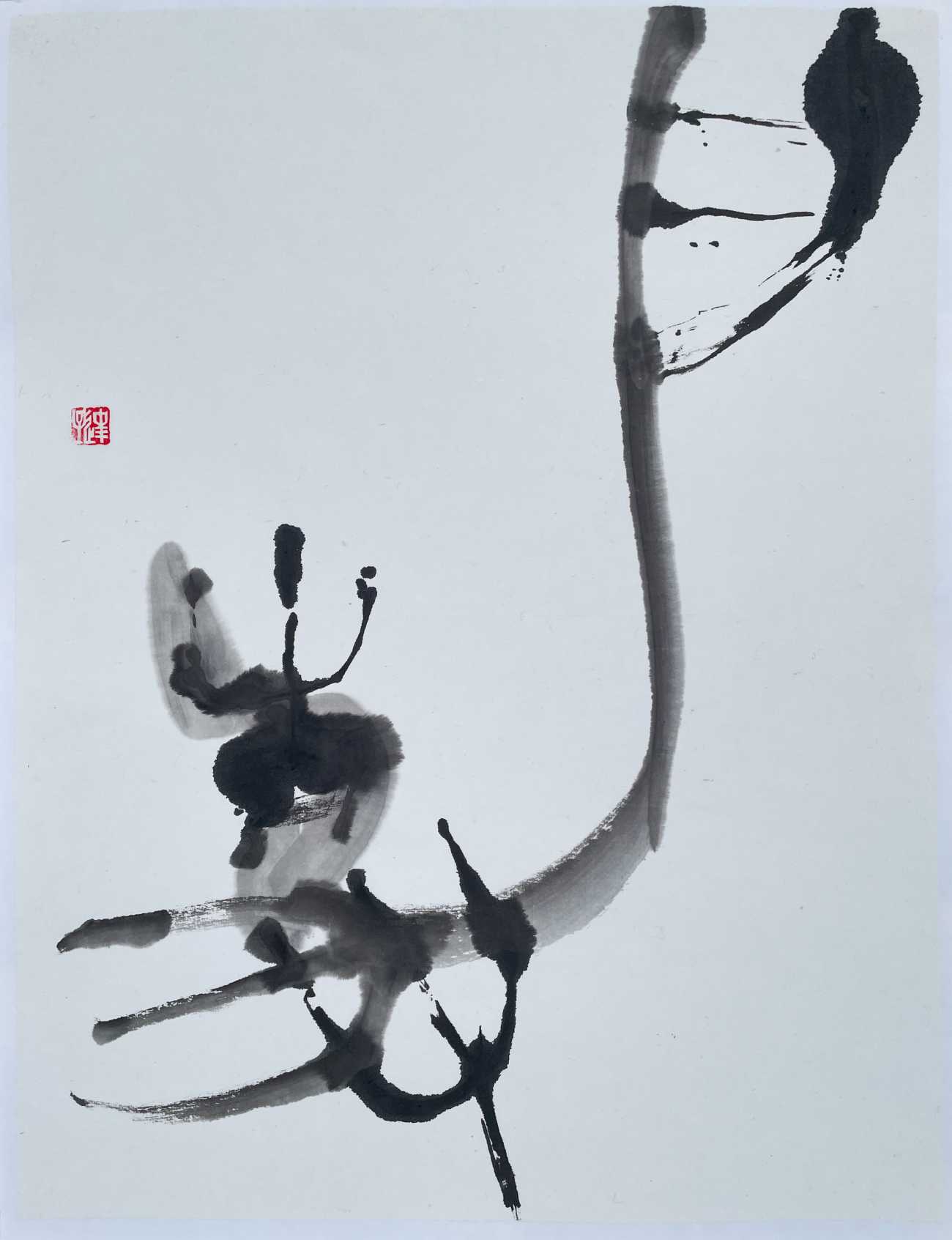 書画の黒と白は、いつも隣合わせだ。真逆の様で、実は光と影の様に巧みに呼応し合い、互いが互いを創造する。黒と白の無限にある組み合わせが、数多の作品を生み出して行く。そんな不可分で絶妙な関係性を、「黒」と「白」を一対にすることで表現した。モチーフは、悠久を生きても、今なお新しい神秘的な金文、線は気まぐれな紙のコヨリに委ねた。