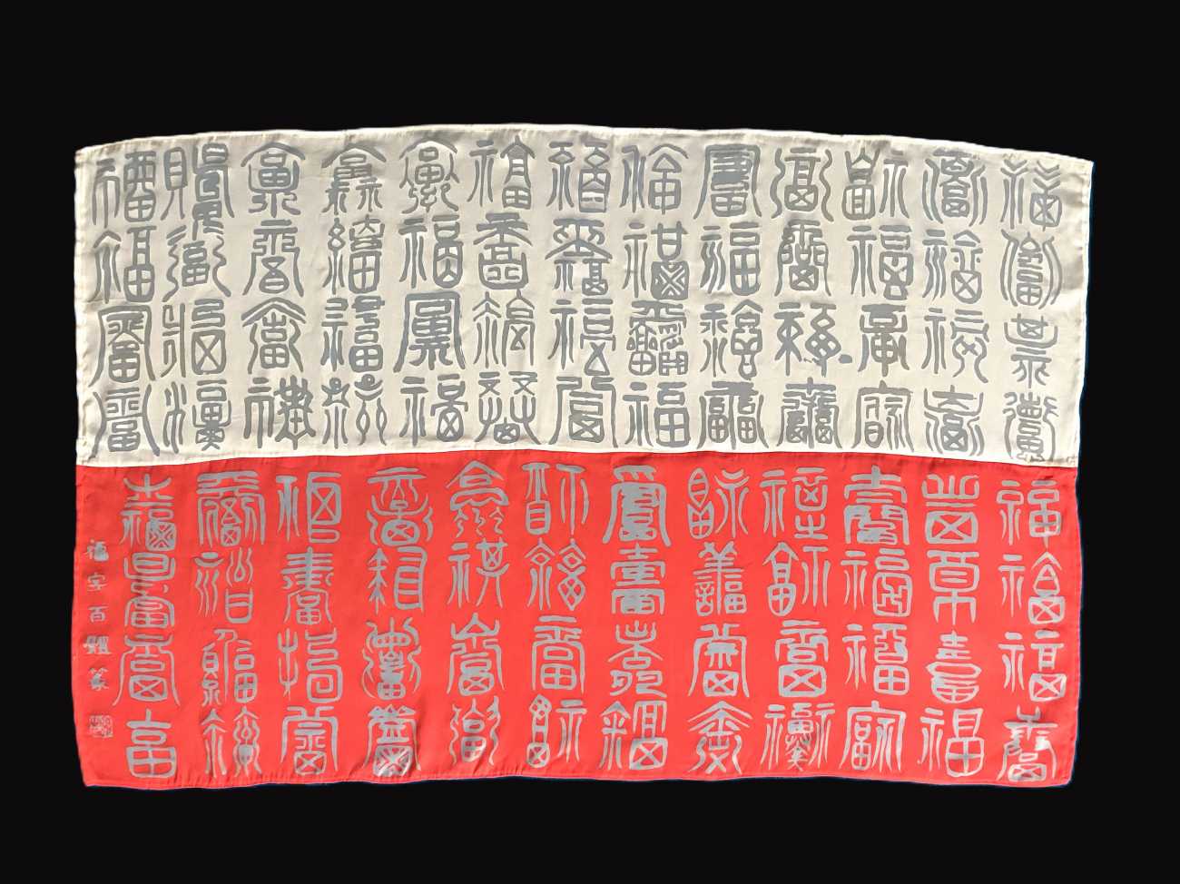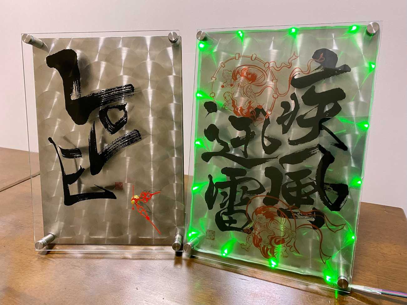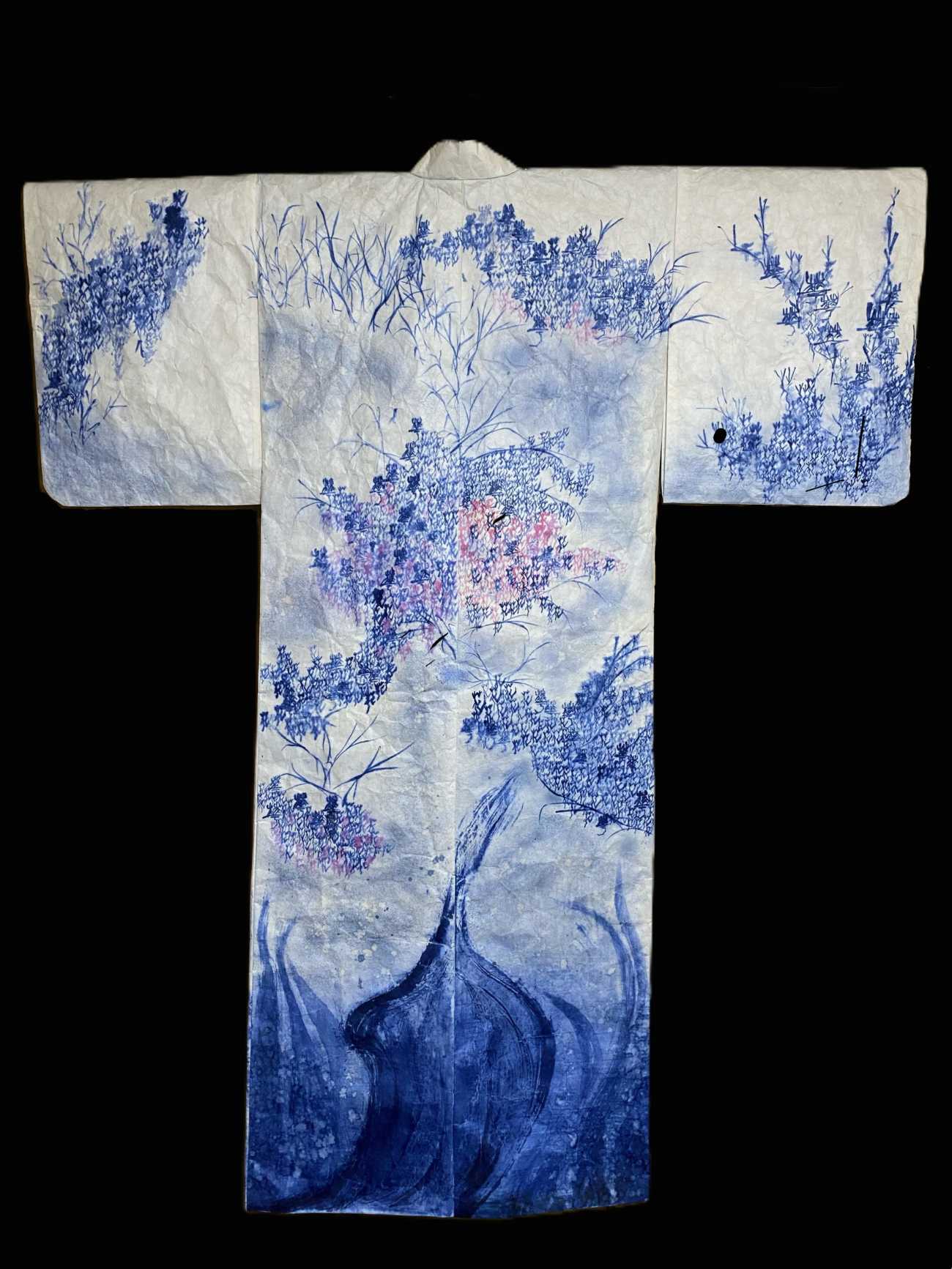「あおばな」は、江戸時代から滋賀県草津市の花として栽培され、花弁から絞った汁を着物の友禅染などの下絵描きとして日本の伝統を支えてきました。現状を知り、この花の需要を増やすには書で応援すると考え、水で溶けてしまう儚い花を主役にと「あおばな」と向き合いました。花の色を留める方法を考える中で、特性を生かし制作することに成功し、その集大成として和紙着物を作成しました。書画同源を意識し甲骨文字で「花」「華」「木」を組み合わせて模様を書きました。