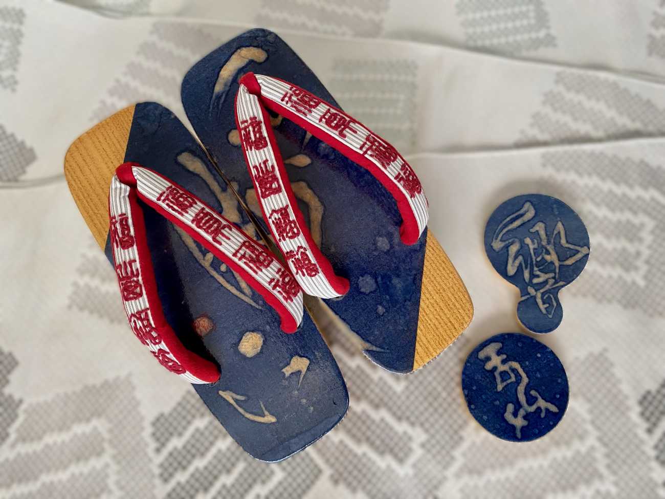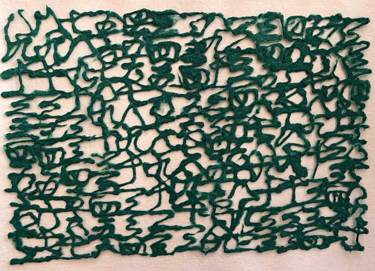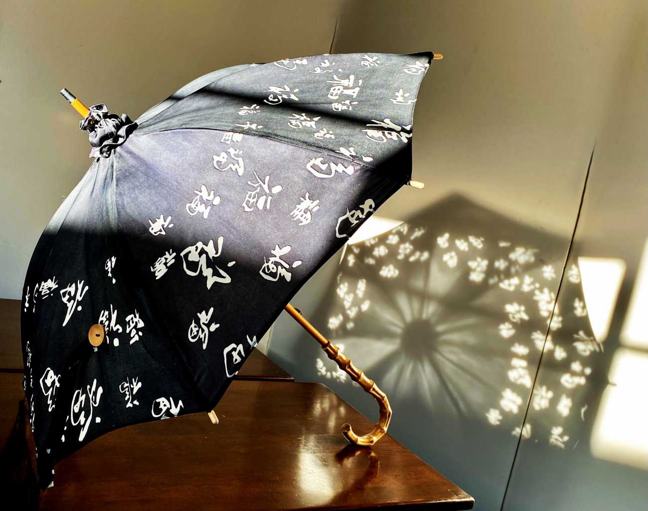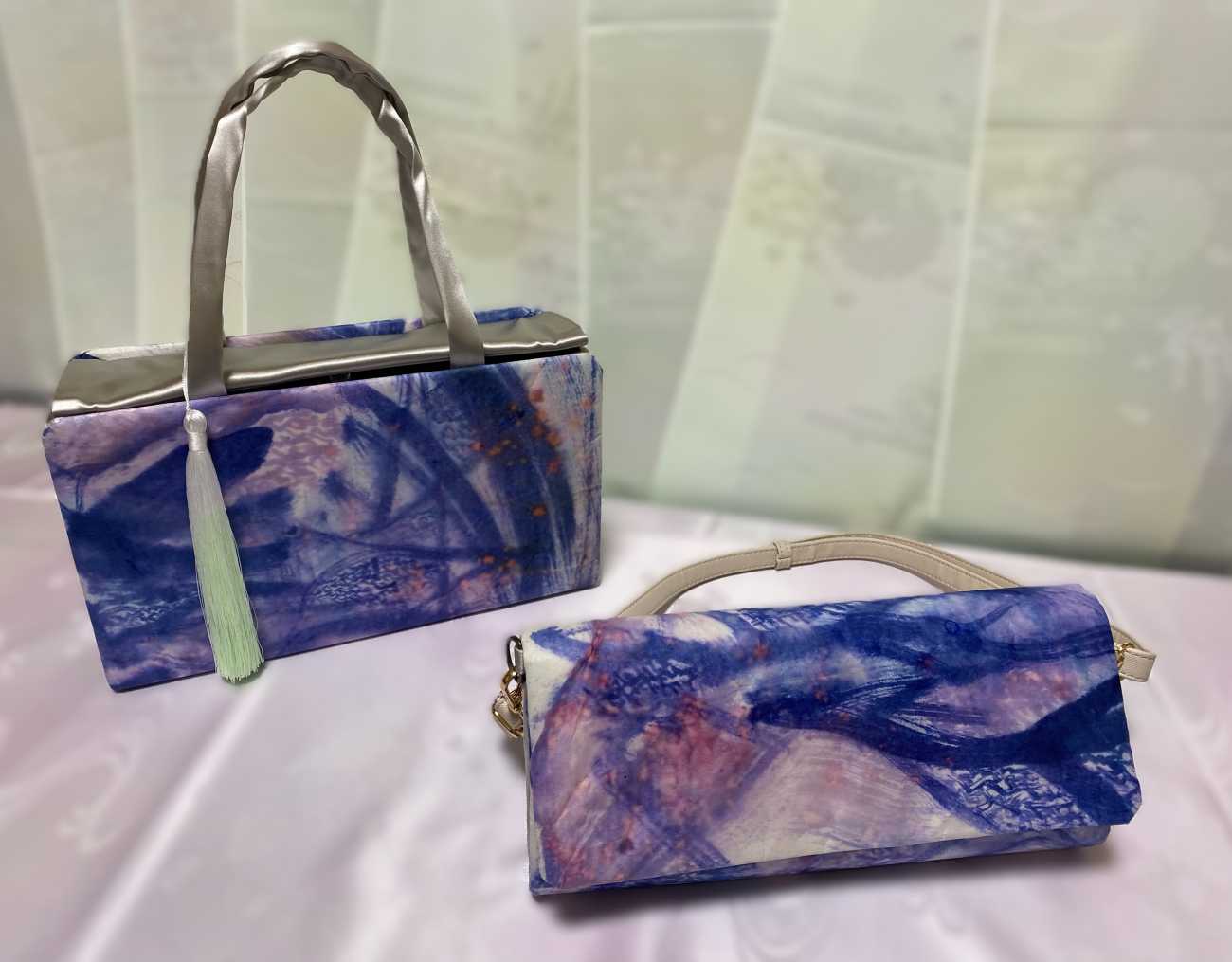 「あおばな」は、江戸時代から滋賀県草津市の花として栽培され、花弁から絞った汁を着物の友禅染などの下絵描きとして日本の伝統を支えてきました。現状を知り、この花の需要を増やすには書で応援すると考え、水で溶けてしまう儚い花を主役にと「あおばな」と向き合いました。花の色を留める方法を考える中で、特性を生かし制作することに成功し、その集大成として和紙着物を作成しました。書画同源を意識し甲骨文字で「花」「華」「木」を組み合わせて模様を書きました。
