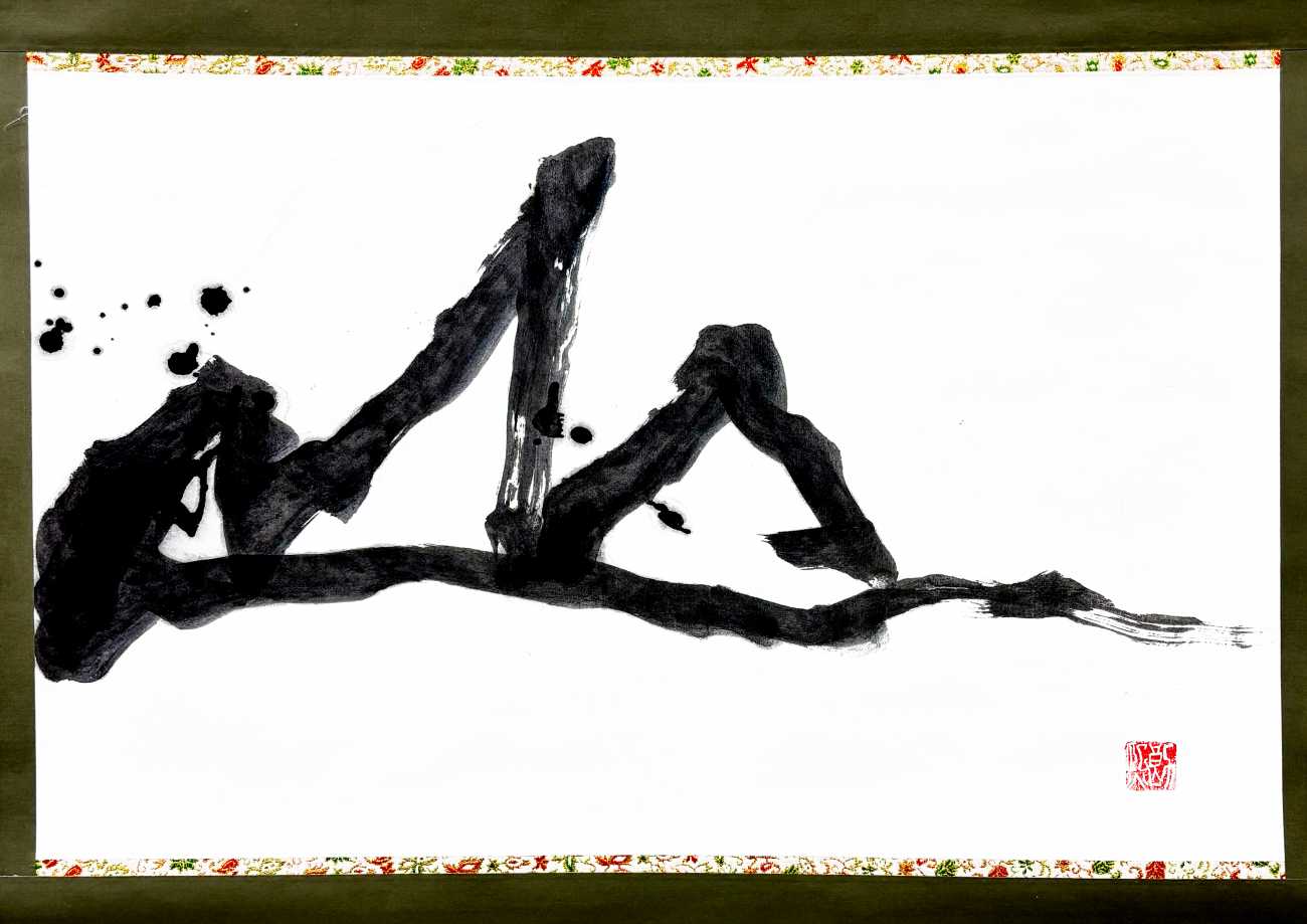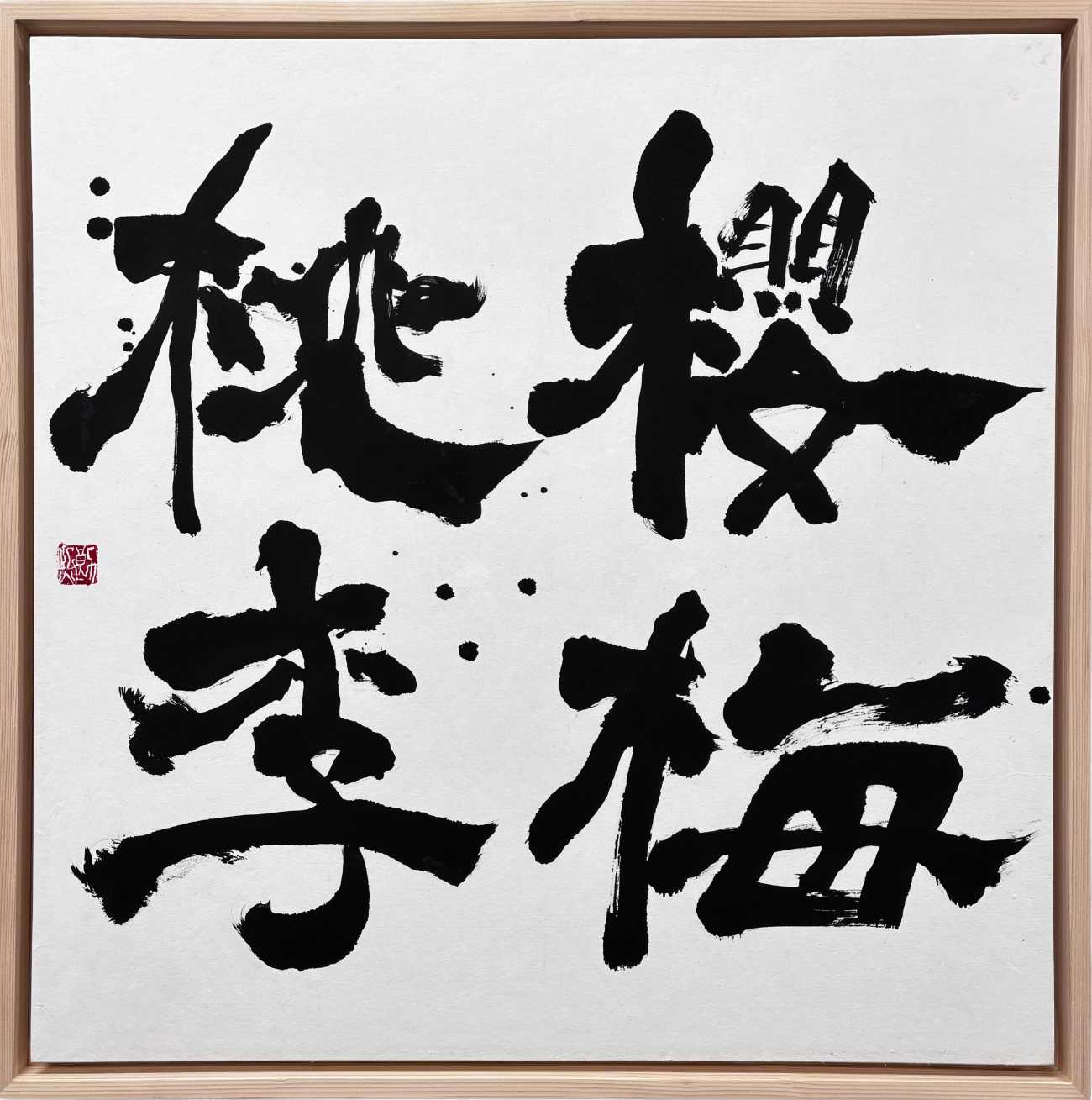 礼器碑を研究した上で、この書作品を完成させました。相対的に思える「軽妙かつ力強さ」をテーマに線質を意識しながら書き上げました。超長鋒を使うことで、想像のできない面白い線が出せるよう、遊び心も込めています。「日」という文字には、日が昇るイメージを持たせ、「進」には波磔が目立つよう意識し、「月」では三日月の反り具合を文字に込め、「歩」では力強く歩む姿を意識しました。