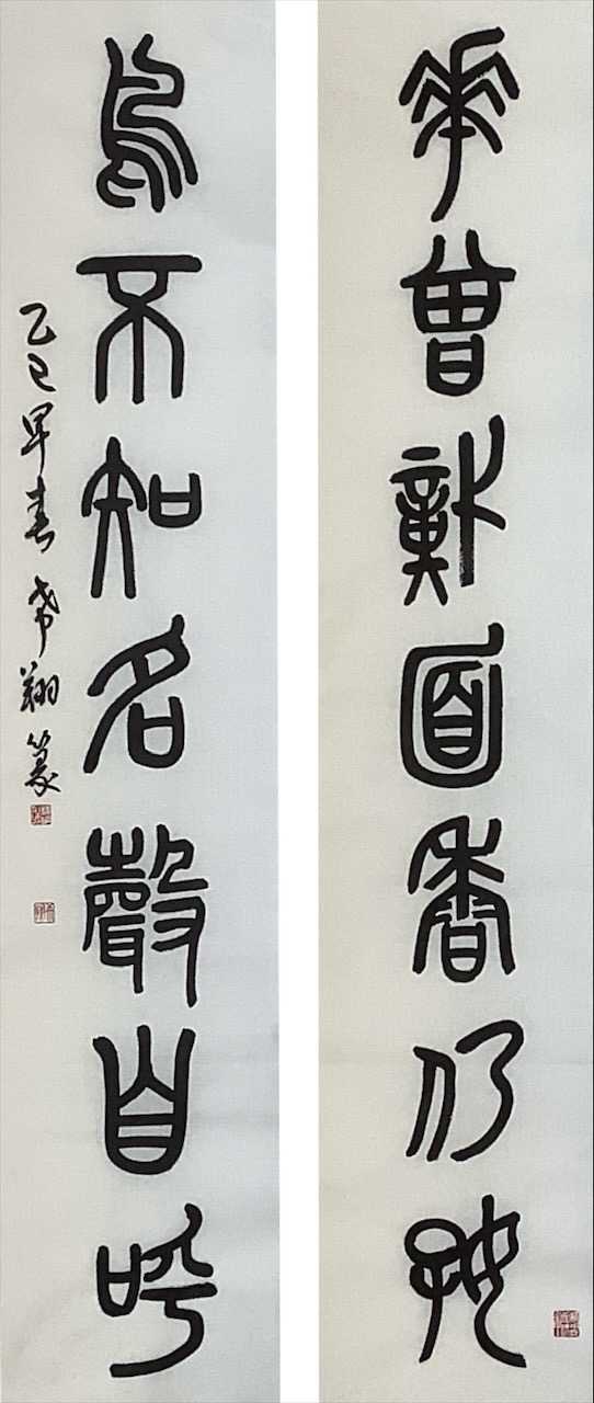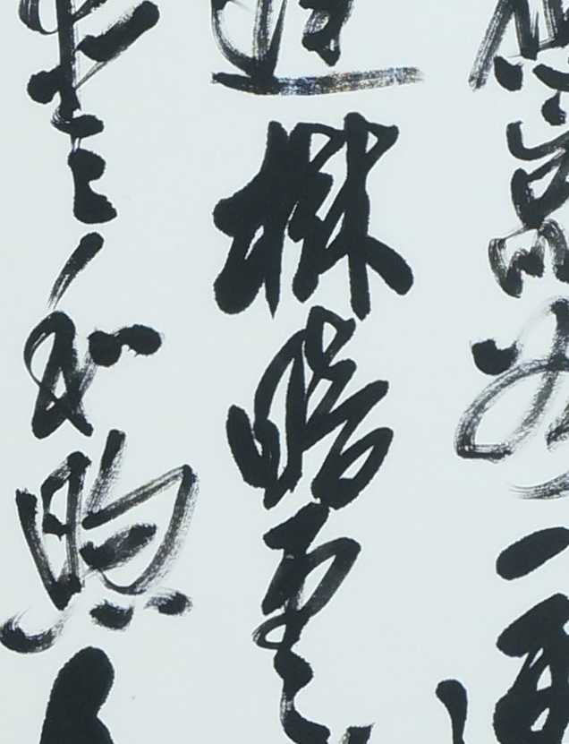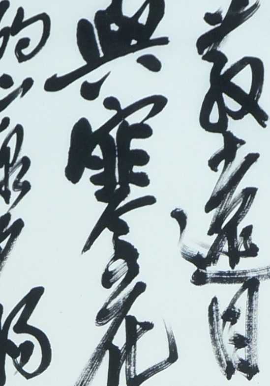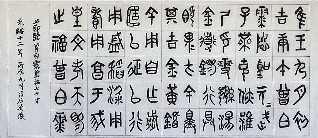 呉昌碩の行草作品の雰囲気を出すために、墨量はたっぷりと使いながらも自然な渇筆部分を大切にし、筆使いは蔵鋒・中鋒を基本とし力強い筆勢を表現した。また、呉昌碩特有の字形の文字を数点配するとともに、4行目は意識的に小さ目に書き呉昌碩の自在な書き振りを表現した。