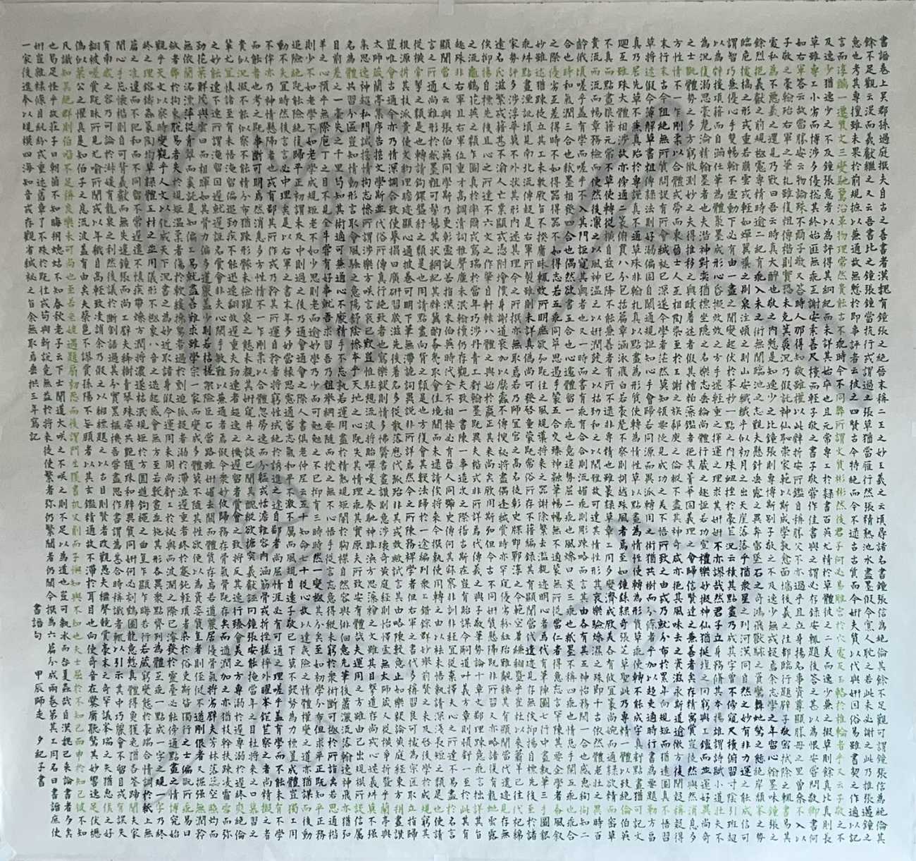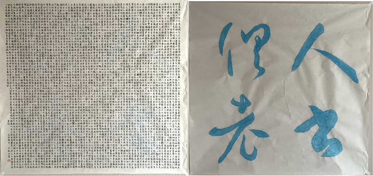 作品は2層になっており、下は「人書倶老」を水彩絵の具で、上には孫過庭『書譜』全文を書きました。下の書と重なる上の部分は美藍で書き、下の字がきれいに透けるようにしました。
