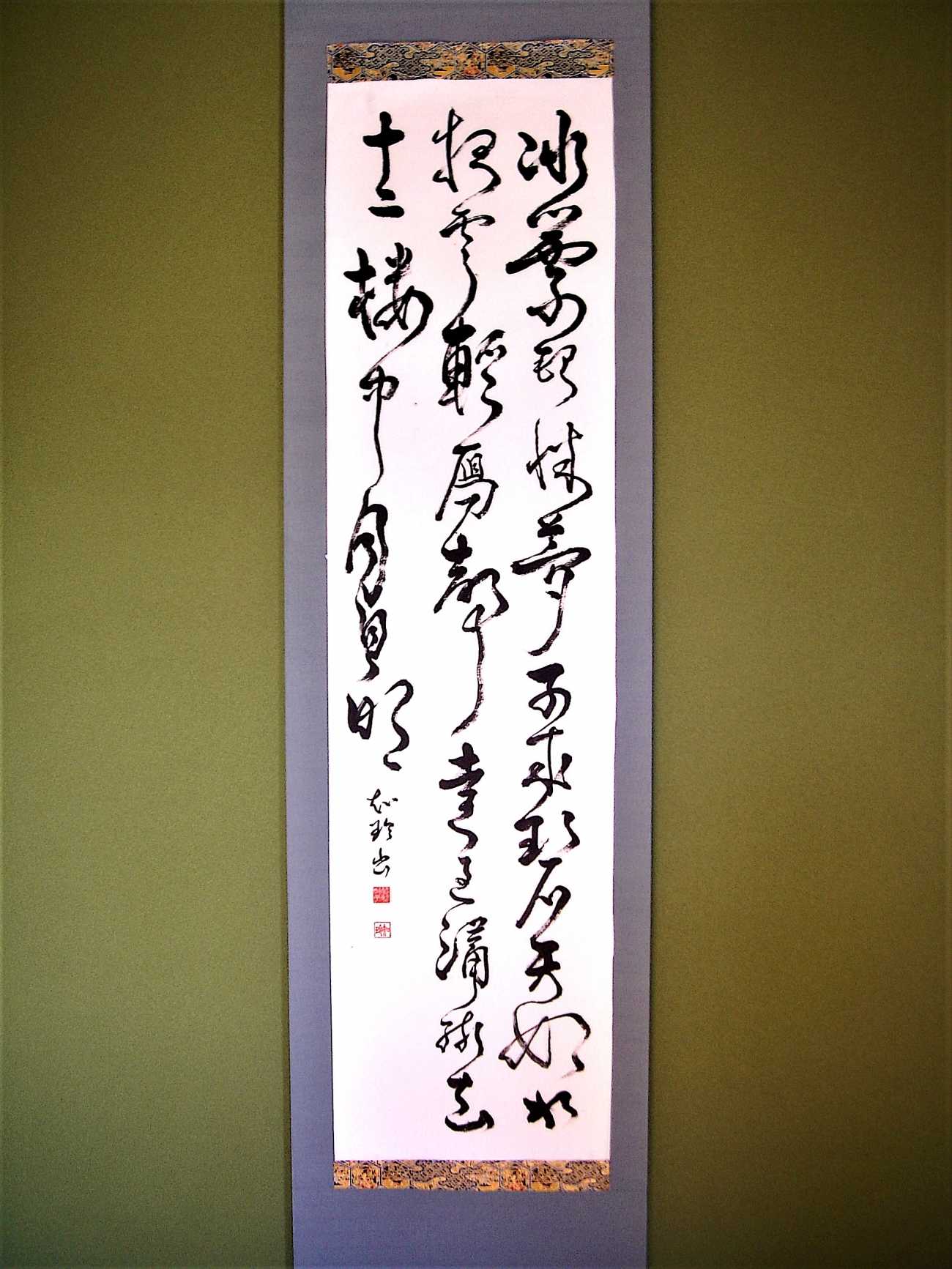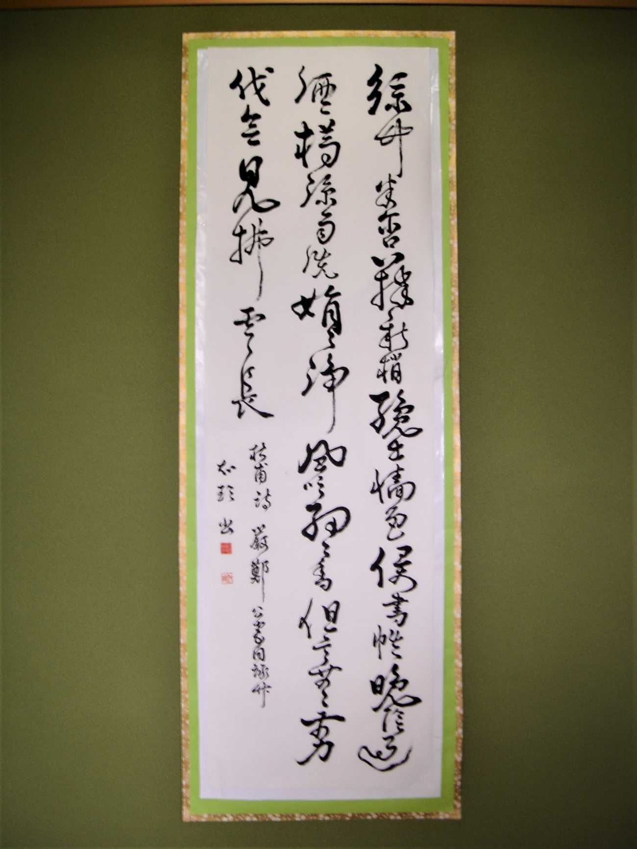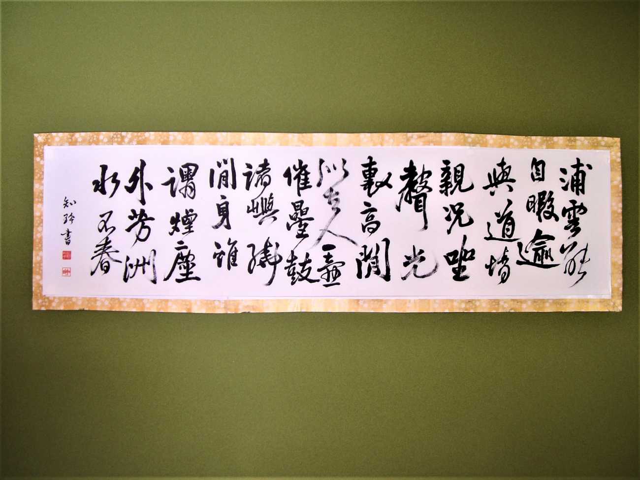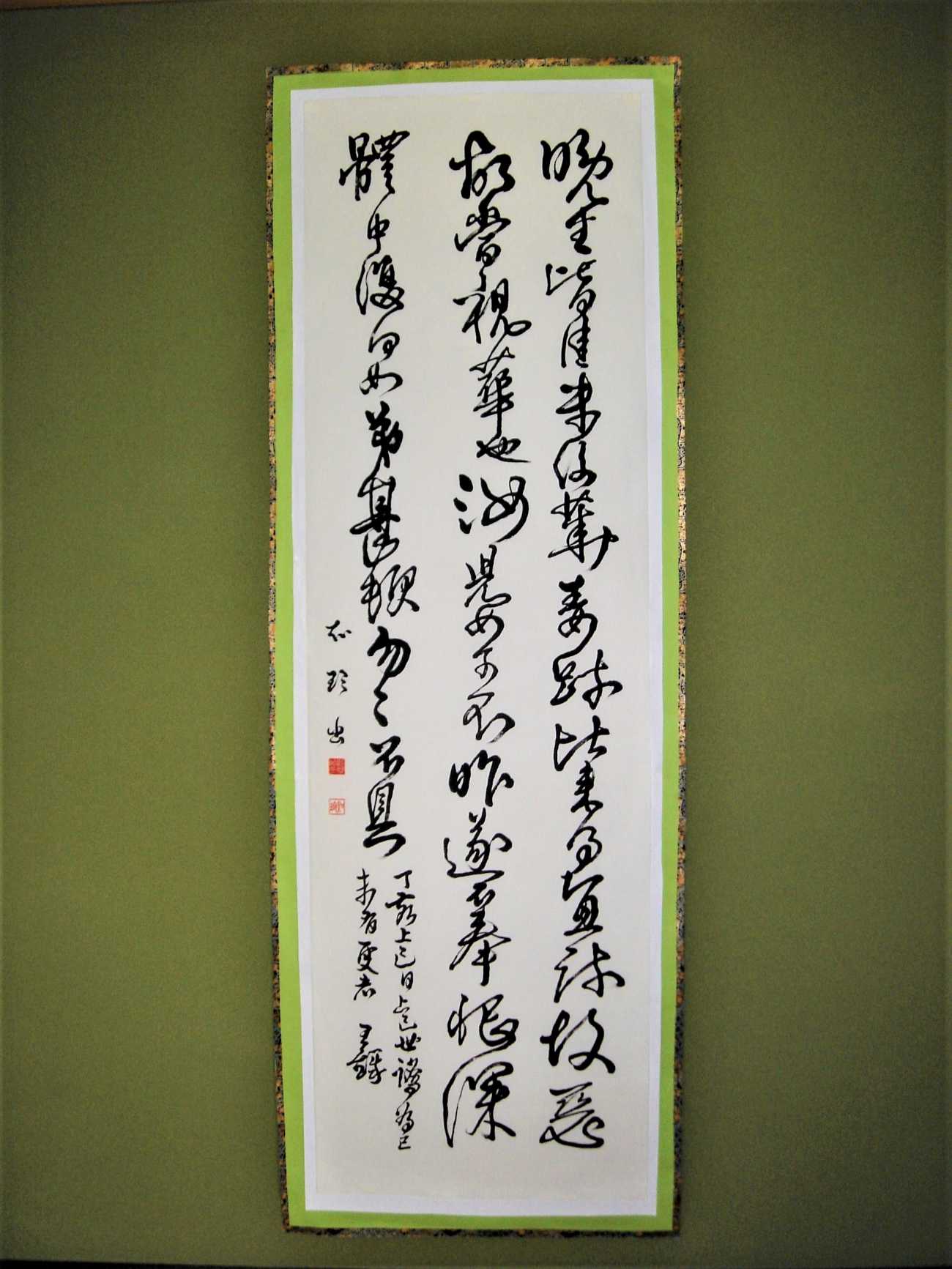 王鐸の書を学ぶにあたって、はじめに臨書にふさわしい書物を探し、条幅作品を選んだのがこの作品である。その中で、文字の大小や連綿など王鐸の書風や特徴を捉え、臨書に取り組んだのである。また、行書、草書のそれぞれの特徴を理解し、臨書していくことも大切にしてきた。次に、倣書により創作作品と進め、ダイナミックな作品を目指したのである。