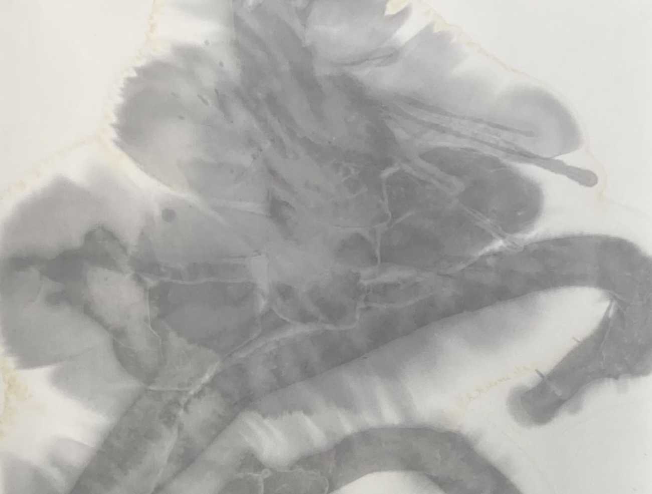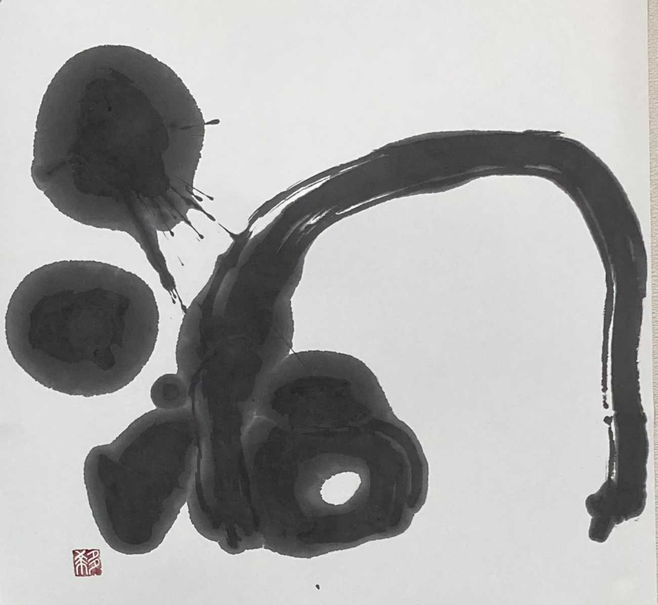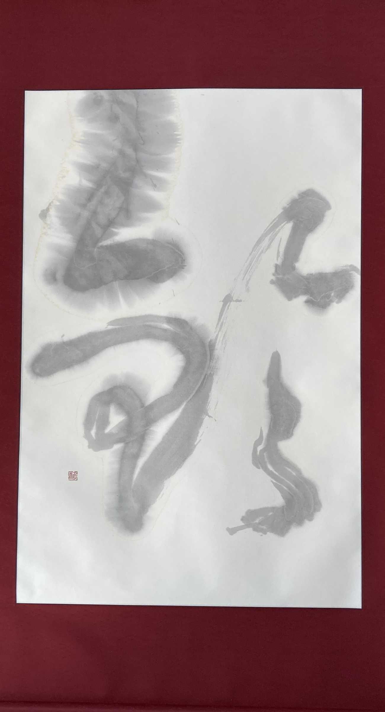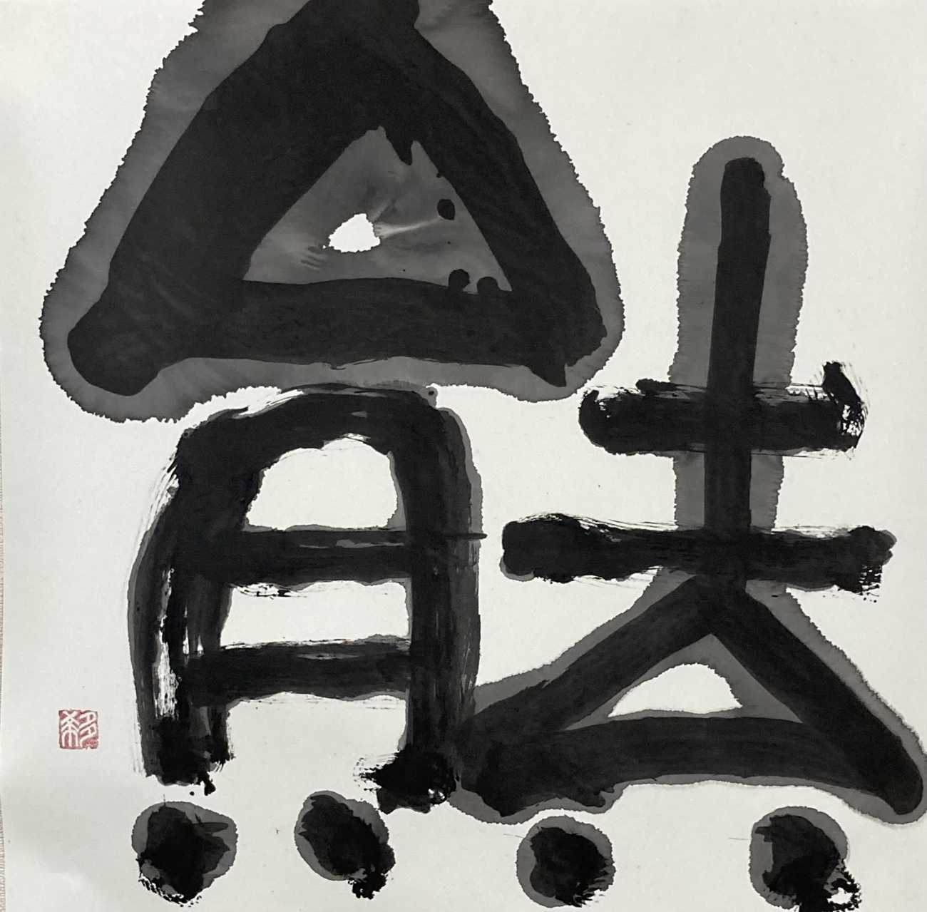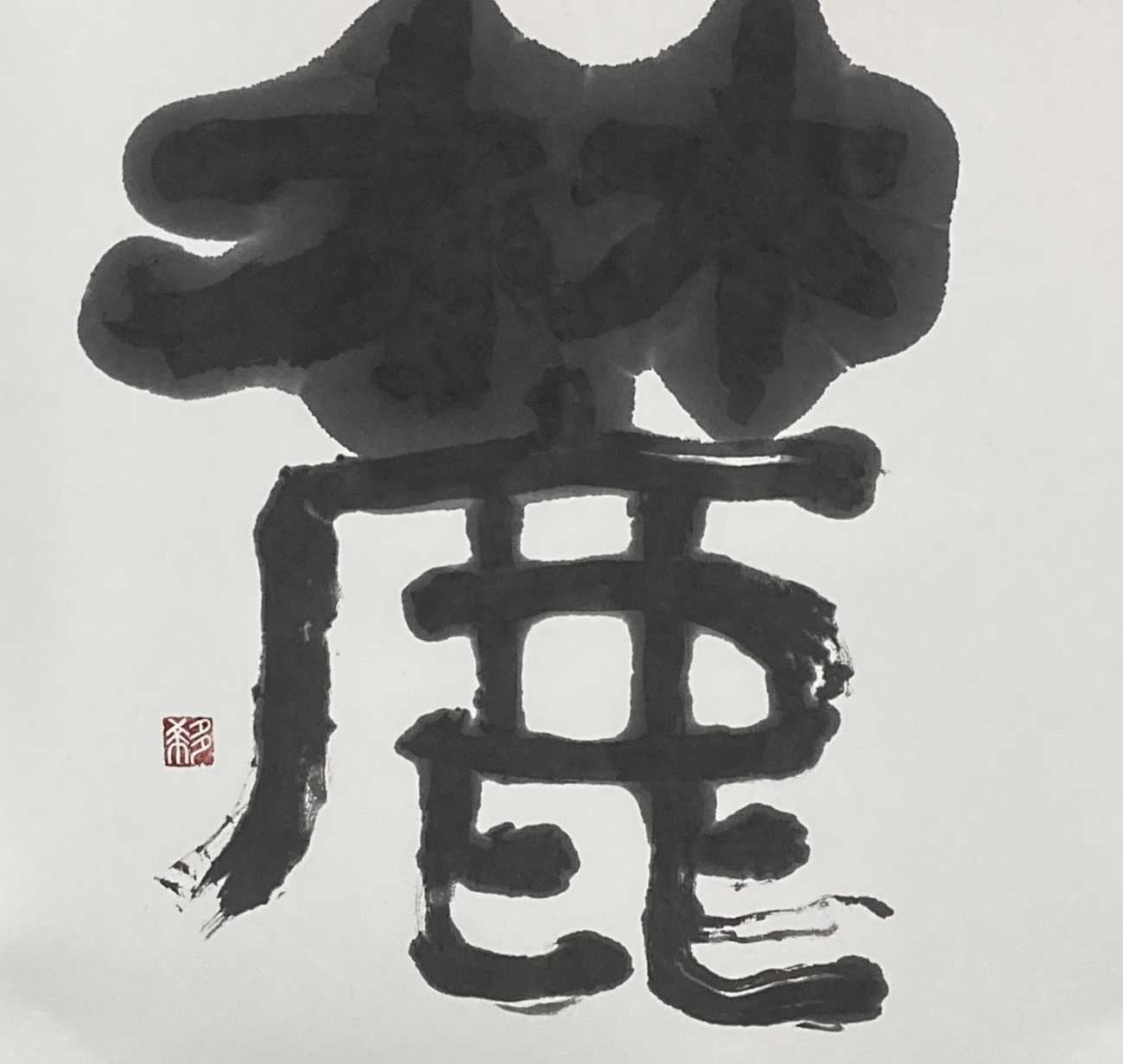 全紙にはみ出すほどに大きく「掌」を作成した。松煙墨を使用してにじみが美しく出るように、墨の濃度や紙を様々に試した。墨はあまり力を入れないように優しく時間をかけて粘りが出るまで磨り上げた後に濃度を調整した。紙に浸透して墨が広がって行く様子を楽しんだ。「口」の部分に白を大きく取り広がりを持たせるように工夫した。